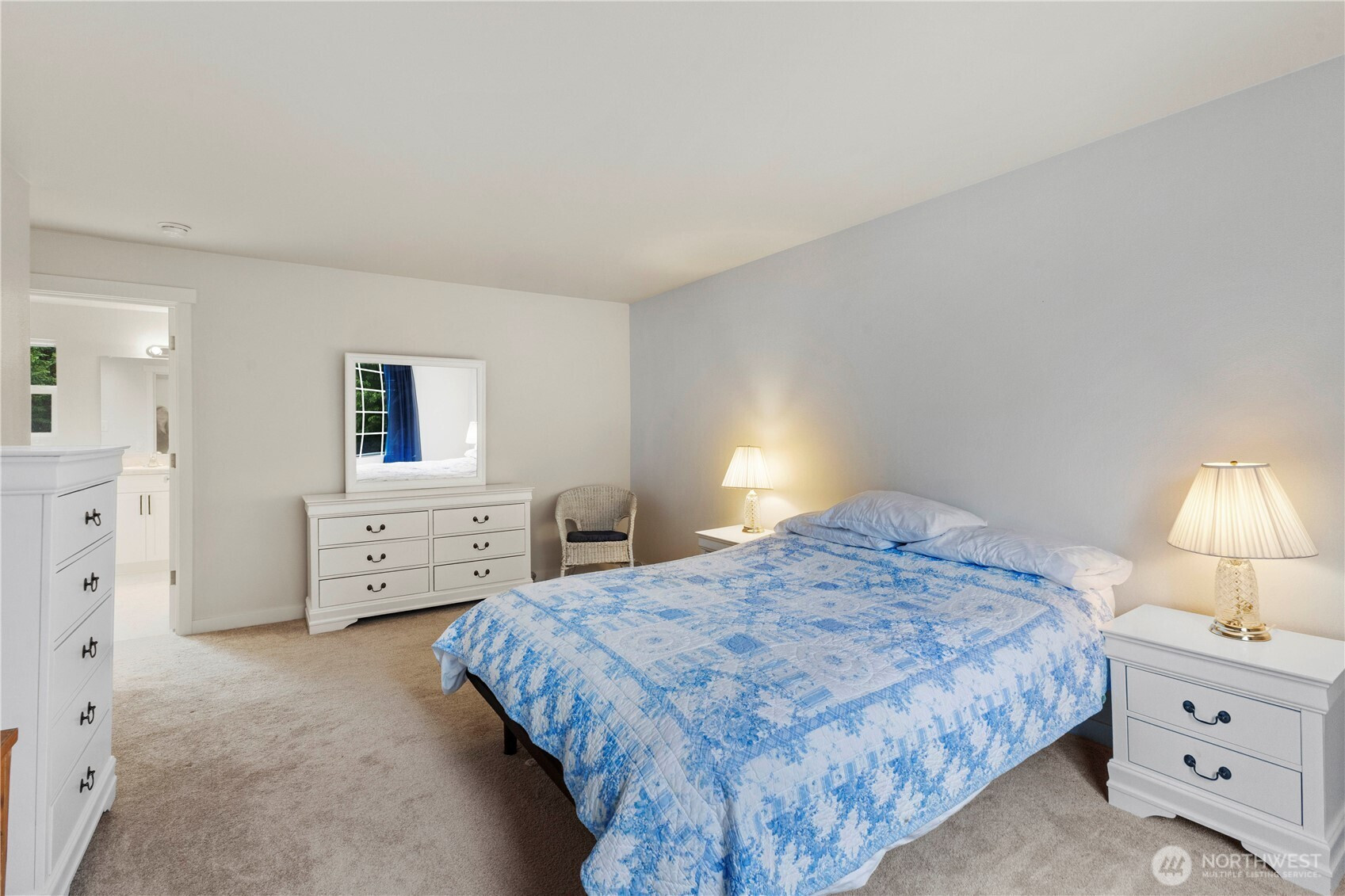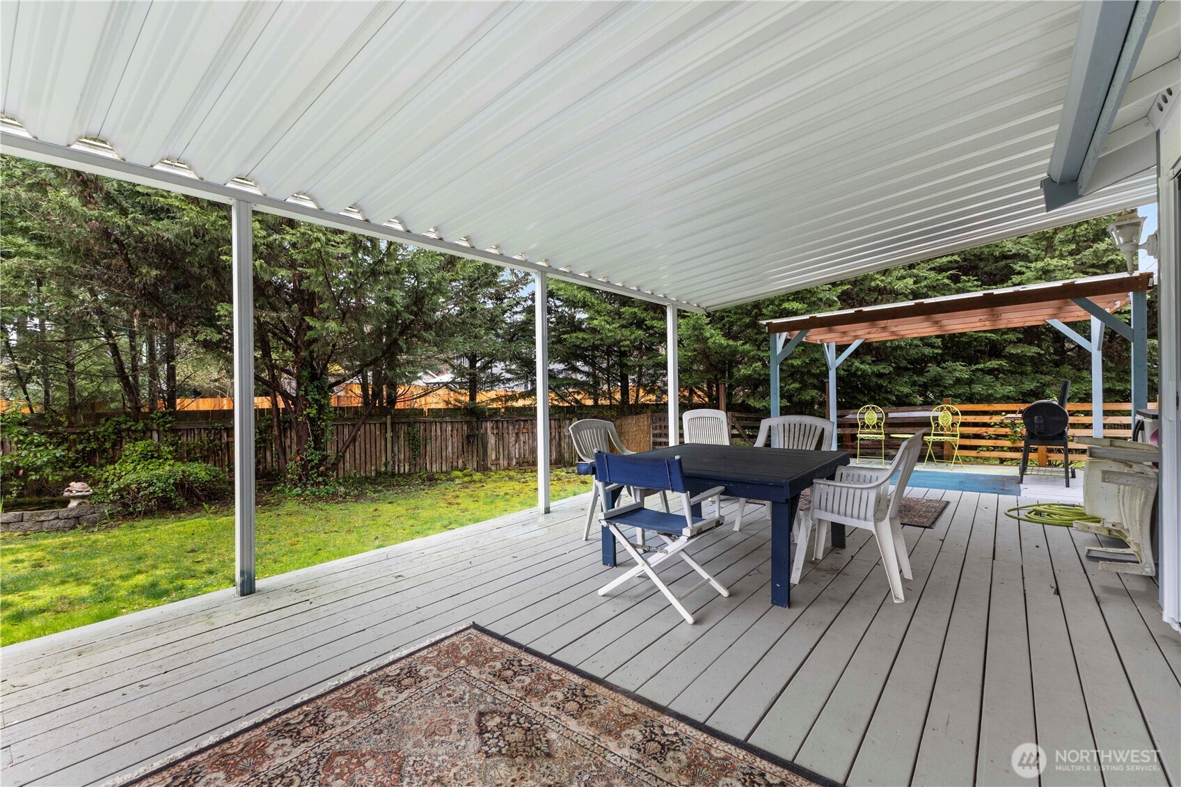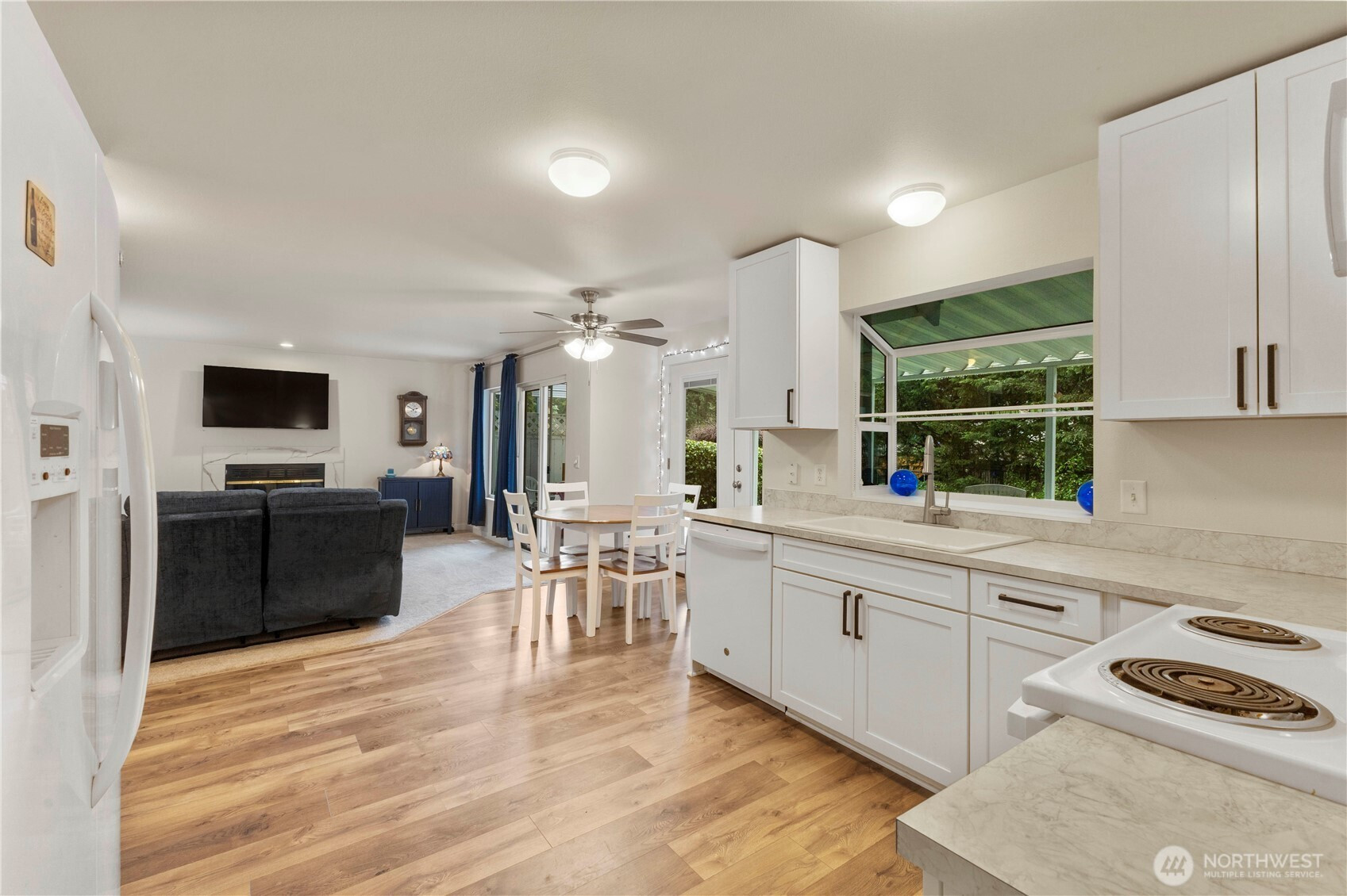 Large 17,193 sq ft lot • 2024 interior remodel • Covered deck • 3 bedrooms + bonus room! Two-story home on a over a third acre lot in Graham with 3 upstairs bedrooms plus a large bonus room and 2,146 sq ft of interior living space. Main level includes a living room, dining and family room with gas fireplace plus an eat-in kitchen. Entire home interior was remodeled in 2024 with new kitchen and bathroom cabinets, all new appliances and with laminate flooring throughout main living spaces, new vinyl flooring in bathrooms and laundry room, and wall-to-wall carpet in all upstairs living areas. Kitchen and living areas connect to a large covered deck overlooking the fully fenced backyard, providing outdoor space and room for yard use. Attached three-car garage with driveway parking and wired for a generator. Located on a quiet, dead end street with convenient access to Meridian Ave E retail and services.