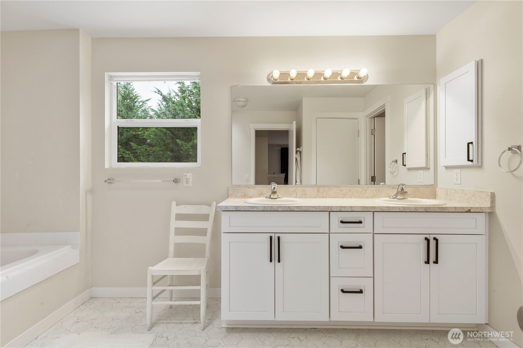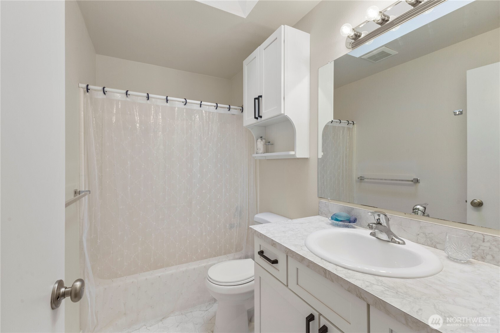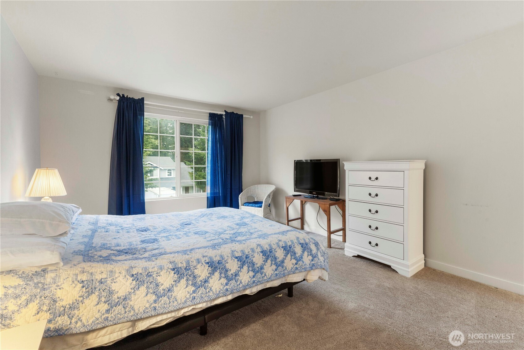Large 17,193 sq ft lot • 2024 interior remodel • Covered deck • 3 bedrooms + bonus room! Two-story home on a over a third acre lot in Graham with 3 upstairs bedrooms plus a large bonus room and 2,146 sq ft of interior living space. Main level includes a living room, dining and family room with gas fireplace plus an eat-in kitchen. Entire home interior was remodeled in 2024 with new kitchen and bathroom cabinets, all new appliances and with laminate flooring throughout main living spaces, new vinyl flooring in bathrooms and laundry room, and wall-to-wall carpet in all upstairs living areas. Kitchen and living areas connect to a large covered deck overlooking the fully fenced backyard, providing outdoor space and room for yard use. Attached three-car garage with driveway parking and wired for a generator. Located on a quiet, dead end street with convenient access to Meridian Ave E retail and services.