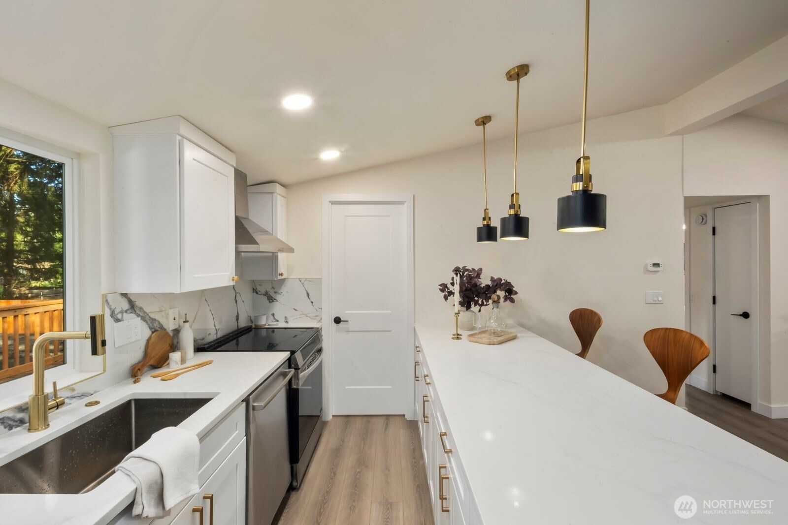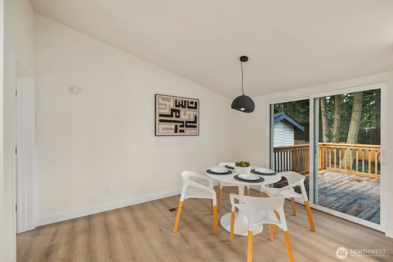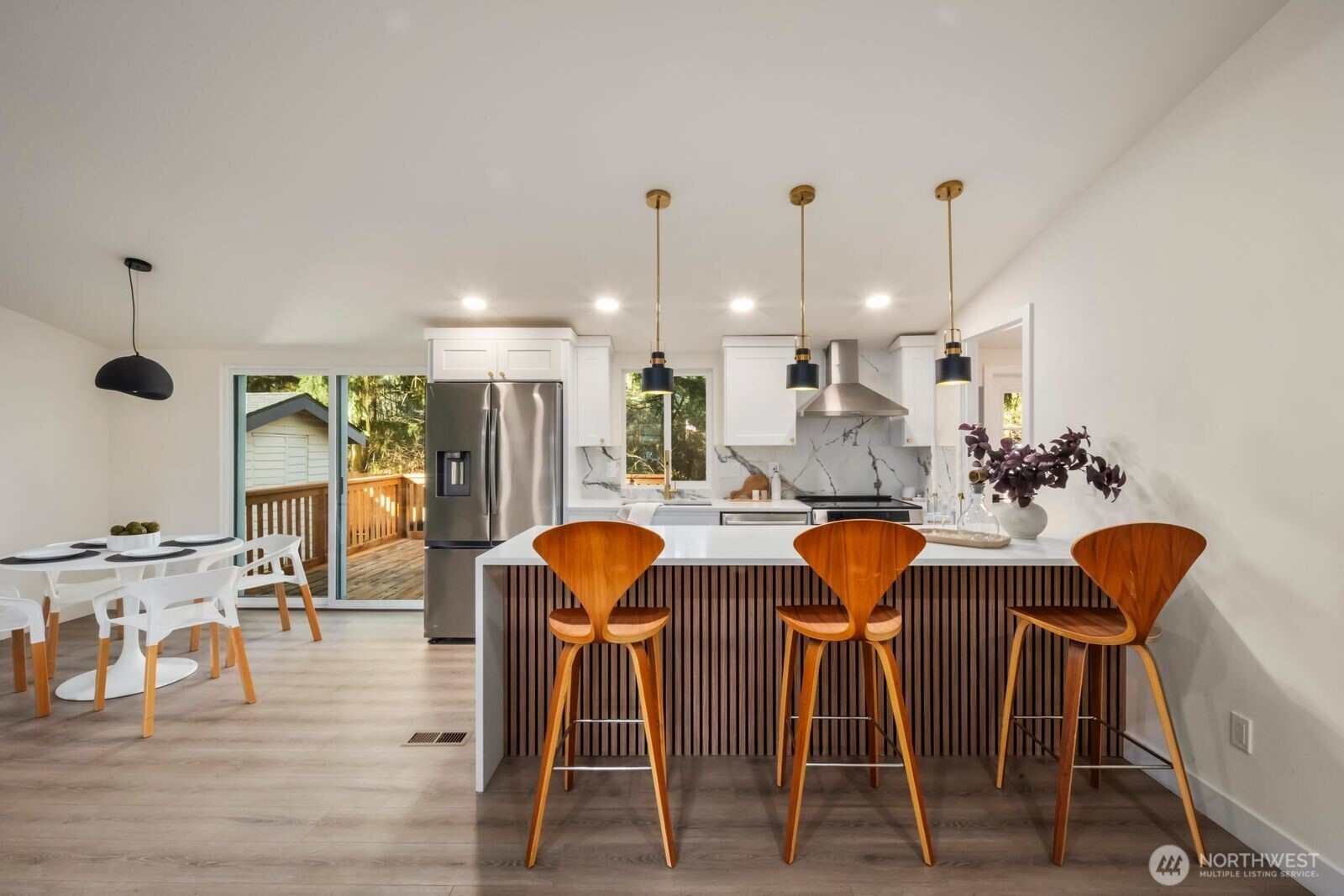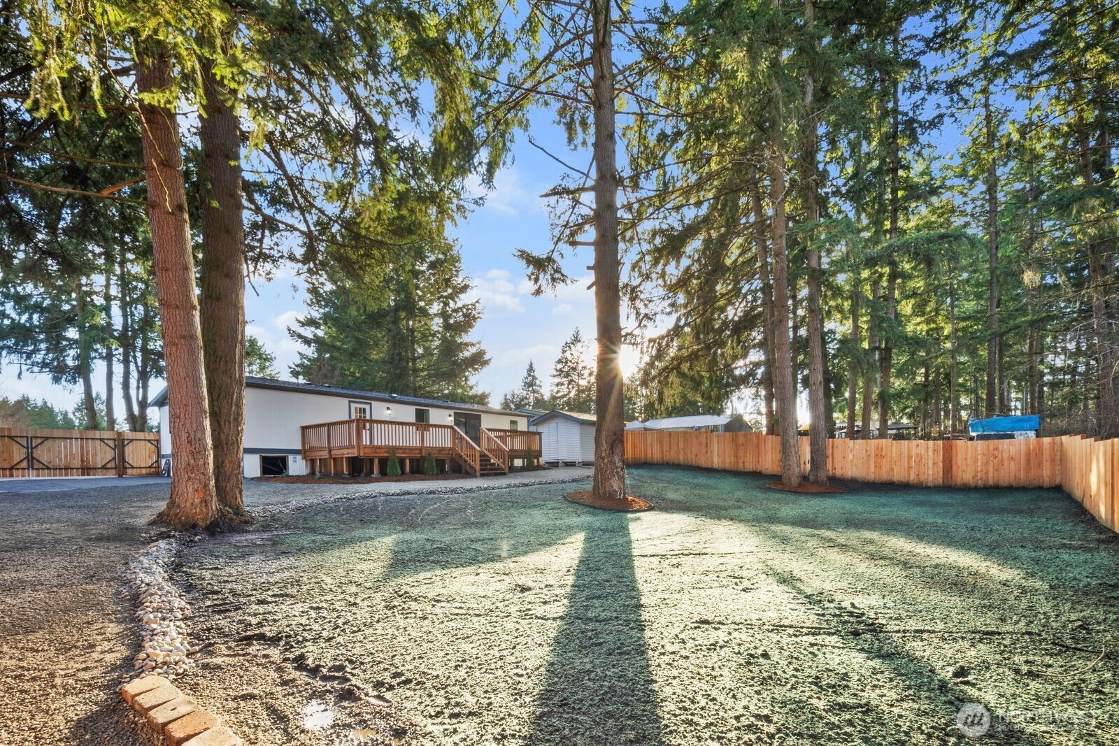 Fully reimagined and finished with intention, this beautifully remodeled 3 bed, 2 bath, 1,291 SF home rests on a private 0.29-acre lot framed by mature evergreens. A long driveway creates a striking approach and leads to gated access that opens for additional parking in the rear—ideal for guests, recreational vehicles, or added flexibility. Inside, vaulted ceilings enhance the open-concept design, filling the home with natural light and an airy, expansive feel. The kitchen is thoughtfully curated with high-end finishes, sleek cabinetry, stainless appliances, and a statement island designed for both everyday living and effortless entertaining. Wide-plank flooring flows throughout the main living areas, complemented by modern lighting and refined details at every turn. The primary suite offers a spa-inspired bath with elevated fixtures and clean, contemporary lines. Two additional bedrooms provide versatility for office, guests, or creative space. Step outside to the generous deck overlooking the fully fenced yard—private, peaceful, and ready for gatherings. A rare blend of thoughtful design, premium finishes, and usable outdoor space, all set on nearly a third of an acre.