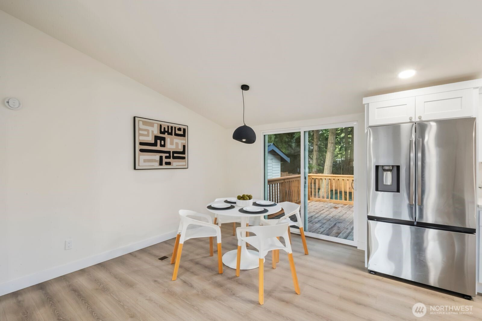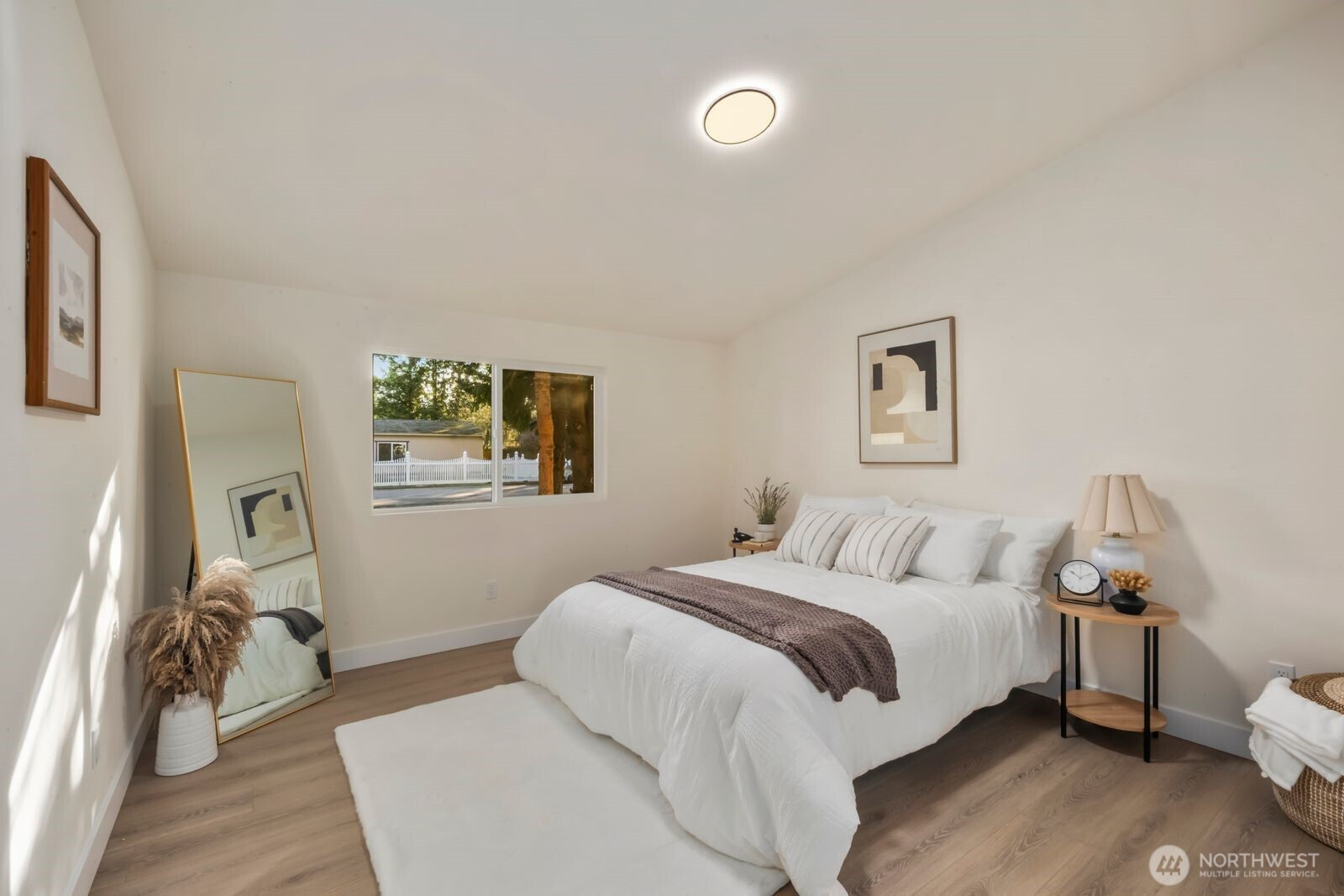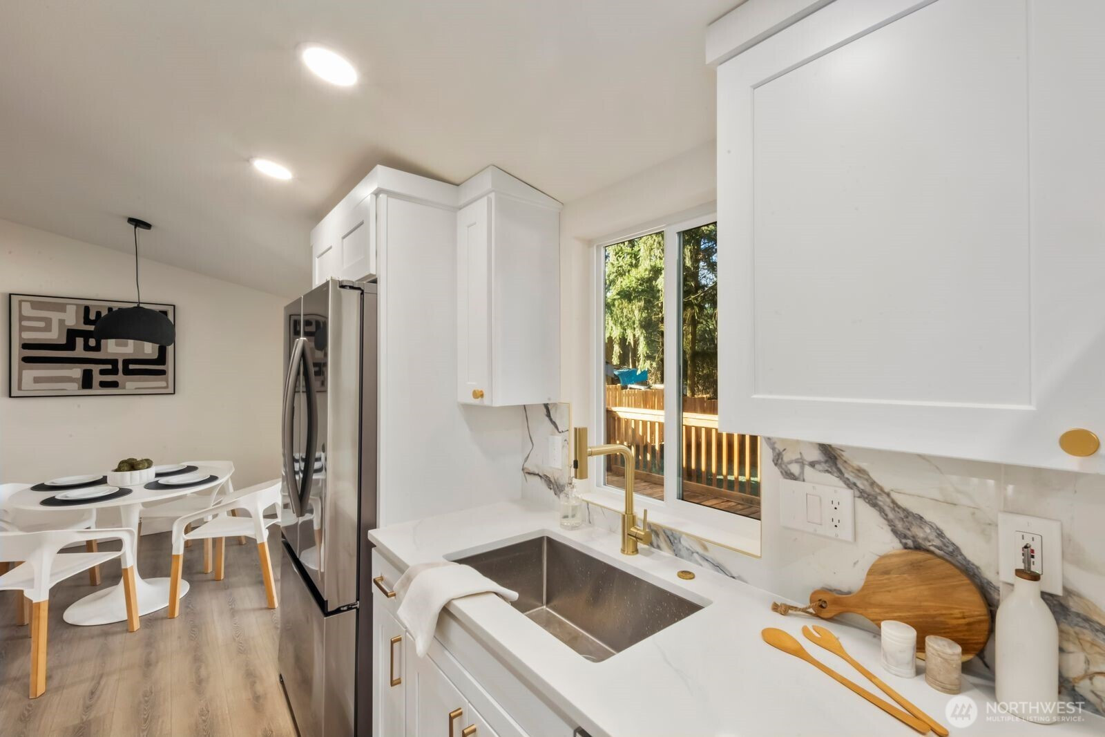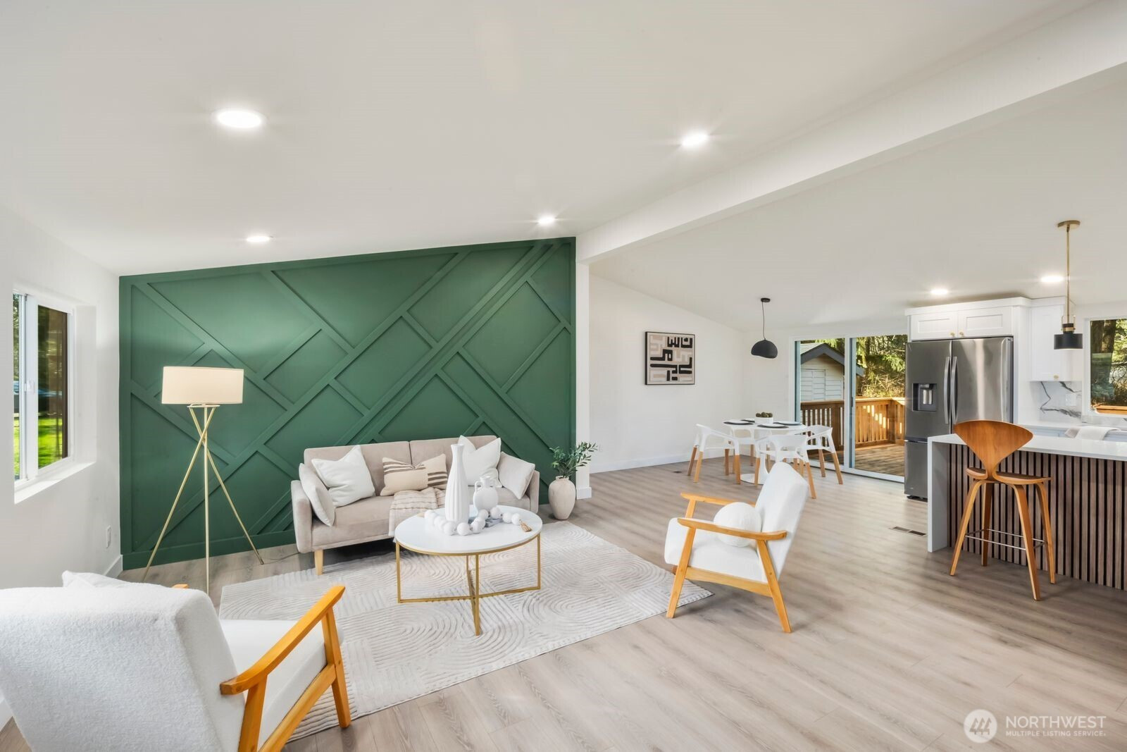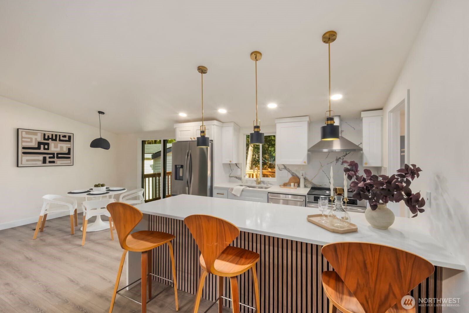 Fully reimagined and finished with intention, this beautifully remodeled 3 bed, 2 bath, 1,291 SF home rests on a private 0.29-acre lot framed by mature evergreens. A long driveway creates a striking approach and leads to gated access that opens for additional parking in the rear—ideal for guests, recreational vehicles, or added flexibility. Inside, vaulted ceilings enhance the open-concept design, filling the home with natural light and an airy, expansive feel. The kitchen is thoughtfully curated with high-end finishes, sleek cabinetry, stainless appliances, and a statement island designed for both everyday living and effortless entertaining. Wide-plank flooring flows throughout the main living areas, complemented by modern lighting and refined details at every turn. The primary suite offers a spa-inspired bath with elevated fixtures and clean, contemporary lines. Two additional bedrooms provide versatility for office, guests, or creative space. Step outside to the generous deck overlooking the fully fenced yard—private, peaceful, and ready for gatherings. A rare blend of thoughtful design, premium finishes, and usable outdoor space, all set on nearly a third of an acre.