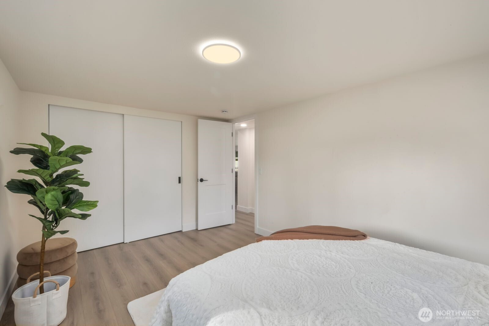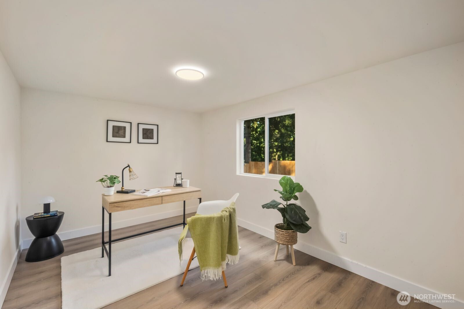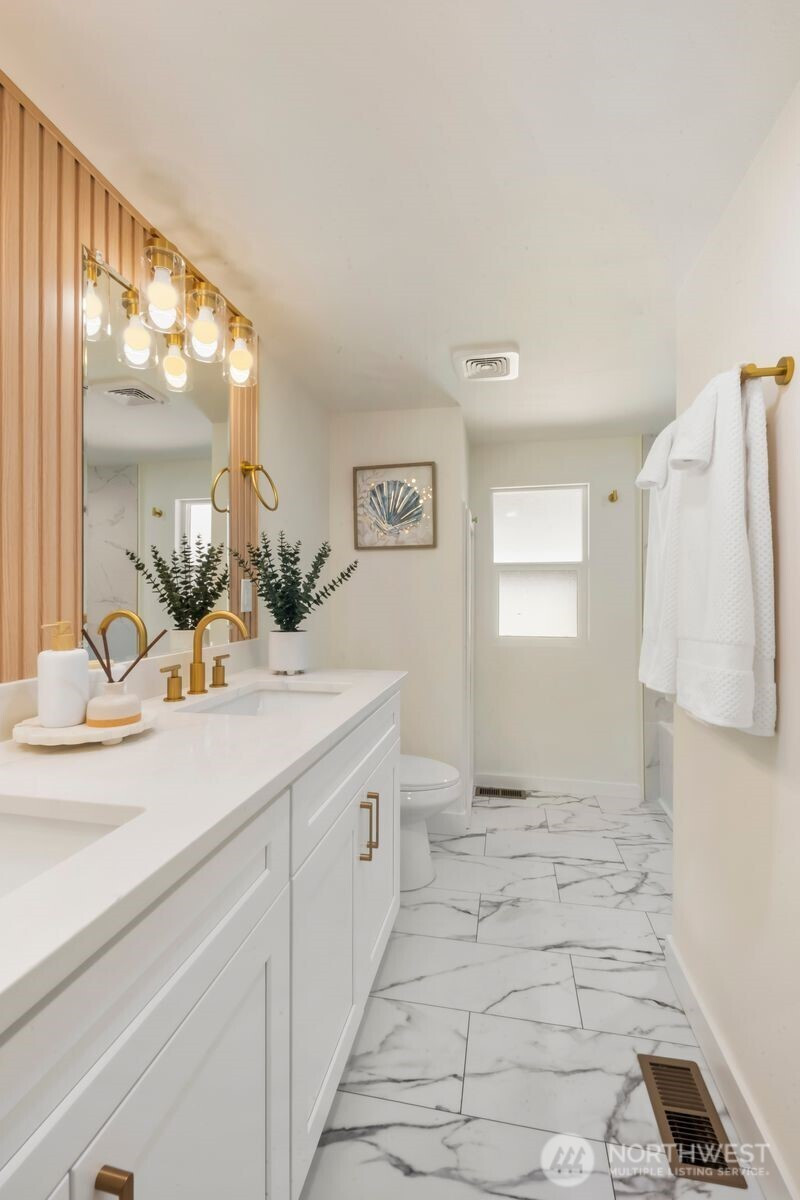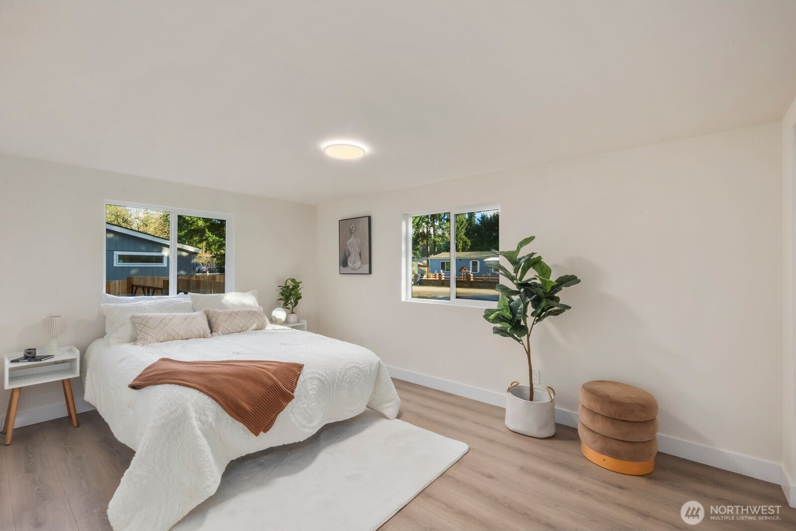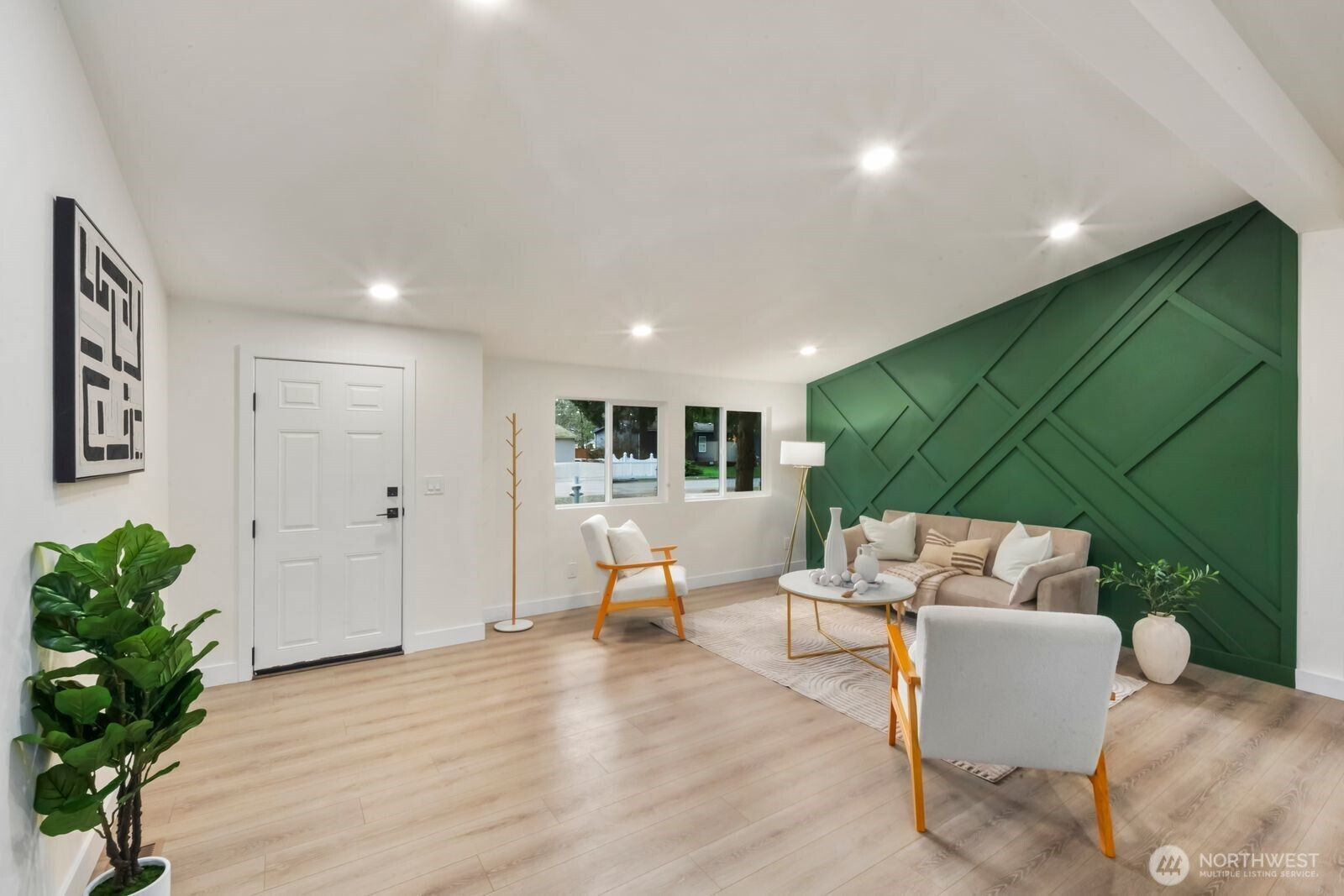 Fully reimagined and finished with intention, this beautifully remodeled 3 bed, 2 bath, 1,291 SF home rests on a private 0.29-acre lot framed by mature evergreens. A long driveway creates a striking approach and leads to gated access that opens for additional parking in the rear—ideal for guests, recreational vehicles, or added flexibility. Inside, vaulted ceilings enhance the open-concept design, filling the home with natural light and an airy, expansive feel. The kitchen is thoughtfully curated with high-end finishes, sleek cabinetry, stainless appliances, and a statement island designed for both everyday living and effortless entertaining. Wide-plank flooring flows throughout the main living areas, complemented by modern lighting and refined details at every turn. The primary suite offers a spa-inspired bath with elevated fixtures and clean, contemporary lines. Two additional bedrooms provide versatility for office, guests, or creative space. Step outside to the generous deck overlooking the fully fenced yard—private, peaceful, and ready for gatherings. A rare blend of thoughtful design, premium finishes, and usable outdoor space, all set on nearly a third of an acre.
