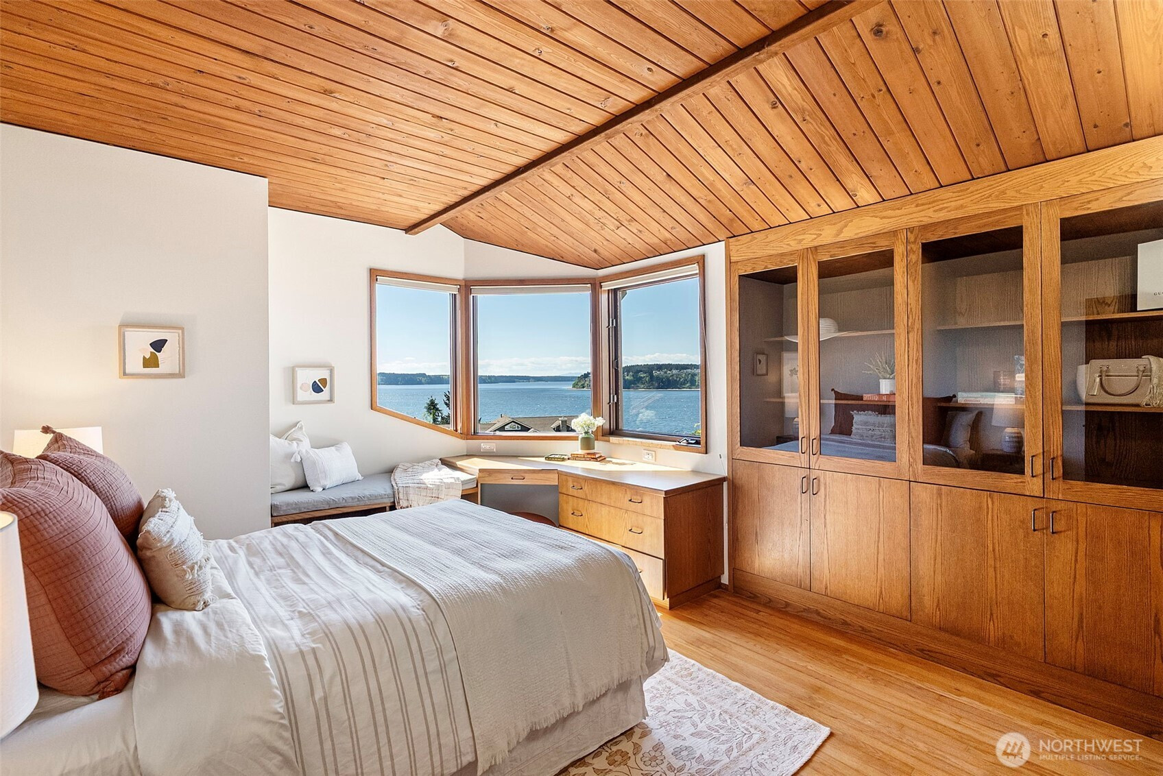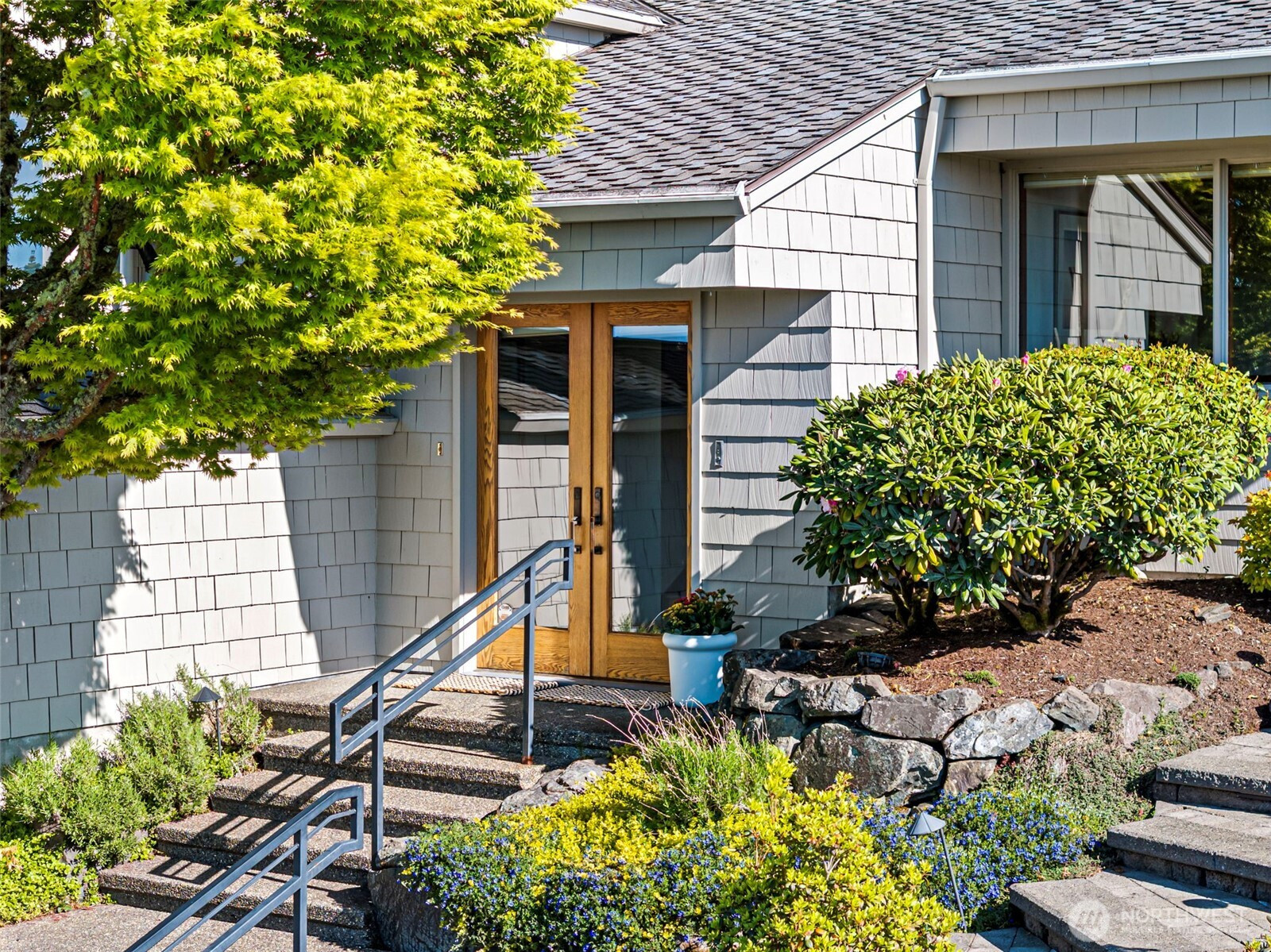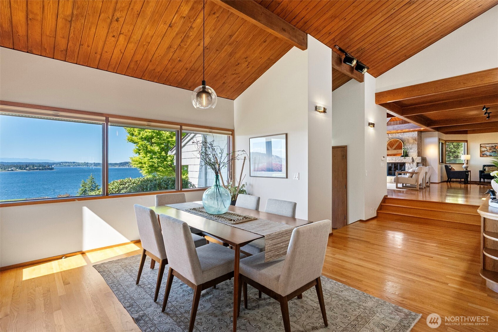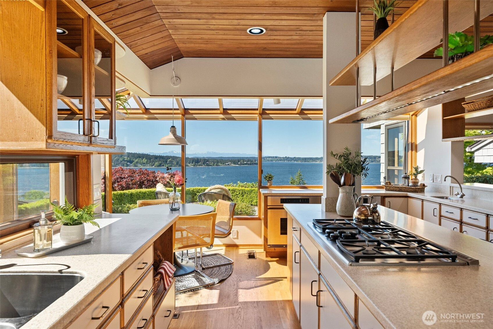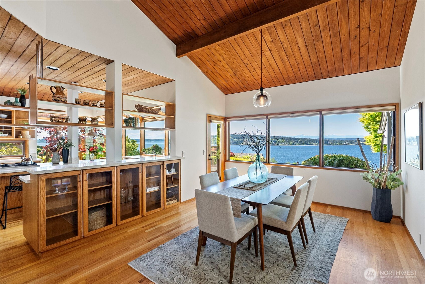 The Wagonfeld residence, an AIA award-winning design by renowned modernist architects Alan Liddle and Robert Jacklin, is positioned high on a bluff with sweeping views across Fox and McNeil Islands, Gig Harbor, Hale Passage, and the Olympic Mountains. A recorded view covenant ensures these vistas are yours forever. Vaulted tongue-and-groove pine ceilings, trestle beams, custom oak cabinetry, hardwood floors, and walls of glass define an interior built without compromise. A granite fireplace anchors the main living area, which has access to a view deck. Dining room, kitchen, a den with custom shelving, a bedroom and guest bath complete the main level. The kitchen features euro-style cabinetry, Corian counters, SubZero refrigerator, dual Dacor ovens, Bosch dishwasher, walk-in pantry, and breakfast nook opening to a front view patio. The formal dining room offers a wall of windows and French door to the patio. The primary suite is a private retreat with a wood-burning stove, custom walk-in closet, soaking tub, shower room and door opening to the rear gardens. Two additional upstairs bedrooms feature built ins. The lower level family room — with shoji screen panels, wet bar, and bath with shower — adapts easily to a guest suite or apartment. Outside, mature specimen trees frame the views, with raised planting beds, deer-proof fencing, and a tranquility garden with winding paths and built-in seating. This is a truly rare convergence of architecture, views, and landscape.