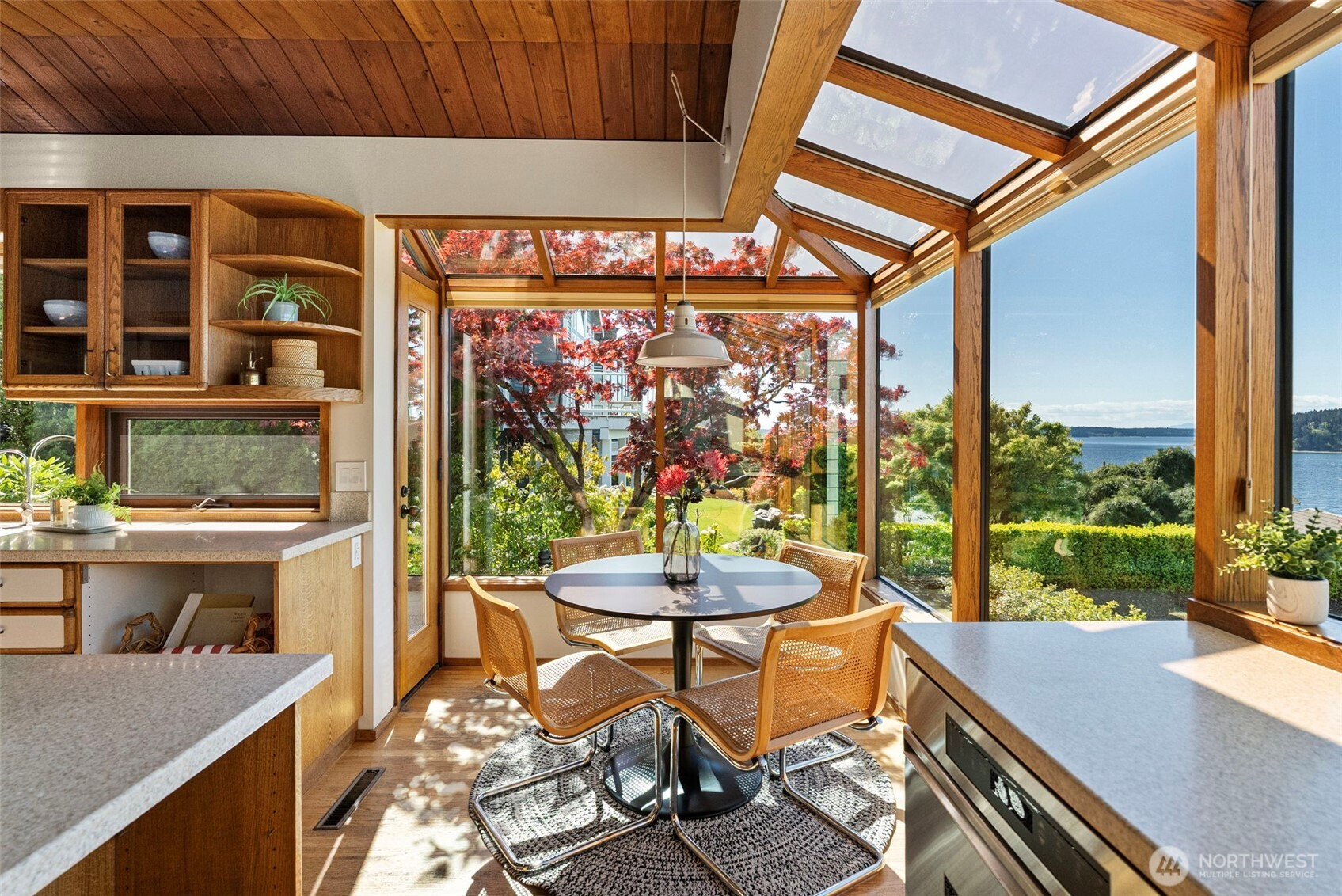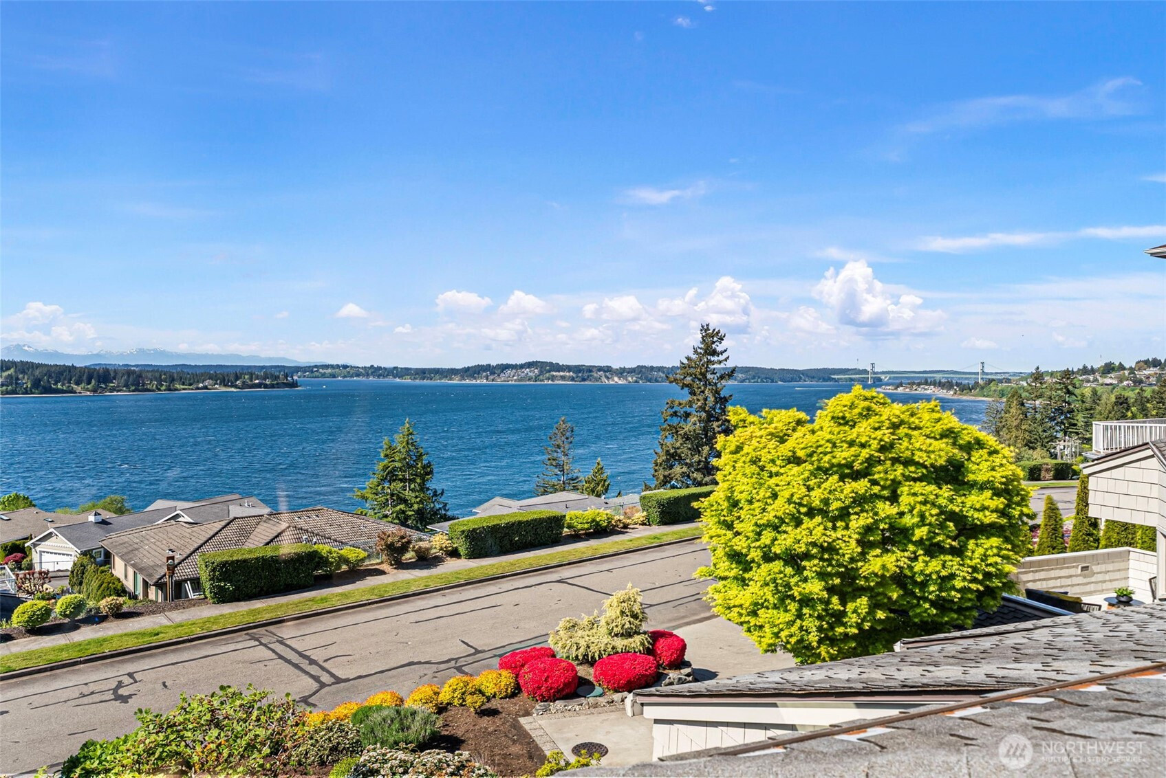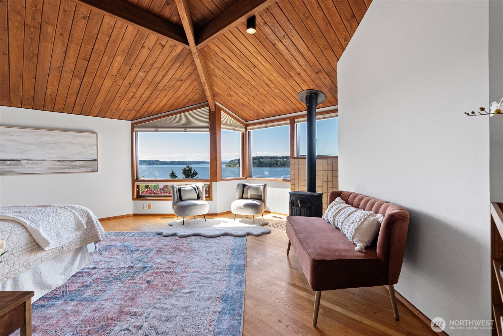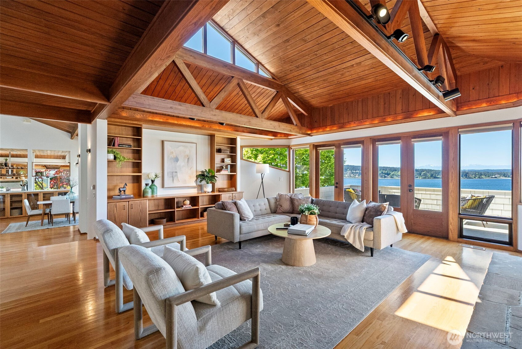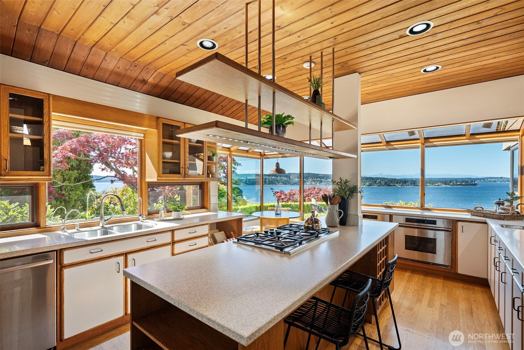 The Wagonfeld residence, an AIA award-winning design by renowned modernist architects Alan Liddle and Robert Jacklin, is positioned high on a bluff with sweeping views across Fox and McNeil Islands, Gig Harbor, Hale Passage, and the Olympic Mountains. A recorded view covenant ensures these vistas are yours forever. Vaulted tongue-and-groove pine ceilings, trestle beams, custom oak cabinetry, hardwood floors, and walls of glass define an interior built without compromise. A granite fireplace anchors the main living area, which has access to a view deck. Dining room, kitchen, a den with custom shelving, a bedroom and guest bath complete the main level. The kitchen features euro-style cabinetry, Corian counters, SubZero refrigerator, dual Dacor ovens, Bosch dishwasher, walk-in pantry, and breakfast nook opening to a front view patio. The formal dining room offers a wall of windows and French door to the patio. The primary suite is a private retreat with a wood-burning stove, custom walk-in closet, soaking tub, shower room and door opening to the rear gardens. Two additional upstairs bedrooms feature built ins. The lower level family room — with shoji screen panels, wet bar, and bath with shower — adapts easily to a guest suite or apartment. Outside, mature specimen trees frame the views, with raised planting beds, deer-proof fencing, and a tranquility garden with winding paths and built-in seating. This is a truly rare convergence of architecture, views, and landscape.