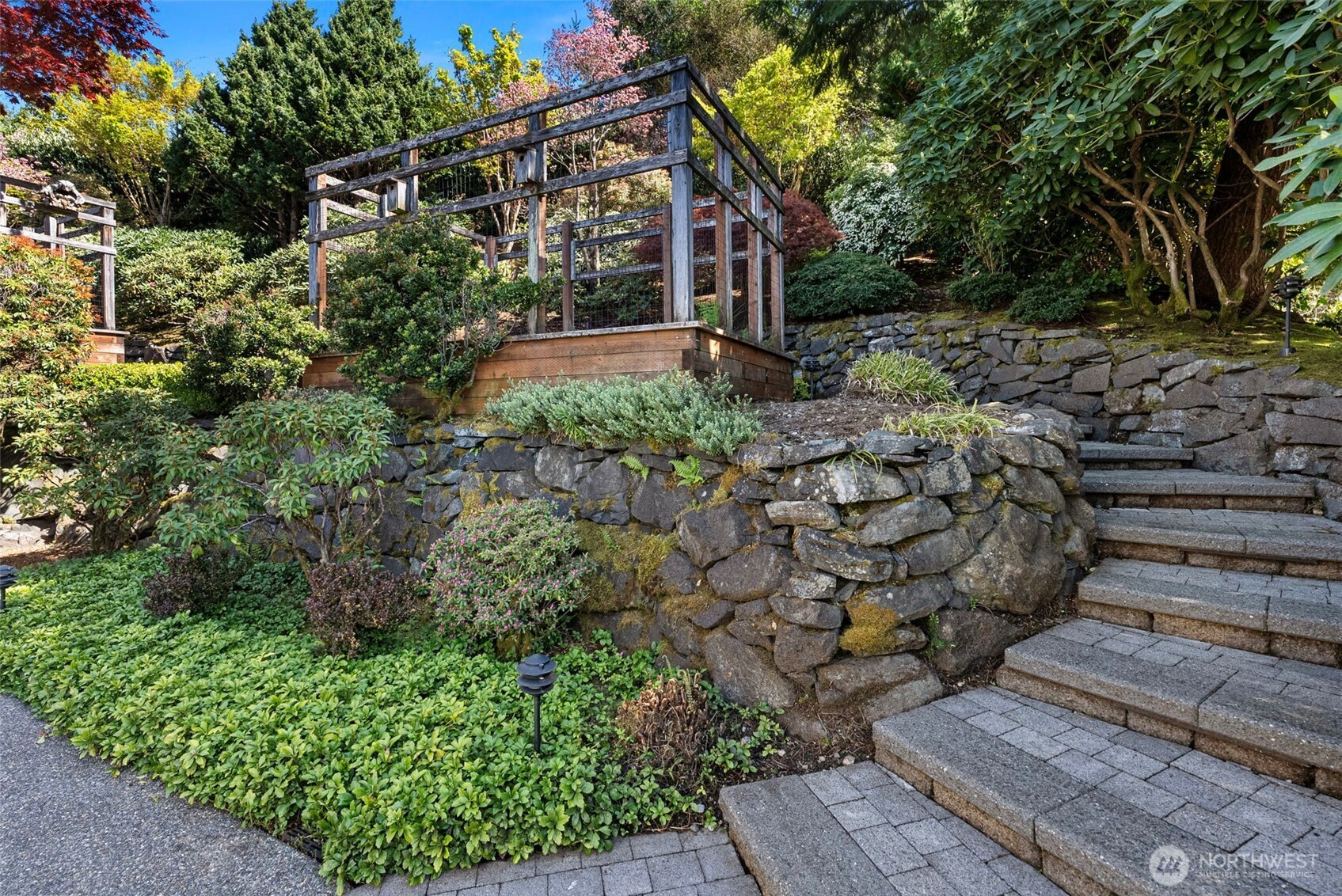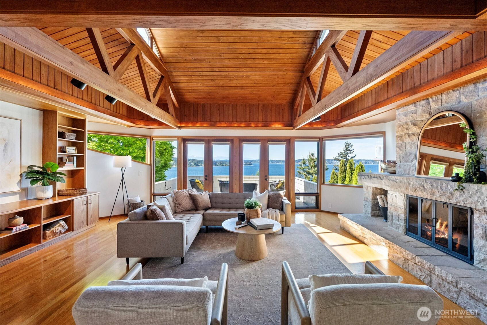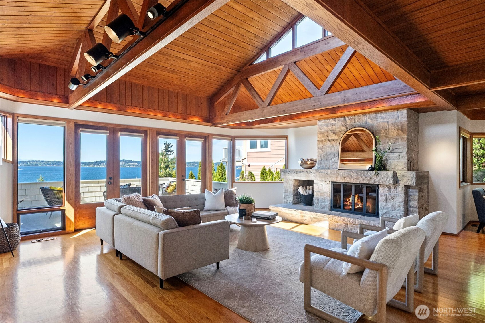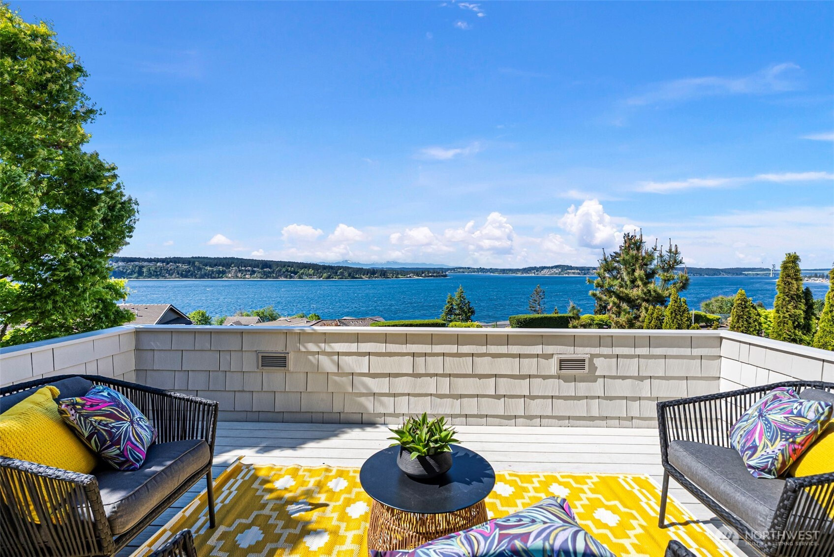 The Wagonfeld residence, an AIA award-winning design by renowned modernist architects Alan Liddle and Robert Jacklin, is positioned high on a bluff with sweeping views across Fox and McNeil Islands, Gig Harbor, Hale Passage, and the Olympic Mountains. A recorded view covenant ensures these vistas are yours forever. Vaulted tongue-and-groove pine ceilings, trestle beams, custom oak cabinetry, hardwood floors, and walls of glass define an interior built without compromise. A granite fireplace anchors the main living area, which has access to a view deck. Dining room, kitchen, a den with custom shelving, a bedroom and guest bath complete the main level. The kitchen features euro-style cabinetry, Corian counters, SubZero refrigerator, dual Dacor ovens, Bosch dishwasher, walk-in pantry, and breakfast nook opening to a front view patio. The formal dining room offers a wall of windows and French door to the patio. The primary suite is a private retreat with a wood-burning stove, custom walk-in closet, soaking tub, shower room and door opening to the rear gardens. Two additional upstairs bedrooms feature built ins. The lower level family room — with shoji screen panels, wet bar, and bath with shower — adapts easily to a guest suite or apartment. Outside, mature specimen trees frame the views, with raised planting beds, deer-proof fencing, and a tranquility garden with winding paths and built-in seating. This is a truly rare convergence of architecture, views, and landscape.