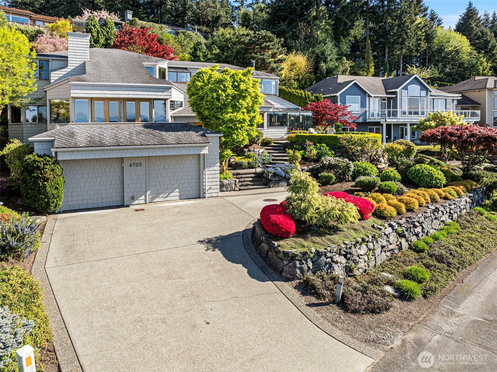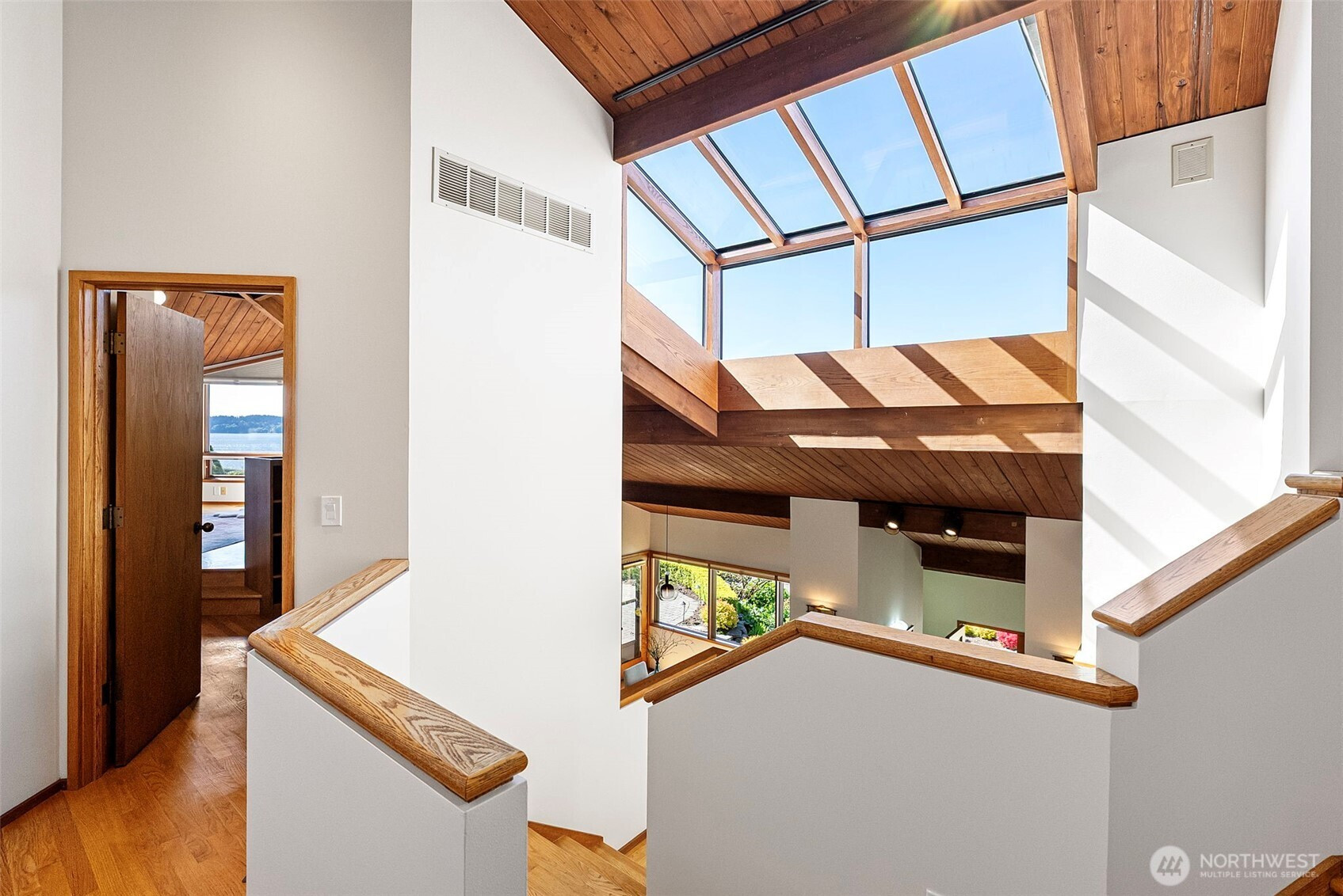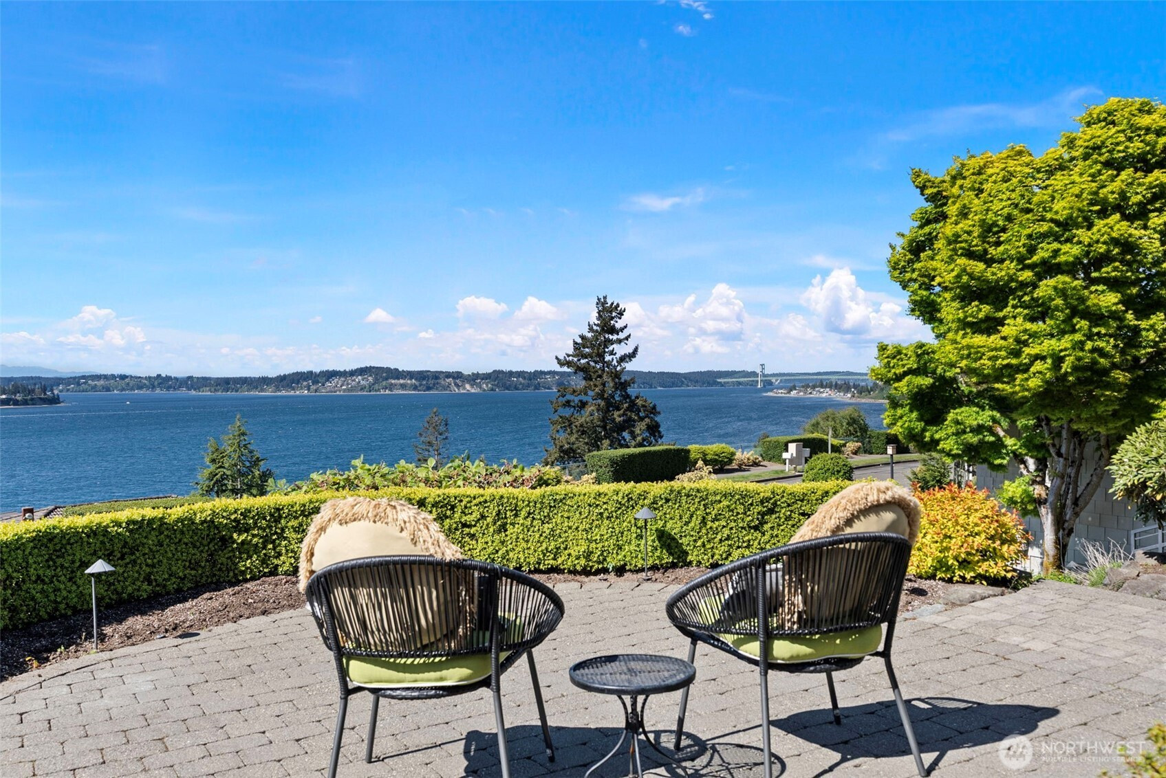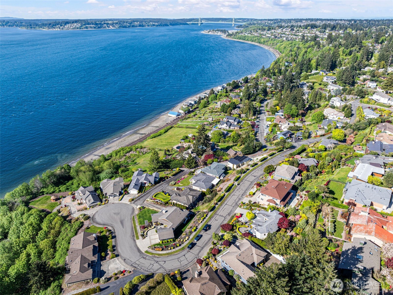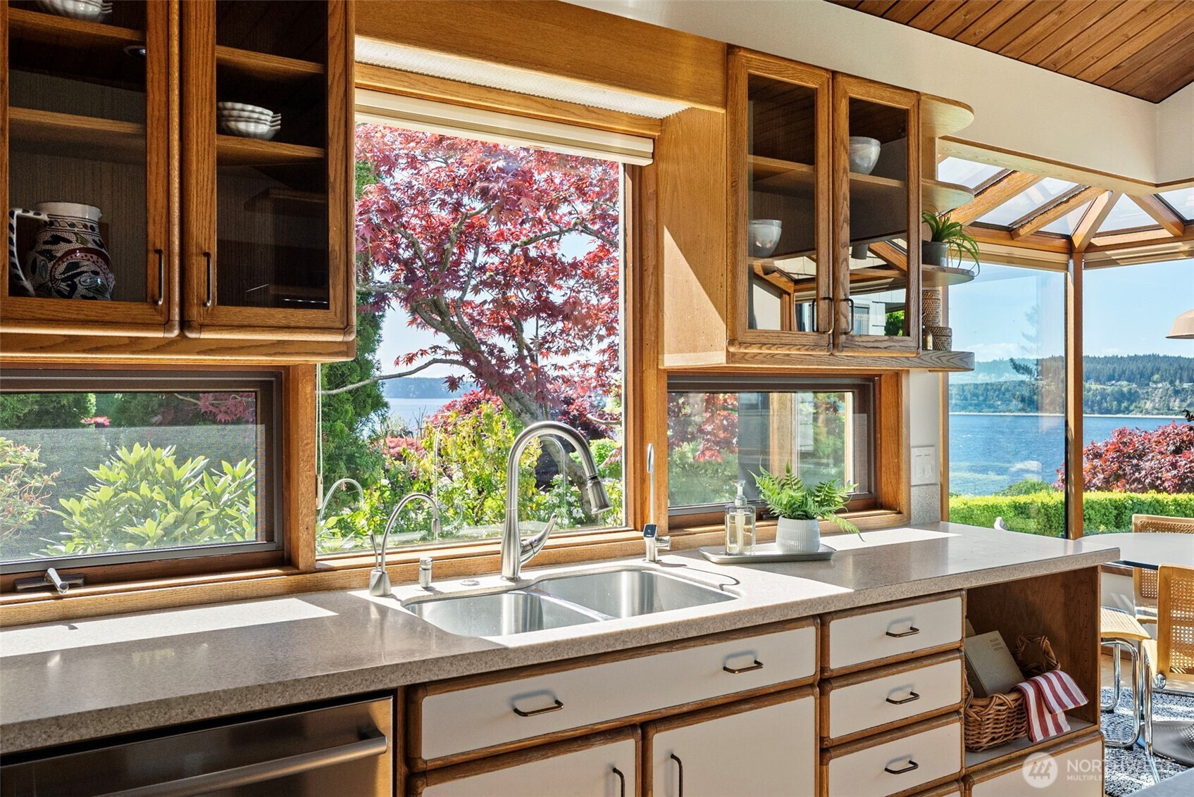 The Wagonfeld residence, an AIA award-winning design by renowned modernist architects Alan Liddle and Robert Jacklin, is positioned high on a bluff with sweeping views across Fox and McNeil Islands, Gig Harbor, Hale Passage, and the Olympic Mountains. A recorded view covenant ensures these vistas are yours forever. Vaulted tongue-and-groove pine ceilings, trestle beams, custom oak cabinetry, hardwood floors, and walls of glass define an interior built without compromise. A granite fireplace anchors the main living area, which has access to a view deck. Dining room, kitchen, a den with custom shelving, a bedroom and guest bath complete the main level. The kitchen features euro-style cabinetry, Corian counters, SubZero refrigerator, dual Dacor ovens, Bosch dishwasher, walk-in pantry, and breakfast nook opening to a front view patio. The formal dining room offers a wall of windows and French door to the patio. The primary suite is a private retreat with a wood-burning stove, custom walk-in closet, soaking tub, shower room and door opening to the rear gardens. Two additional upstairs bedrooms feature built ins. The lower level family room — with shoji screen panels, wet bar, and bath with shower — adapts easily to a guest suite or apartment. Outside, mature specimen trees frame the views, with raised planting beds, deer-proof fencing, and a tranquility garden with winding paths and built-in seating. This is a truly rare convergence of architecture, views, and landscape.