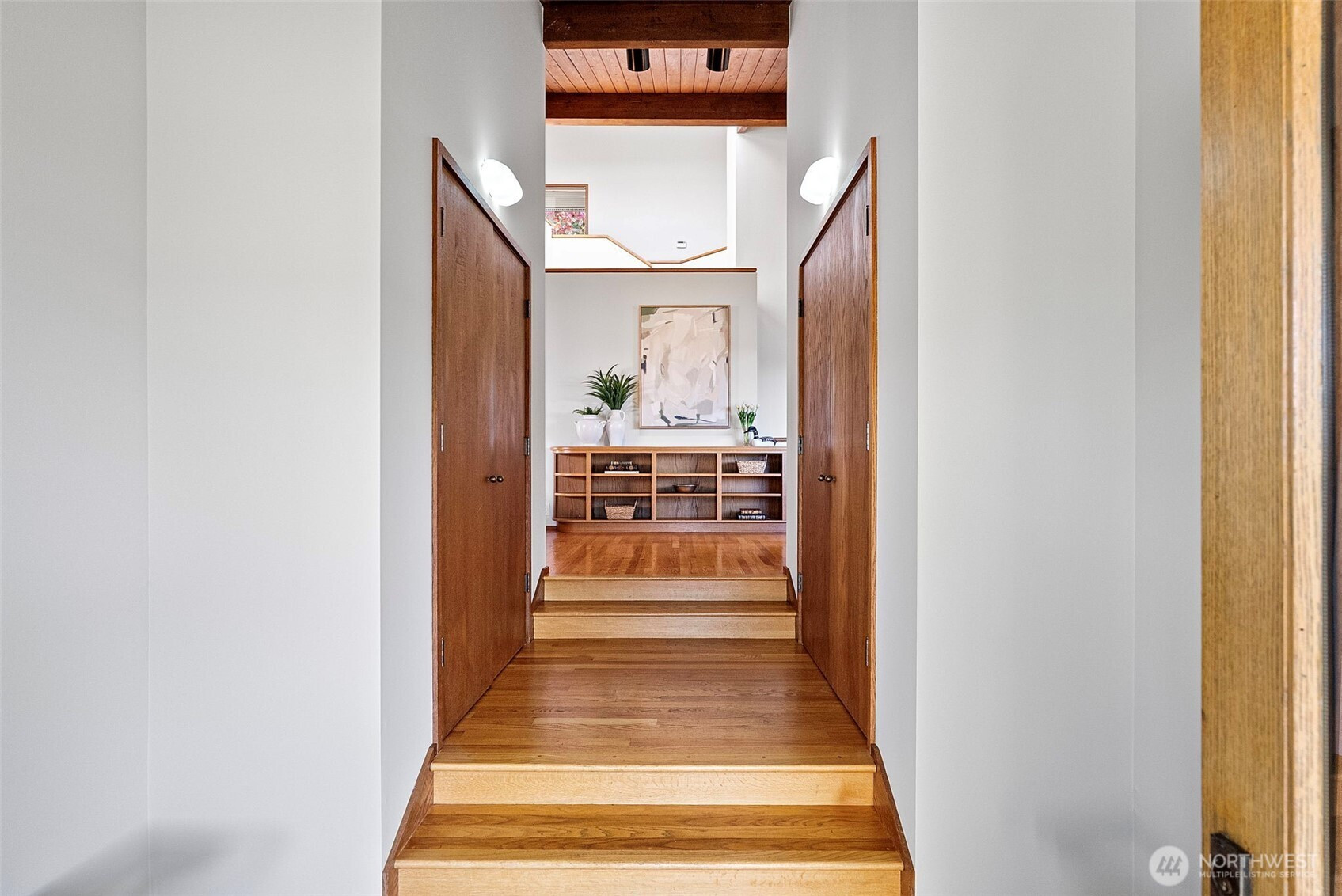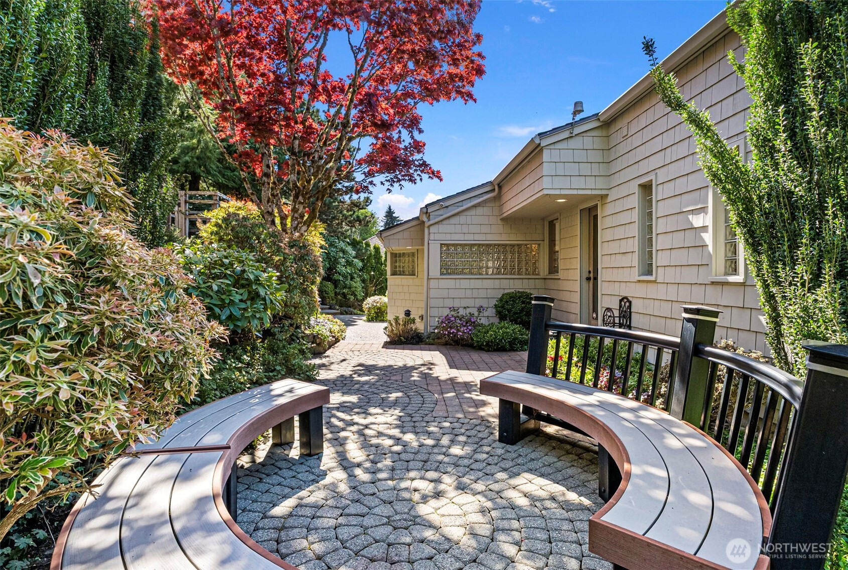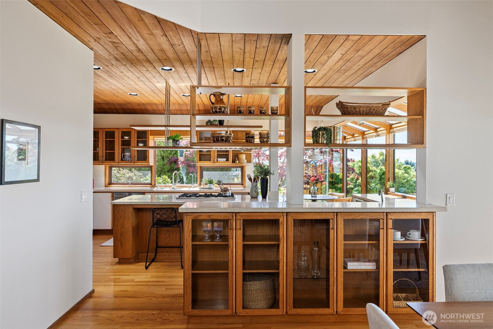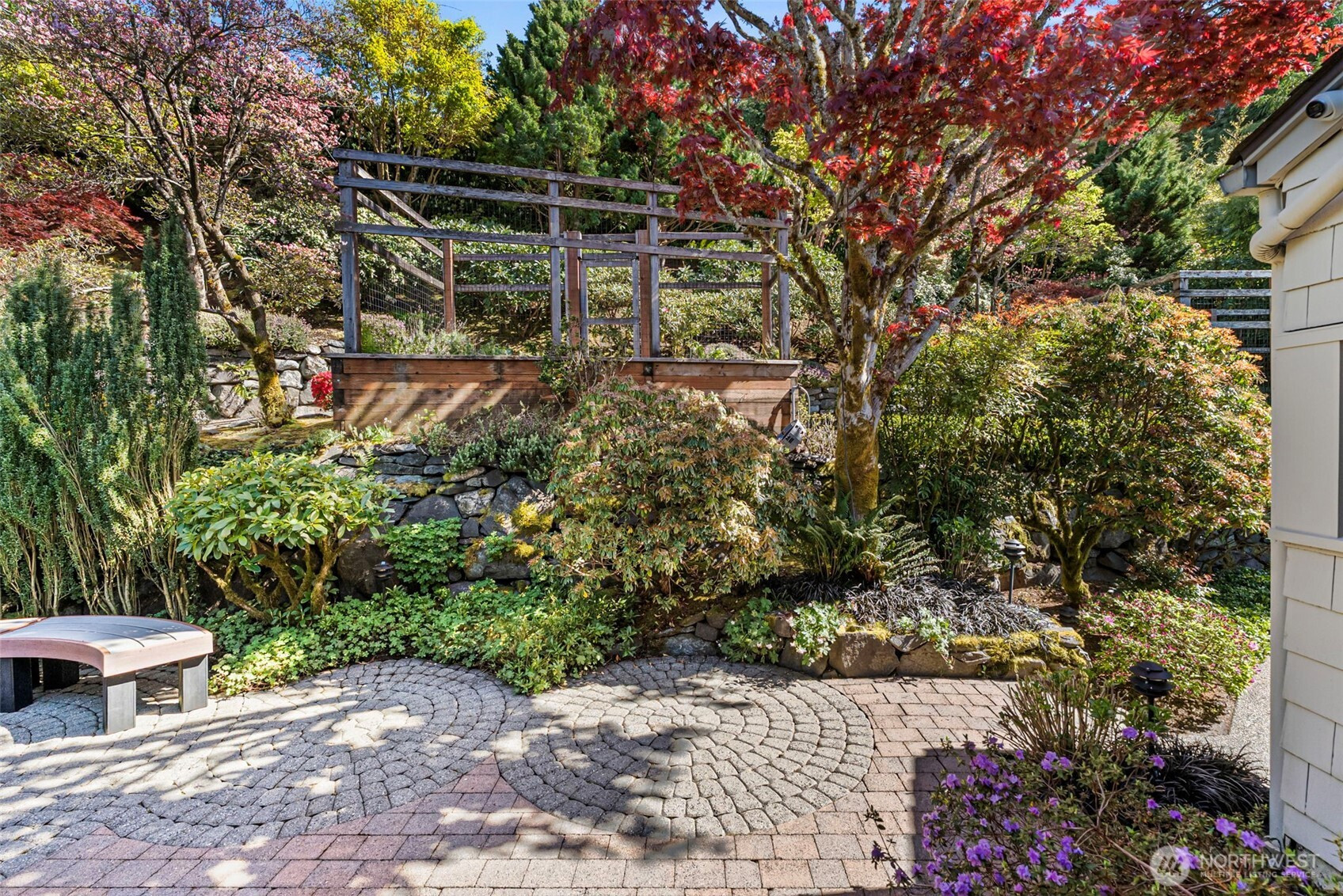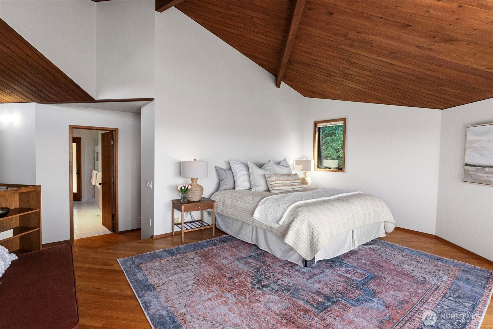 The Wagonfeld residence, an AIA award-winning design by renowned modernist architects Alan Liddle and Robert Jacklin, is positioned high on a bluff with sweeping views across Fox and McNeil Islands, Gig Harbor, Hale Passage, and the Olympic Mountains. A recorded view covenant ensures these vistas are yours forever. Vaulted tongue-and-groove pine ceilings, trestle beams, custom oak cabinetry, hardwood floors, and walls of glass define an interior built without compromise. A granite fireplace anchors the main living area, which has access to a view deck. Dining room, kitchen, a den with custom shelving, a bedroom and guest bath complete the main level. The kitchen features euro-style cabinetry, Corian counters, SubZero refrigerator, dual Dacor ovens, Bosch dishwasher, walk-in pantry, and breakfast nook opening to a front view patio. The formal dining room offers a wall of windows and French door to the patio. The primary suite is a private retreat with a wood-burning stove, custom walk-in closet, soaking tub, shower room and door opening to the rear gardens. Two additional upstairs bedrooms feature built ins. The lower level family room — with shoji screen panels, wet bar, and bath with shower — adapts easily to a guest suite or apartment. Outside, mature specimen trees frame the views, with raised planting beds, deer-proof fencing, and a tranquility garden with winding paths and built-in seating. This is a truly rare convergence of architecture, views, and landscape.