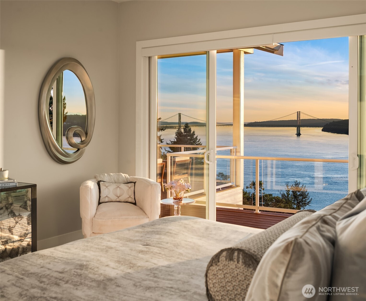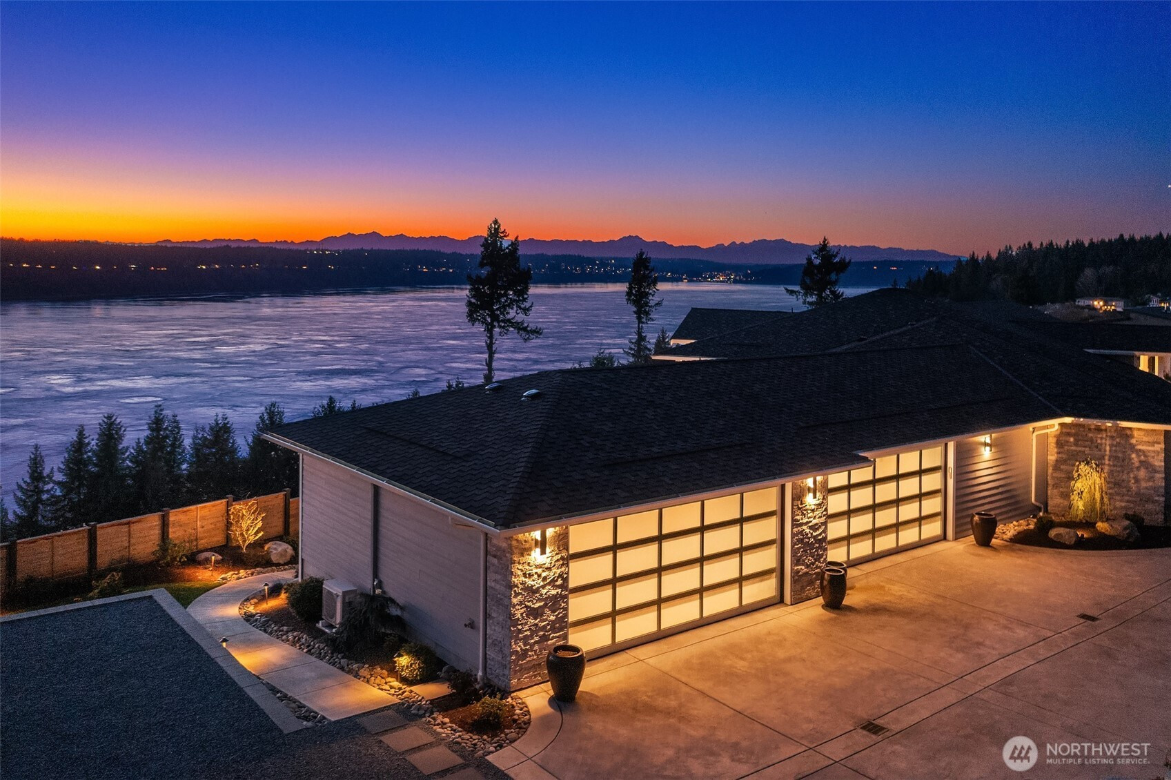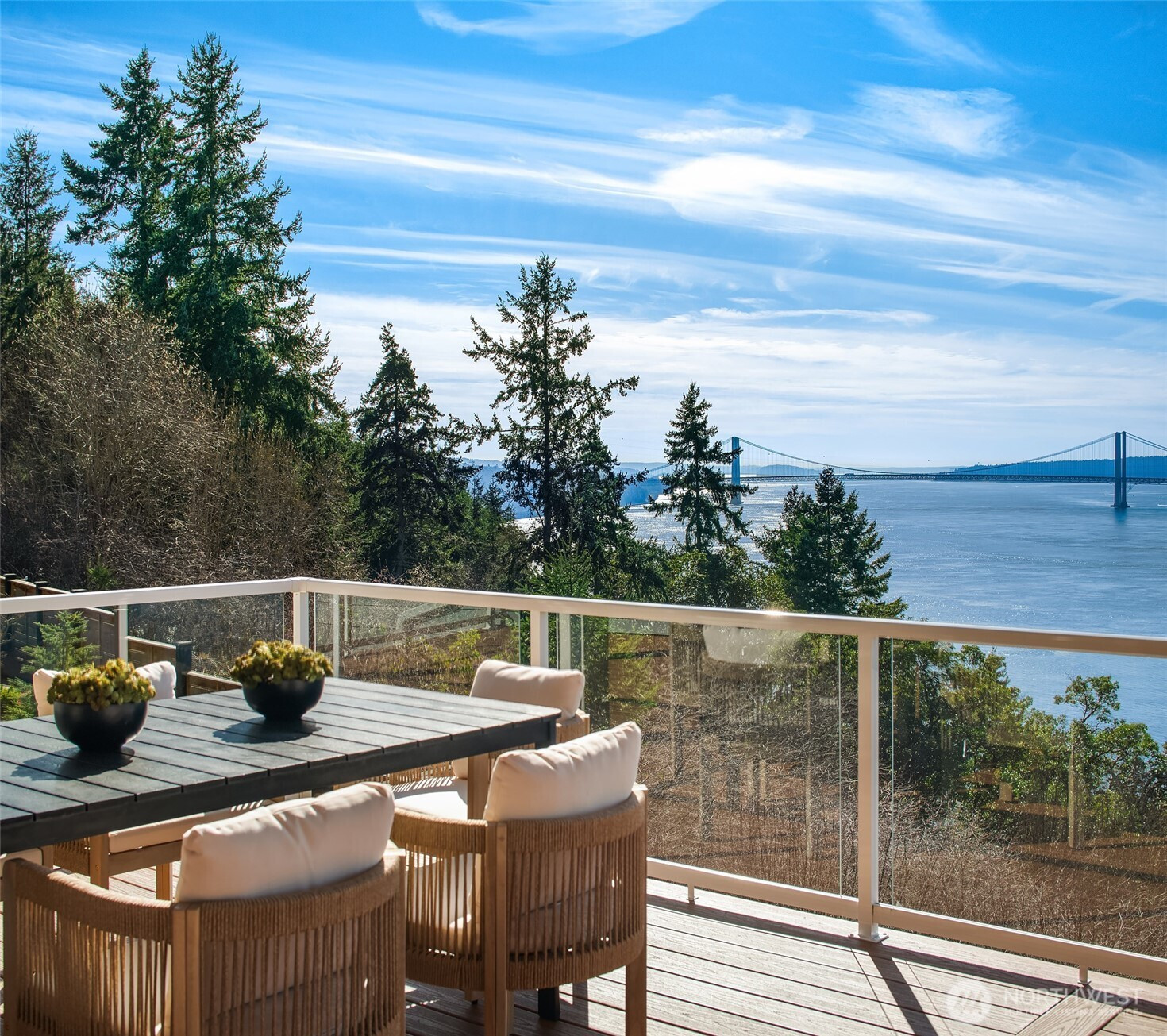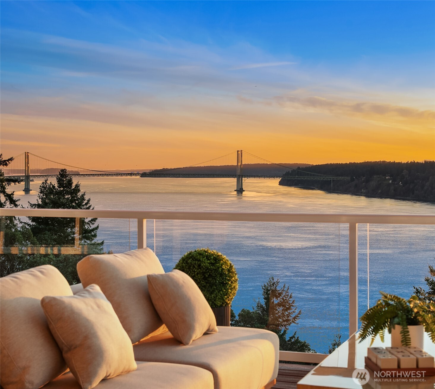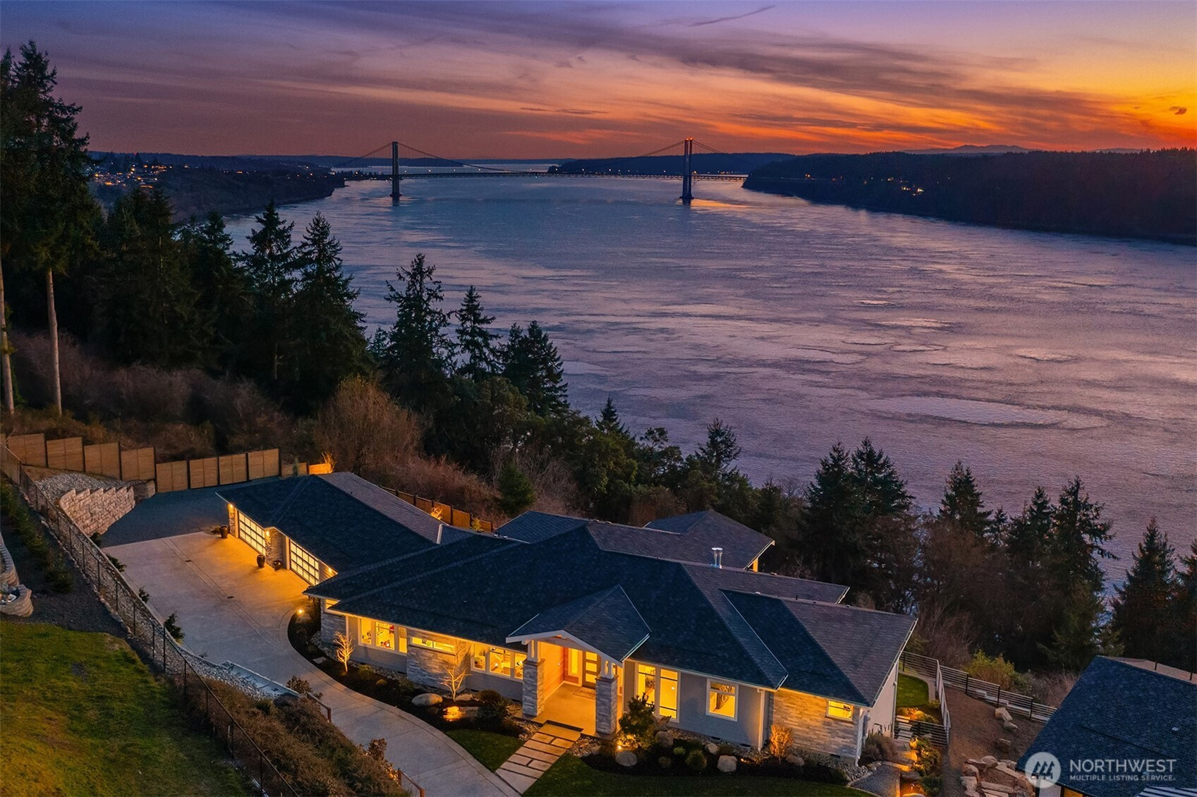 Welcome to the pinnacle of North Tacoma living. The WOW factor of this 2022-built home is second to none. You’ll wake up every day in awe of the Tacoma Narrows, Olympic Mountains, and the view into the heart of Gig Harbor. Your guests will arrive at the front door, and their jaws will drop at the panoramic West-facing view. You’ll park in the immaculate four-car garage with polished concrete floor, and your stress will melt away. The open concept main living room features vaulted ceilings and walls of glass leading out to the expansive view deck with heaters in the tongue-and-groove ceiling. Envision breaking bread with those you cherish the most in the spotless like-new kitchen. The main level primary wing offers a seamless flow from the bedroom to the spa-like bath, into the generous primary closet with access into the pristine laundry. With four additional bedrooms, two on main and two on the daylight lower level, there is space for everyone. The lower-level living room features more stunning views leading you to the patio and custom hot tub gazebo. Located at the end of the private, gated Narrows Ridge neighborhood, there is nothing like this picturesque property.