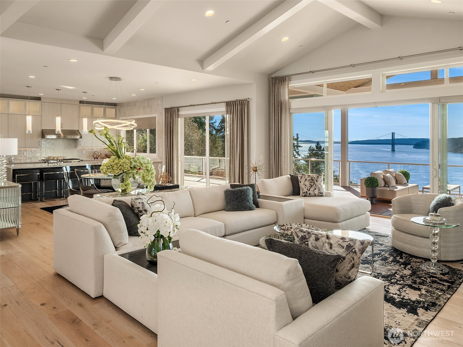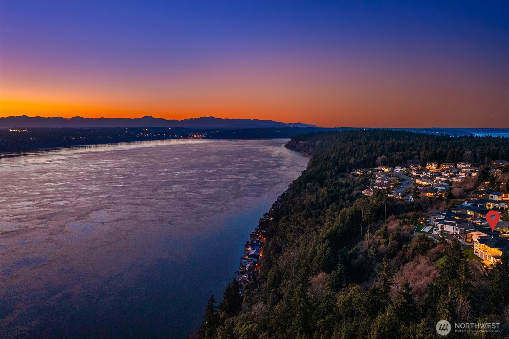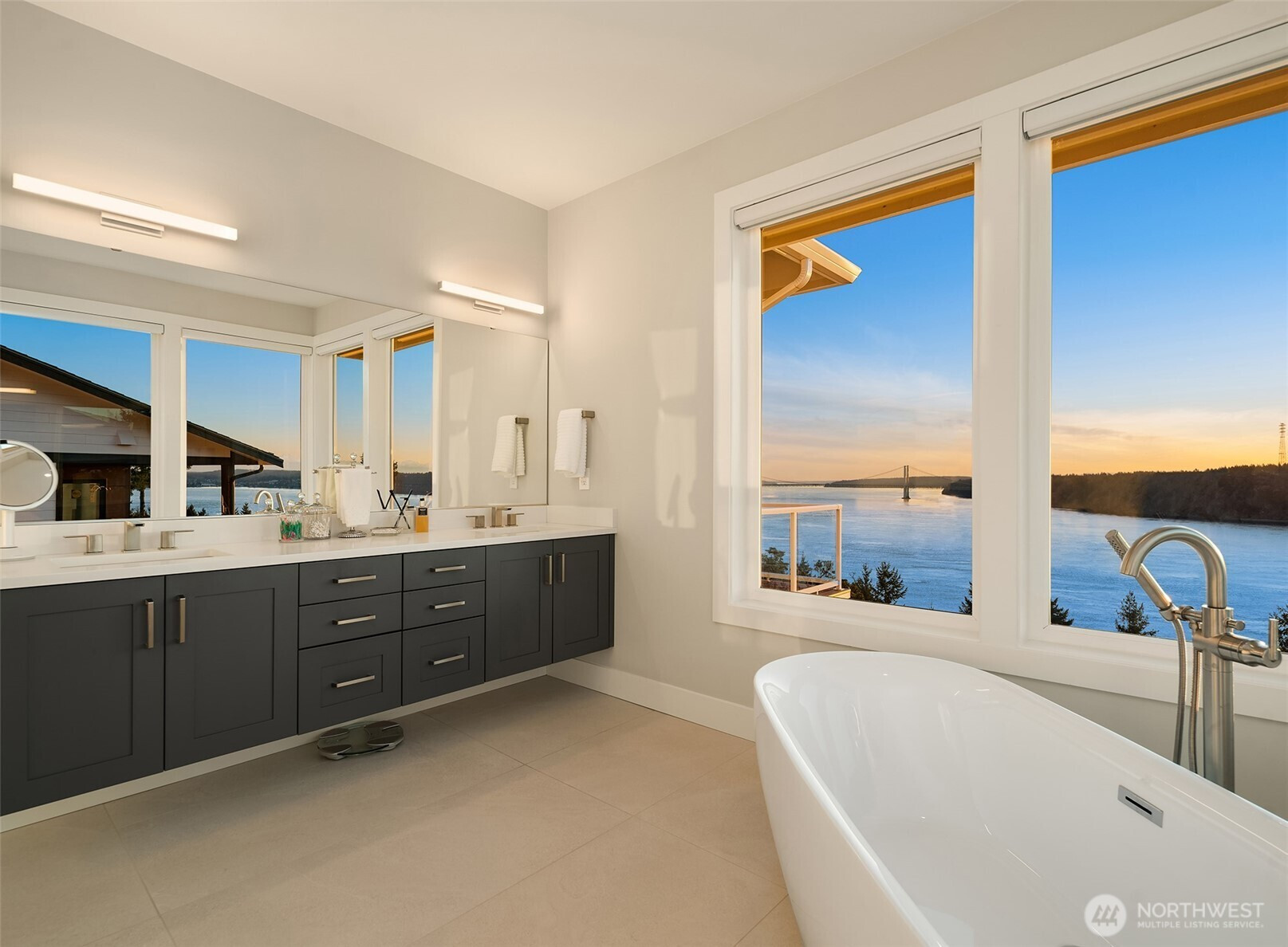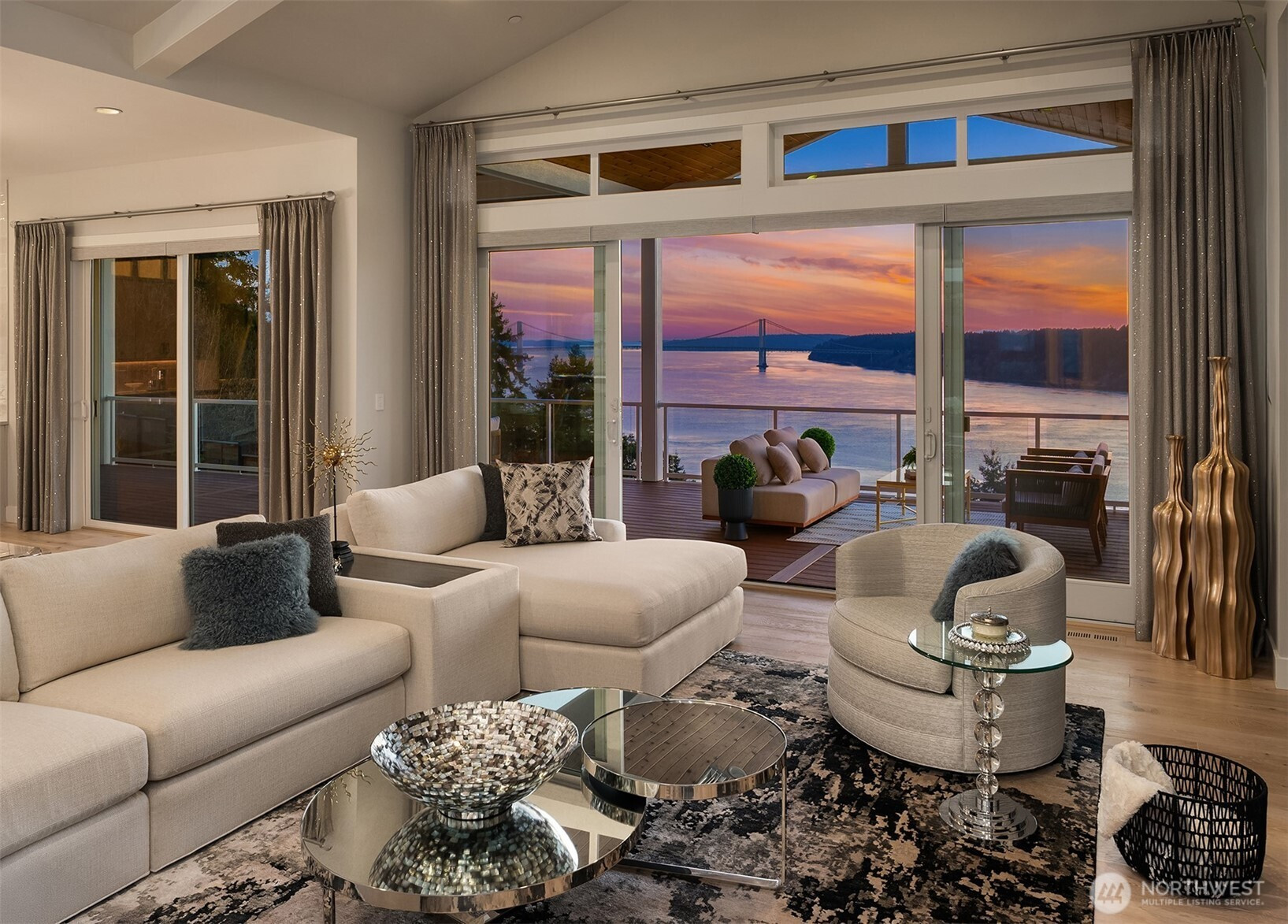 Welcome to the pinnacle of North Tacoma living. The WOW factor of this 2022-built home is second to none. You’ll wake up every day in awe of the Tacoma Narrows, Olympic Mountains, and the view into the heart of Gig Harbor. Your guests will arrive at the front door, and their jaws will drop at the panoramic West-facing view. You’ll park in the immaculate four-car garage with polished concrete floor, and your stress will melt away. The open concept main living room features vaulted ceilings and walls of glass leading out to the expansive view deck with heaters in the tongue-and-groove ceiling. Envision breaking bread with those you cherish the most in the spotless like-new kitchen. The main level primary wing offers a seamless flow from the bedroom to the spa-like bath, into the generous primary closet with access into the pristine laundry. With four additional bedrooms, two on main and two on the daylight lower level, there is space for everyone. The lower-level living room features more stunning views leading you to the patio and custom hot tub gazebo. Located at the end of the private, gated Narrows Ridge neighborhood, there is nothing like this picturesque property.