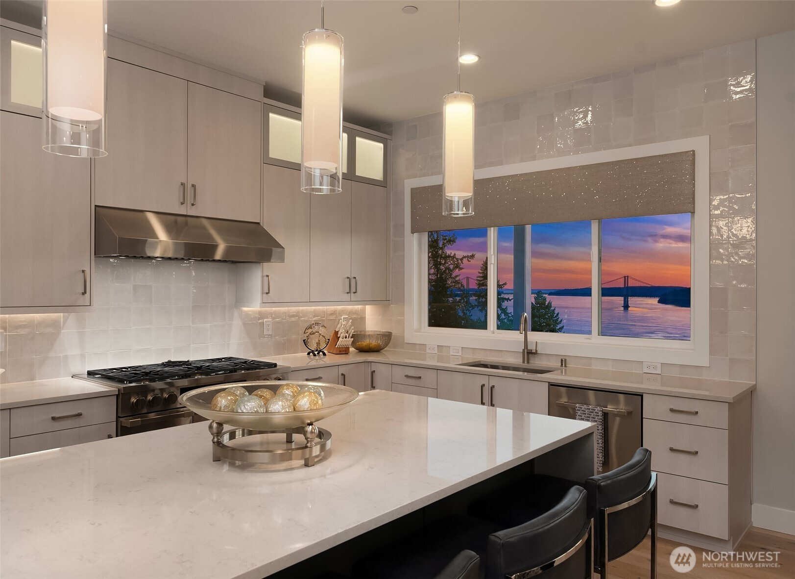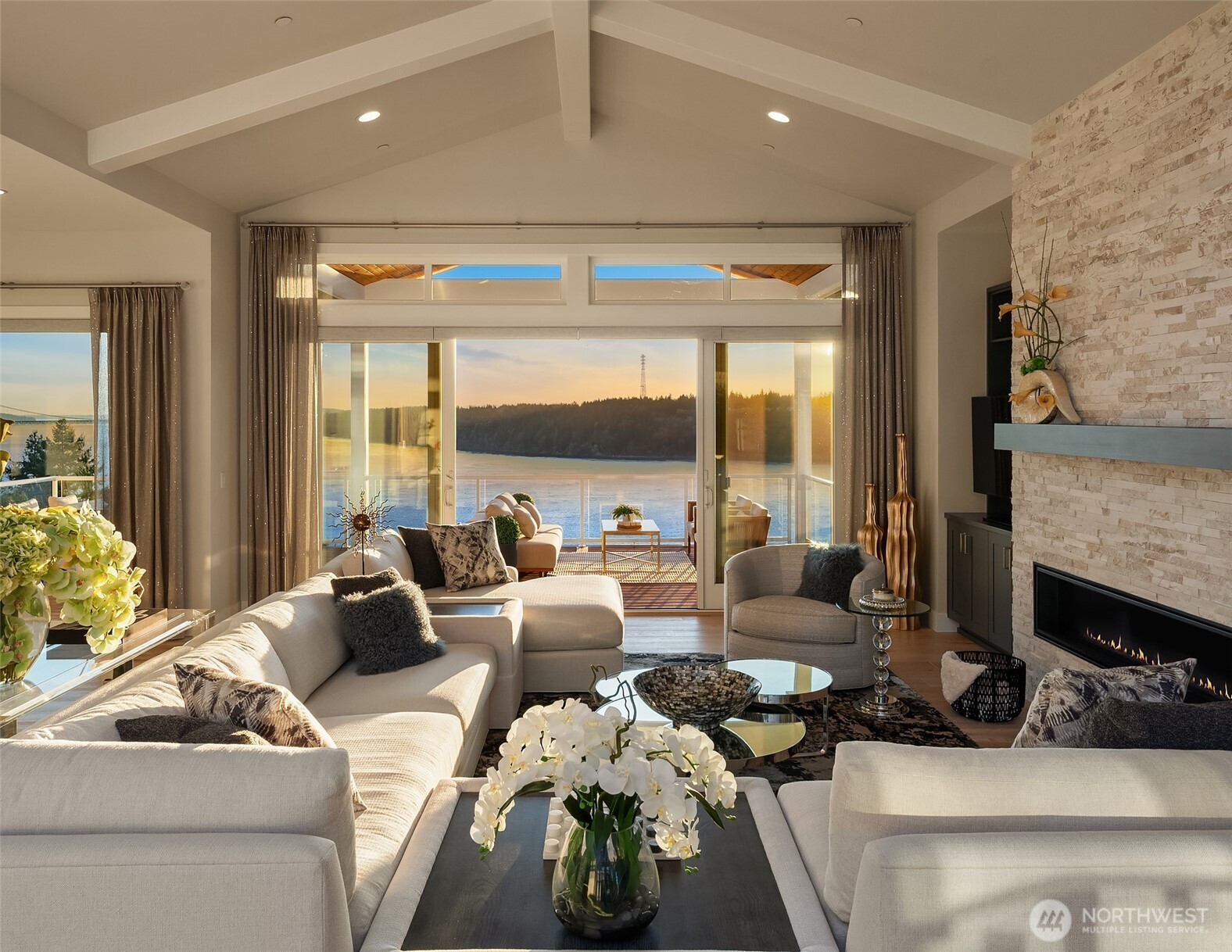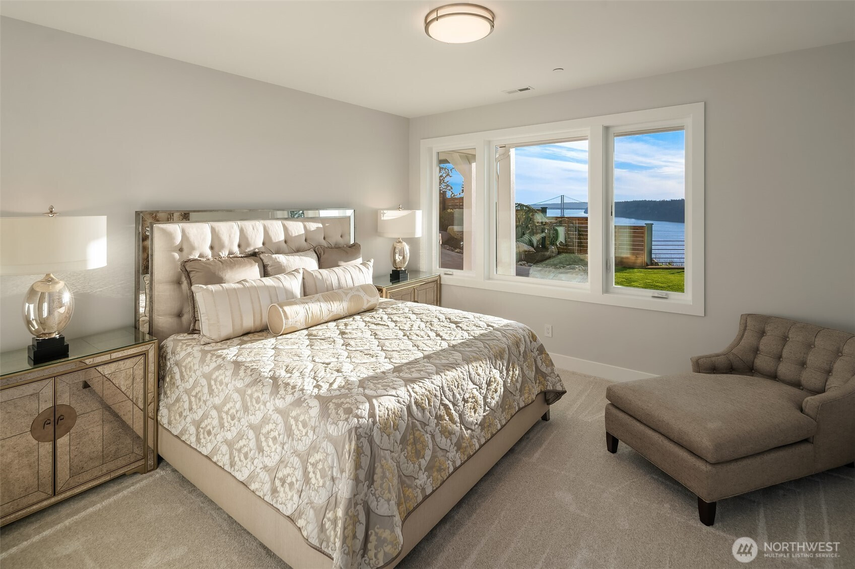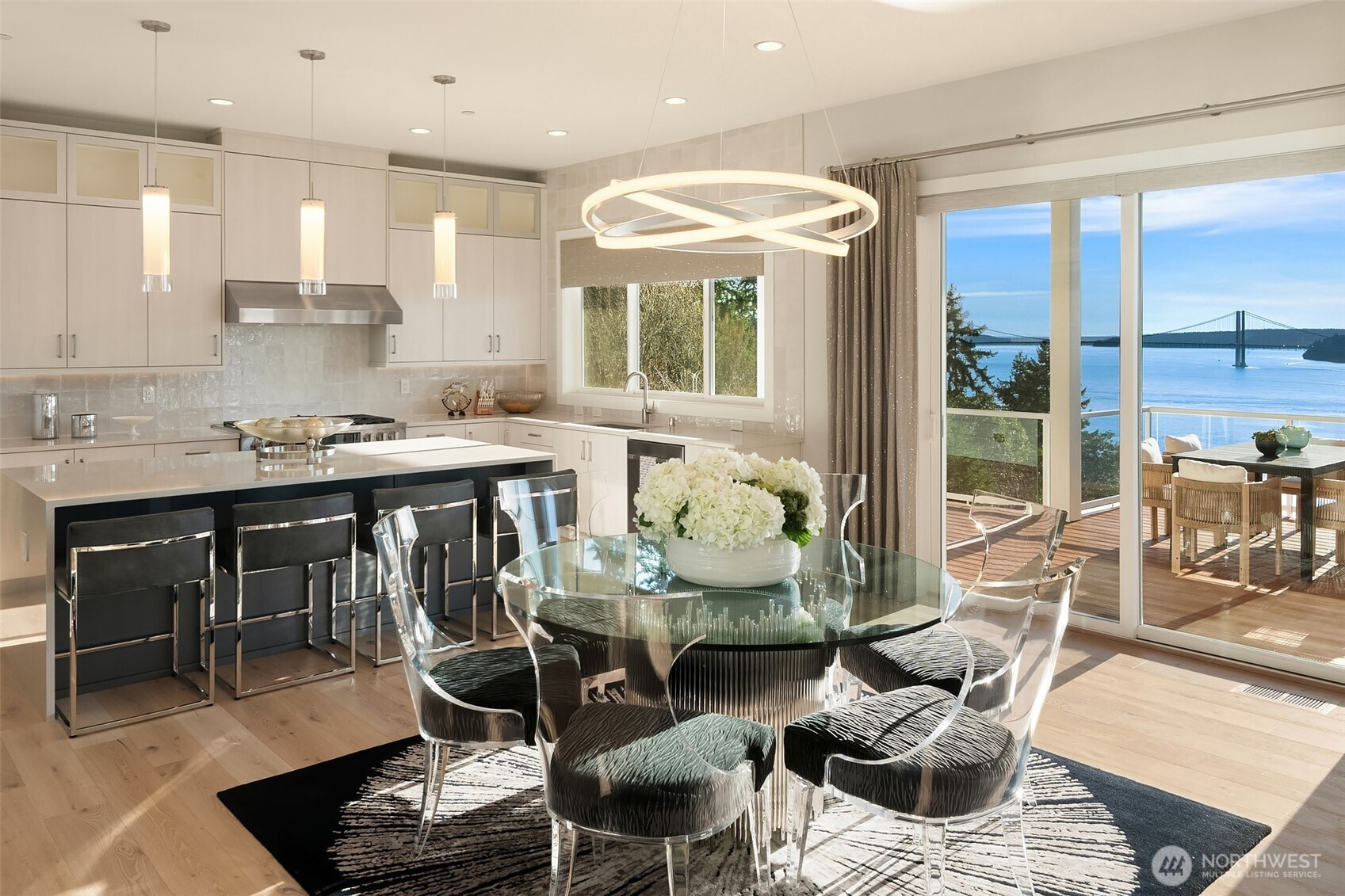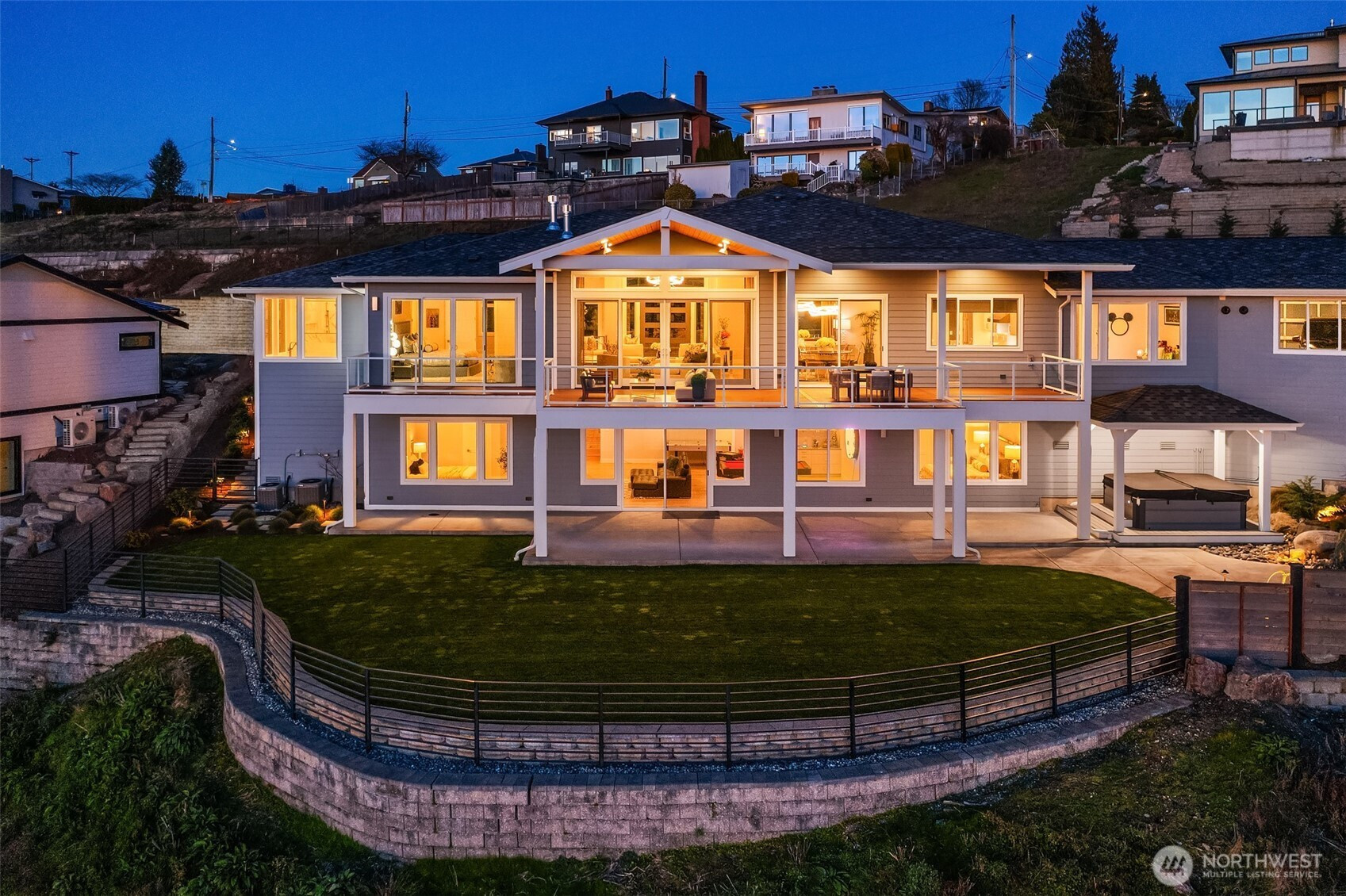 Welcome to the pinnacle of North Tacoma living. The WOW factor of this 2022-built home is second to none. You’ll wake up every day in awe of the Tacoma Narrows, Olympic Mountains, and the view into the heart of Gig Harbor. Your guests will arrive at the front door, and their jaws will drop at the panoramic West-facing view. You’ll park in the immaculate four-car garage with polished concrete floor, and your stress will melt away. The open concept main living room features vaulted ceilings and walls of glass leading out to the expansive view deck with heaters in the tongue-and-groove ceiling. Envision breaking bread with those you cherish the most in the spotless like-new kitchen. The main level primary wing offers a seamless flow from the bedroom to the spa-like bath, into the generous primary closet with access into the pristine laundry. With four additional bedrooms, two on main and two on the daylight lower level, there is space for everyone. The lower-level living room features more stunning views leading you to the patio and custom hot tub gazebo. Located at the end of the private, gated Narrows Ridge neighborhood, there is nothing like this picturesque property.