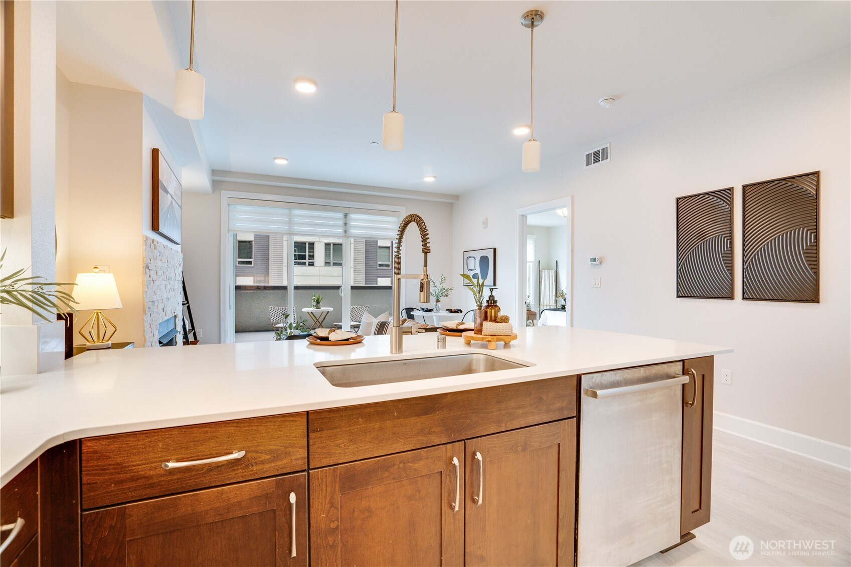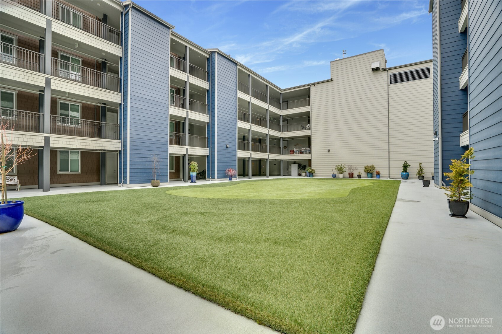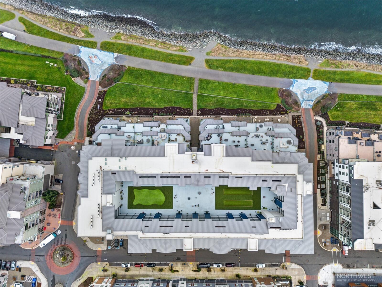 Live in the heart of Point Ruston, where waterfront strolls, dining, shopping, and entertainment are just steps from your door. This 5th-floor residence offers a rare connection to the beautifully designed courtyard, complete with a putting green & bocce ball, creating an extension of your living space beyond the walls of the home. Inside, the light-filled living area features a cozy gas fireplace & flows seamlessly to an exceptional 258 sq ft patio deck, ideal for relaxing, entertaining, or enjoying the energy of the surrounding community. New laminate flooring has just been installed throughout, giving the home a fresh, modern feel. The kitchen is thoughtfully designed with quartz countertops, stainless steel appliances, & bar seating that works perfectly for both everyday living & hosting guests. The spacious primary suite includes an ensuite bath & a generous walk-in closet, while the second bedroom is conveniently located near a full bath. In-unit laundry room includes a utility sink & storage. Residents also enjoy expansive indoor and outdoor community spaces designed for larger gatherings. Two garage parking spaces and a storage unit are included.