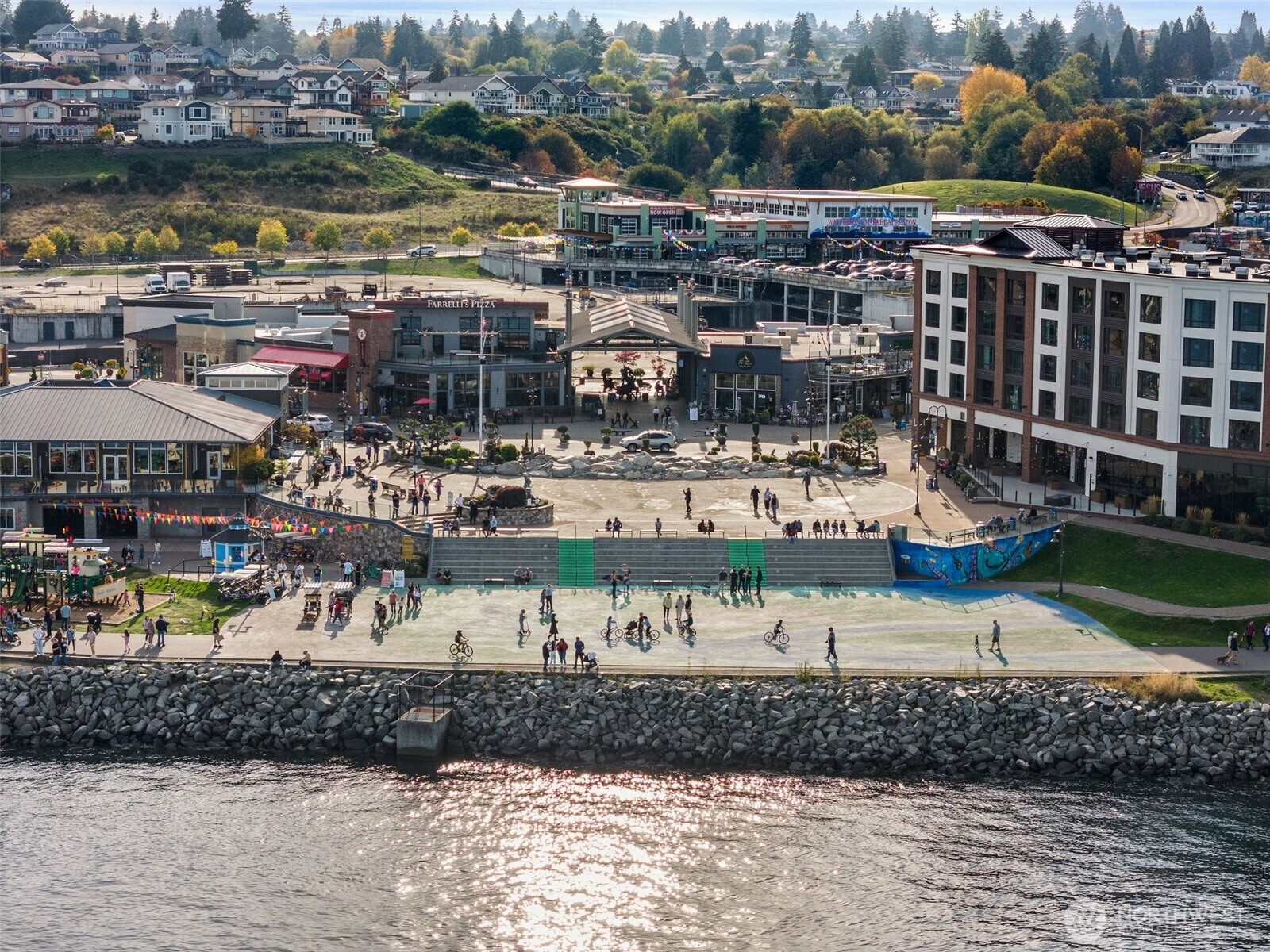 Experience Penthouse living above Point Ruston, where sweeping Sound and mountain views frame every room. A custom kitchen with elevated finishes opens to a separate dining area overlooking the water. The airy living room is spacious enough for a grand piano and offers a cozy movie-night setting by the gas fireplace. The luxurious primary suite features a spa bath with heated tile floors, soaking tub, and large walk-in closet. A secondary suite provides an ideal guest space or home office. Enjoy a generous utility room with abundant storage, plus additional exterior storage on the same level. Two reserved parking spaces included. Enjoy having shopping, restaurants, entertainment, & more all easily accessible from a place you can call home.