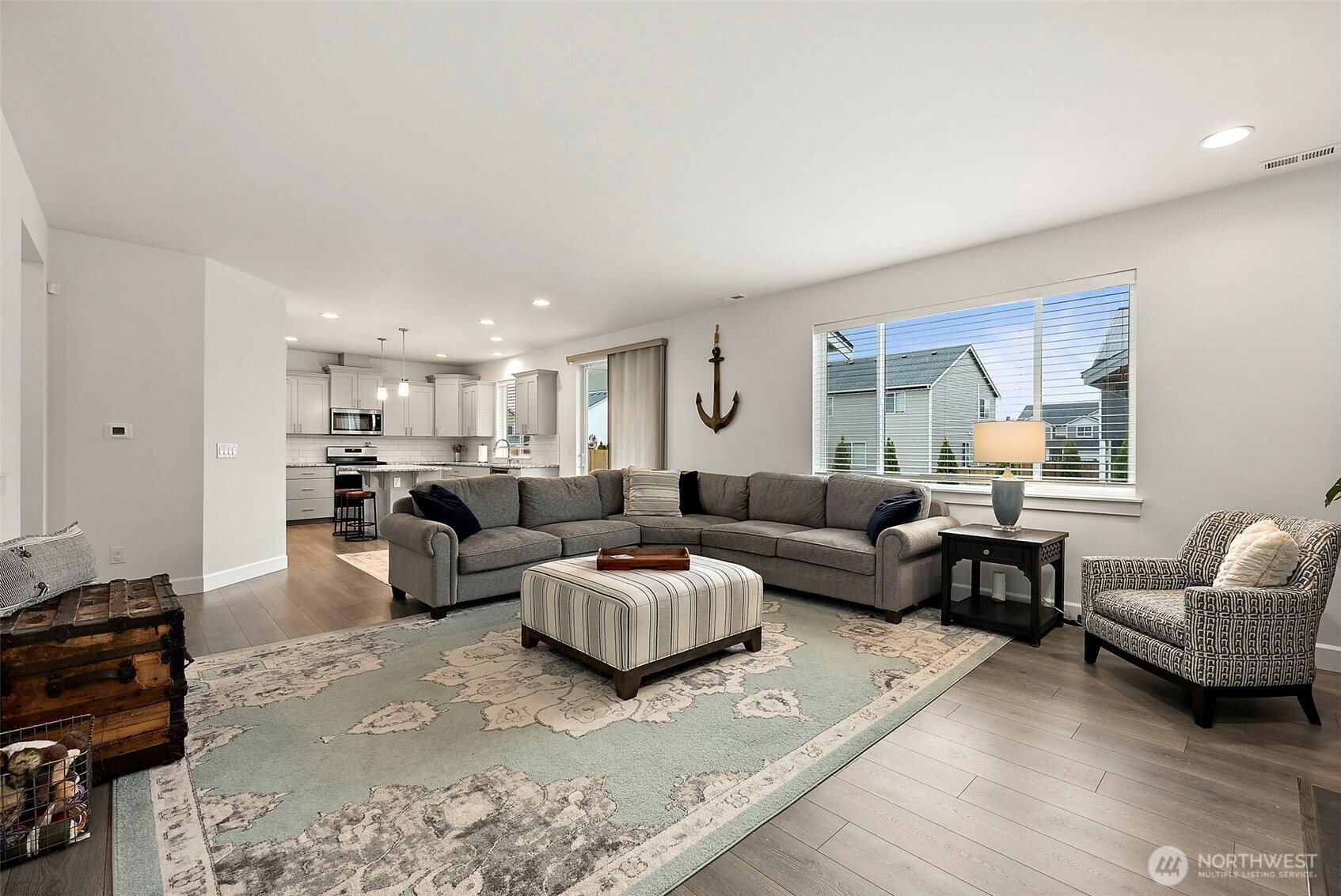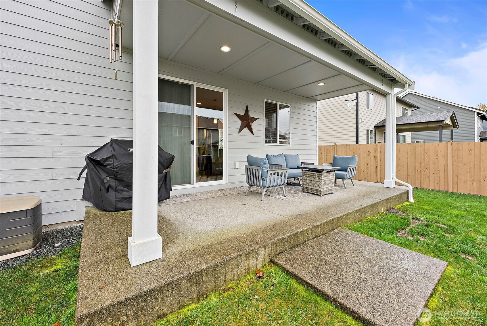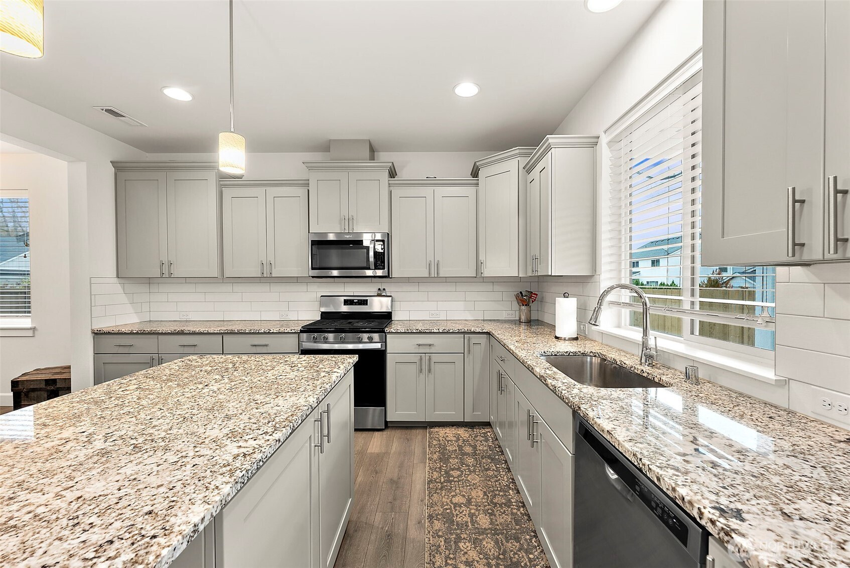 A wonderful neighborhood at the bottom of the Orting foothills with views of Mt. Rainier. Quiet and peaceful, this is the wonderful neighborhood of Meadows at Orting South. 2978 sq. ft. w/ 4 bedrooms, den, a bonus room. Every room is spacious with so much natural light throughout. Many rooms with vaulted ceilings. The beautiful kitchen has so much granite counterspace, a huge island, Lots of room to work plus a pantry. Then you have the huge great room with a wonderful gas fireplace w/ built-in cabinetry on either side. Also has A/C!! All of the appliances stay. There is a fully fenced backyard with a lovey covered patio, a shed and low maintenance landscaping. This home has been lovingly cared for. A great cul-de-sac location is a bonus!