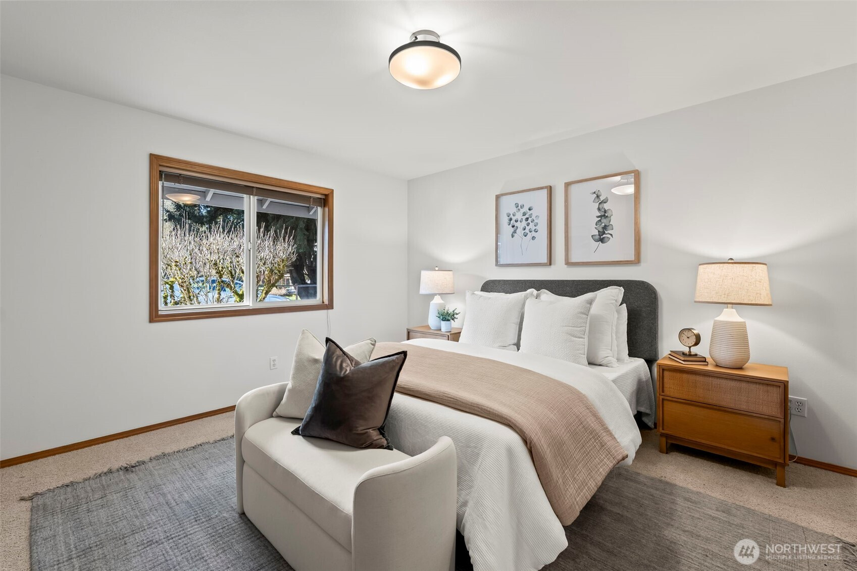 Experience the ultimate combination of privacy and convenience in this meticulously maintained, single-level University Place sanctuary. This light-filled, freshly-painted home features vaulted ceilings and new skylights that capture the Pacific Northwest glow during all four seasons. The functional floor plan includes an updated kitchen with quartz counters and a breakfast bar, flowing into sun-drenched living spaces. Relax in a primary suite with a walk-in closet and private ensuite bathroom. Use the versatile second bedroom as a home office or an inviting guest room, which also has a walk-in closet. Your private backyard is a gardener's dream, bordering a lush greenbelt for seclusion. Enjoy two patios - one covered for year-round entertaining and an open terrace for warm mornings or sunny afternoons. Perfectly located near top shops and dining. Low-maintenance comfort meets park-like tranquility.