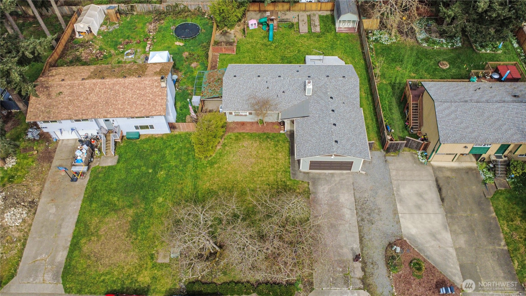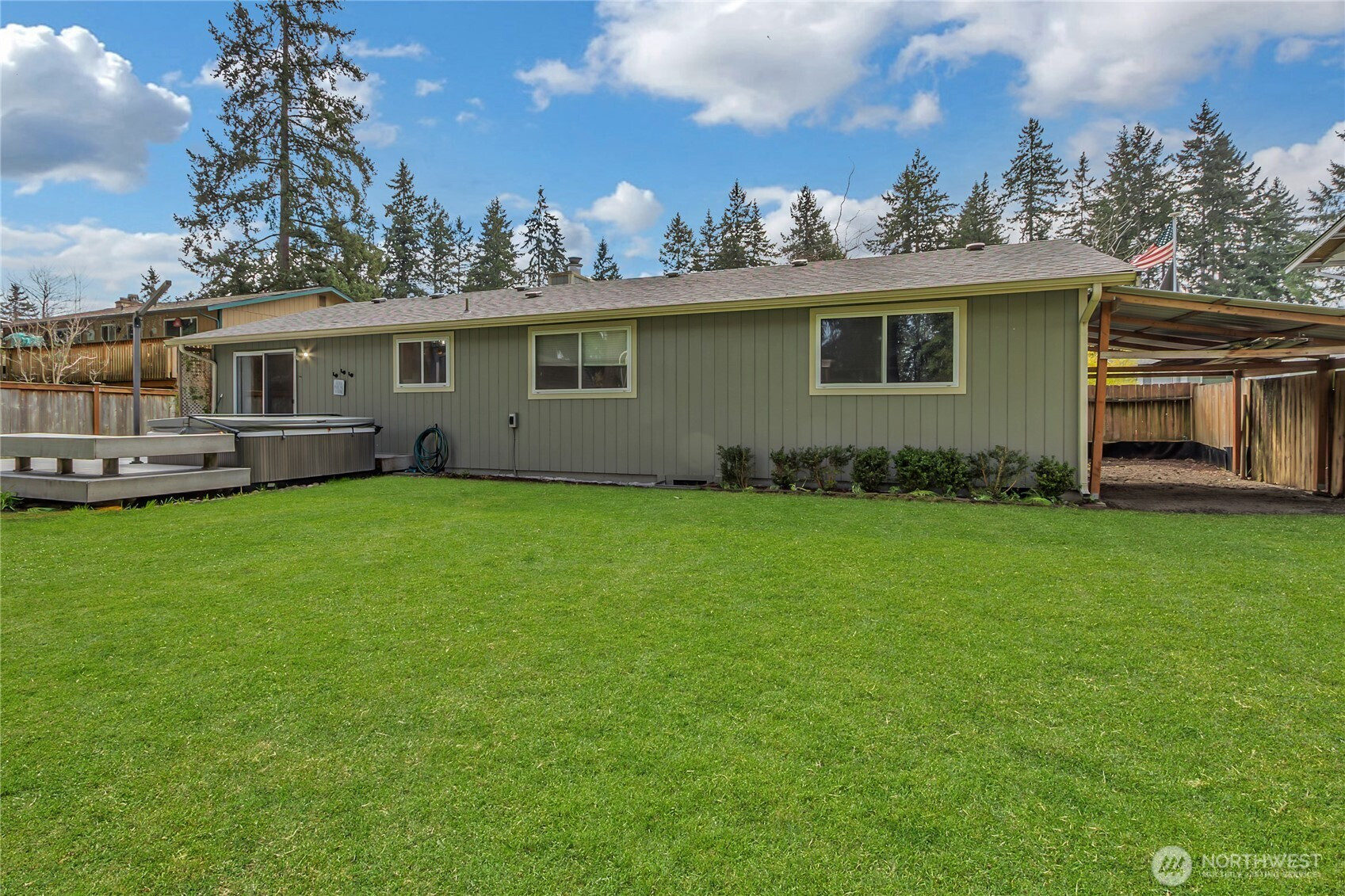 This charming and well-cared for rambler is situated on a spacious lot, offering great outdoor and indoor living opportunities. The property has been thoughtfully updated to provide comfort, functionality and style. The remodeled kitchen features Corian counters, abundant cabinetry, and new microwave. The kitchen connects to an open living area, complete with wood fireplace insert and adjacent dining space. There are three bedrooms, including a primary suite with 3/4 bath and large walk-in closet for convenient storage. Comfort in the summer as well with AC/Heat Pump. The backyard provides generous room to enjoy outdoor activities including a children's big toy and established garden beds. Additional amenities include a hot tub, Trex deck, Covered overhang storage, a large shed equipped with power, providing versatile options for storage or hobbies. The home is equipped with a newer roof and an oversized two-car garage, plenty of space for vehicles and storage and a brand new garage door! Located in a well-maintained neighborhood near JBLM, shopping, and medical facilities, offering convenience and a great sense of community.