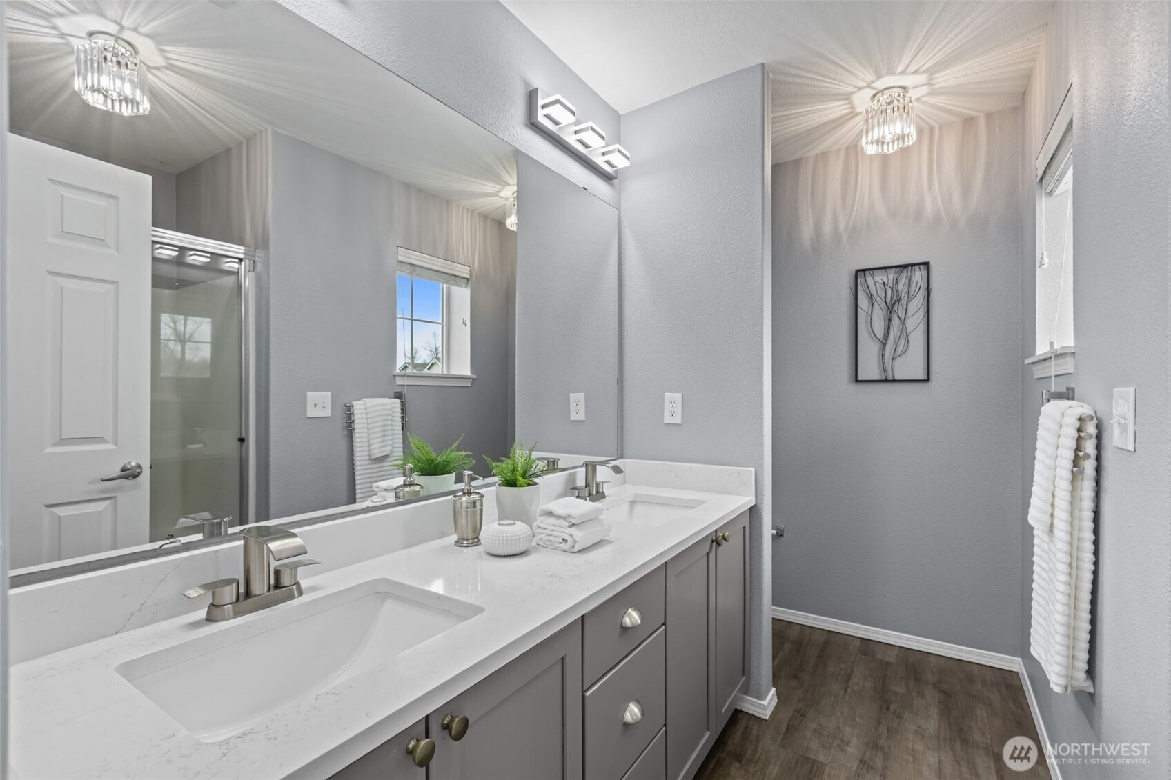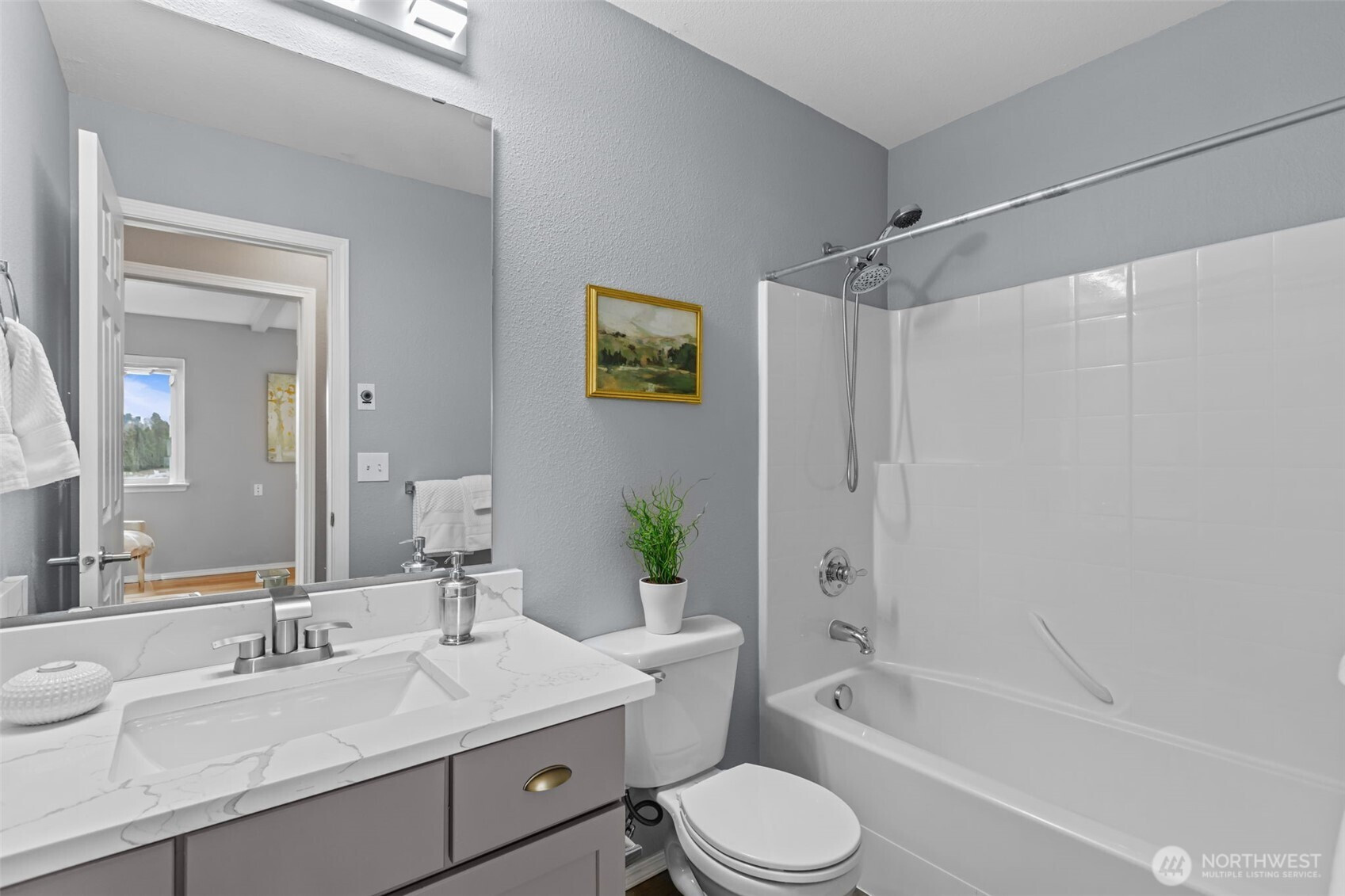 Stylish, updated, and move-in ready—this 2-bedroom, 2.5-bath townhome in the gated Stonebrook community has it all. Featuring LVP flooring and a light-filled open layout, the home boasts a modern kitchen and bathrooms with quartz countertops and stainless steel appliances, plus a beautifully remodeled gas fireplace that adds warmth and charm. Enjoy a private patio, and a two-car garage adds convenience. The upper level offers a spacious primary suite with dual sinks, a second bedroom, a guest bath, and walk-in closets. Custom built-in storage for added convenience. Perfectly located near Tacoma and Puyallup with quick access to I-5 and Hwy 167, this home combines comfort with convenience. Community perks include a sports court, playground, guest parking, and a peaceful setting on a quiet dead-end street close to parks and trails.