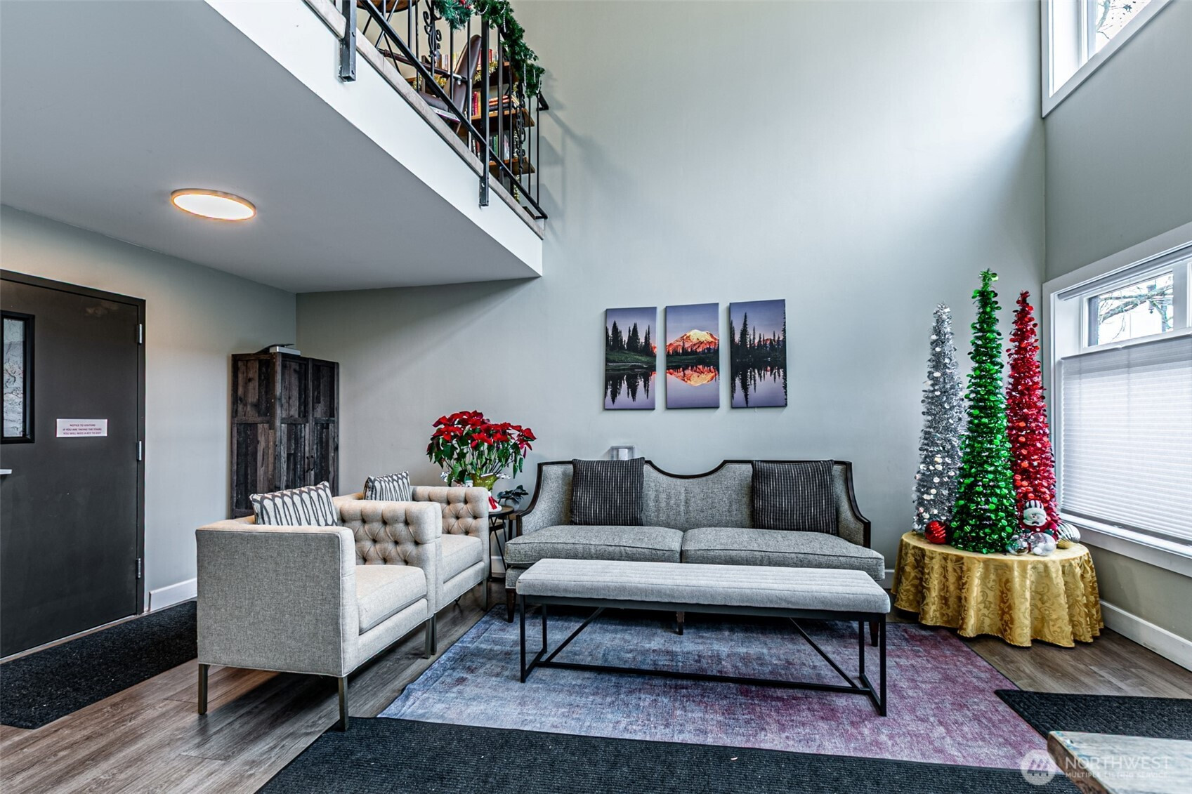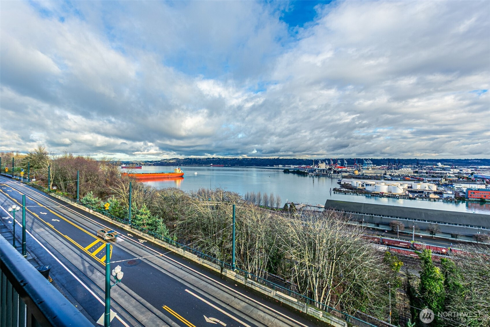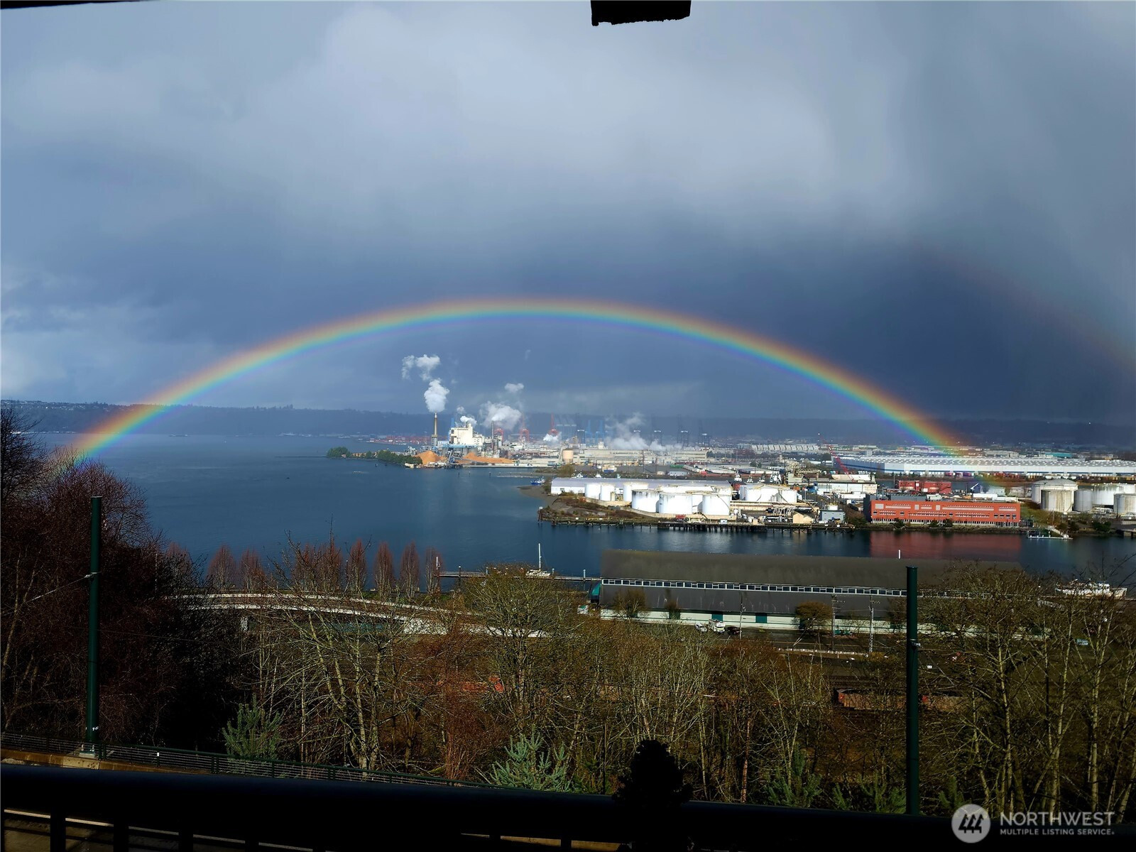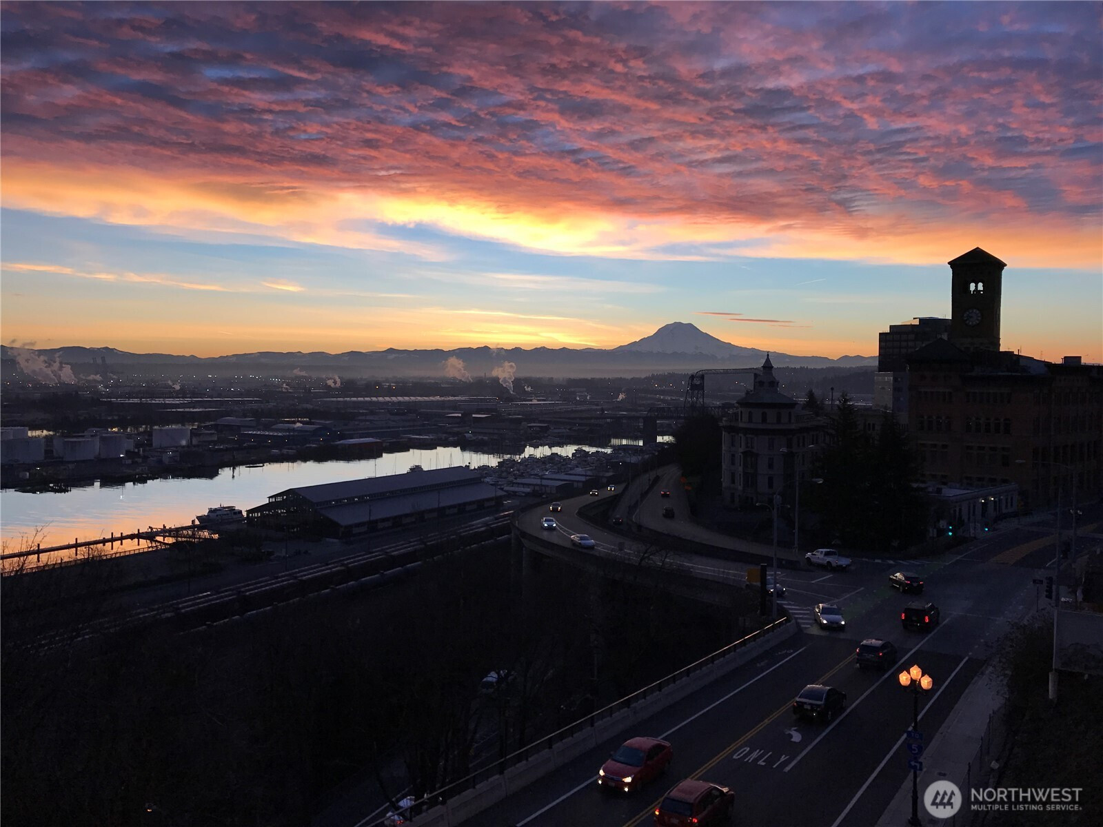 Wall of windows looks to glowing sunrises over Mt Rainier, City of Tacoma & Puget Sound to start your day. Just steps to McMenamins, theater district, Grand Cinema & dining. Great vibe of modern with industrial elements interior design. TOP FLOOR HOME. Vaulted ceilings with T&G wood ceilings & beams in great room, seating area with fireplace for ambiance, dining space looks over views with large mirror wall, dialed in kitchen with room for two chefs has eating bar, covered deck. LIVES LARGE! Second seating area off the entry for the screen or library. King sized primary bedroom with tiled ensuite bathroom & walk-in closet. Spacious 2nd bedroom. Cool loft area for yoga retreat or cat kingdom. Secure building & garage, elevator access.