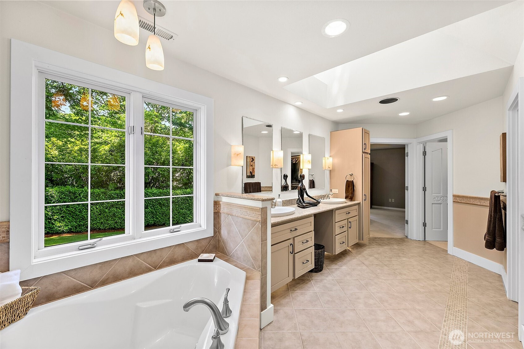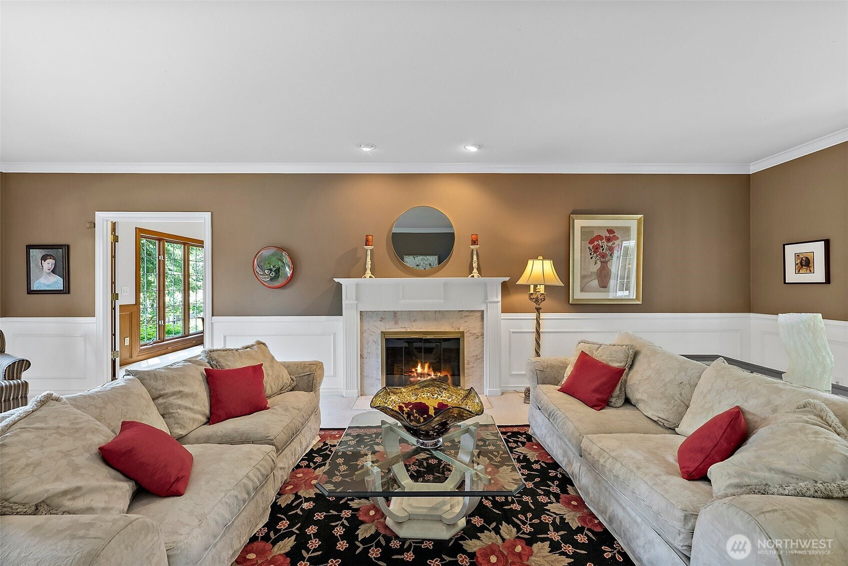 Luxury & quality are abundant in this beautifully updated four-bedroom home in Canterwood. Coffered ceilings & wainscoted walls are present throughout the house. Entertain in the gourmet kitchen with an island breakfast bar, hardwood floors, granite counters, & stainless steel appliances. The living room offers built-in cabinets & a floor-to-ceiling fireplace hearth. Pamper yourself in the 5-piece primary bathroom with a radiant heated floor & garden tub. The spacious den is perfect for a home office & includes a large bookshelf. The expansive tiled patio is excellent for BBQs or relaxing. The Canterwood community offers first-rate facilities, including tennis courts, a swimming pool, an 18-hole golf course, clubhouse, restaurant, & more!