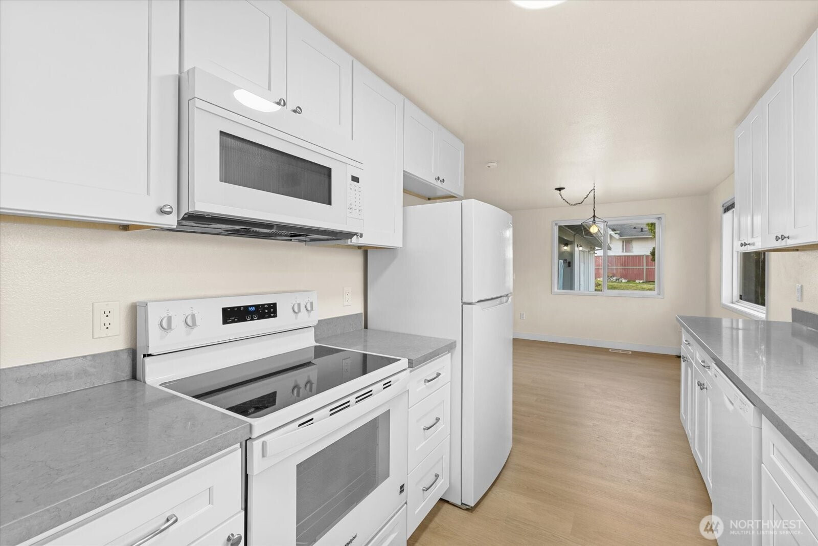Discover modern, effortless living in this updated one-story home in South Tacoma. This 1,696 sqft residence, situated on a level 5,850 sqft lot, features modern architecture and high-quality updates throughout. The seller has refreshed the entire interior, including new laminate flooring, new cabinetry and countertops in both the kitchen and baths, and updated vanities. The home includes new appliances, an attached garage, and a desirable bath off the primary suite. Enjoy the fenced backyard and patio, perfect for outdoor enjoyment. This updated home is ready for you!
