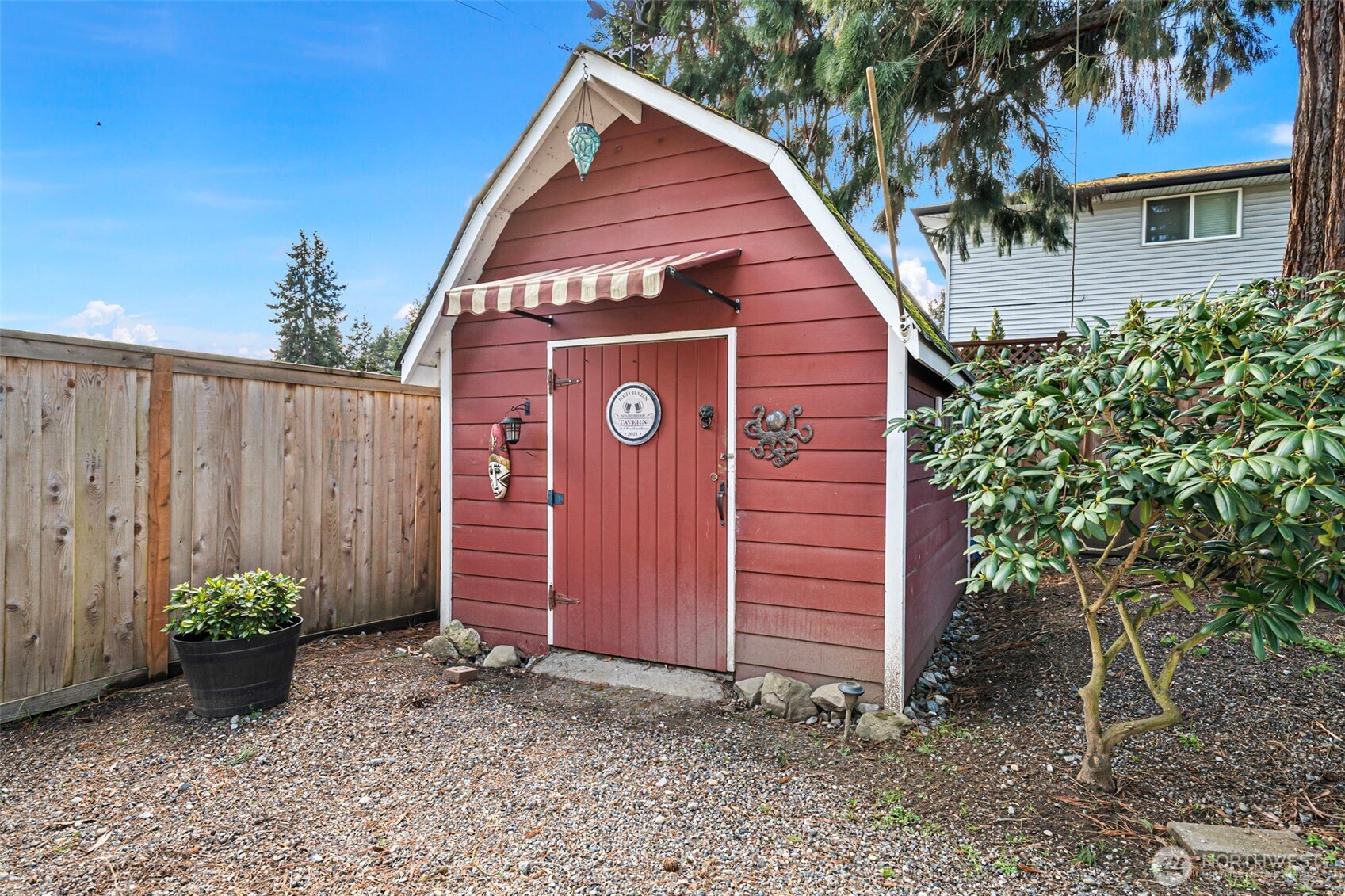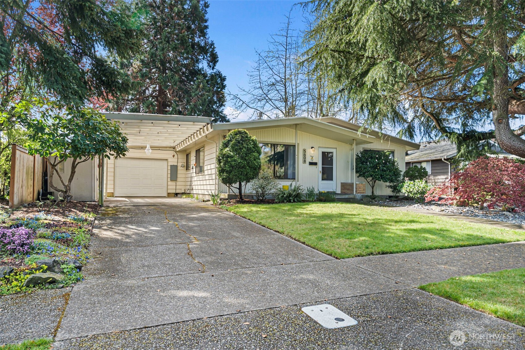 This 1964 Mid-Century Modern features clean contemporary lines, hardwood floors and a gas fireplace. The home's single story floor plan includes a living room, three bedrooms, an updated full bathroom, a laundry room with built-in storage and a spacious family room with a dedicated dining area. Sliding glass doors in the family room open to a deck and beautifully landscaped, fully fenced back yard, ideal for entertaining. A large storage shed has been finished out with drywall and electricity and could easily flex as a home office or work out space. The property also includes an attached one car garage, an attached one car carport and additional off-street parking in the driveway. Convenient location offers easy access to Westgate shopping, Point Defiance Park, Point Ruston and the waterfront.