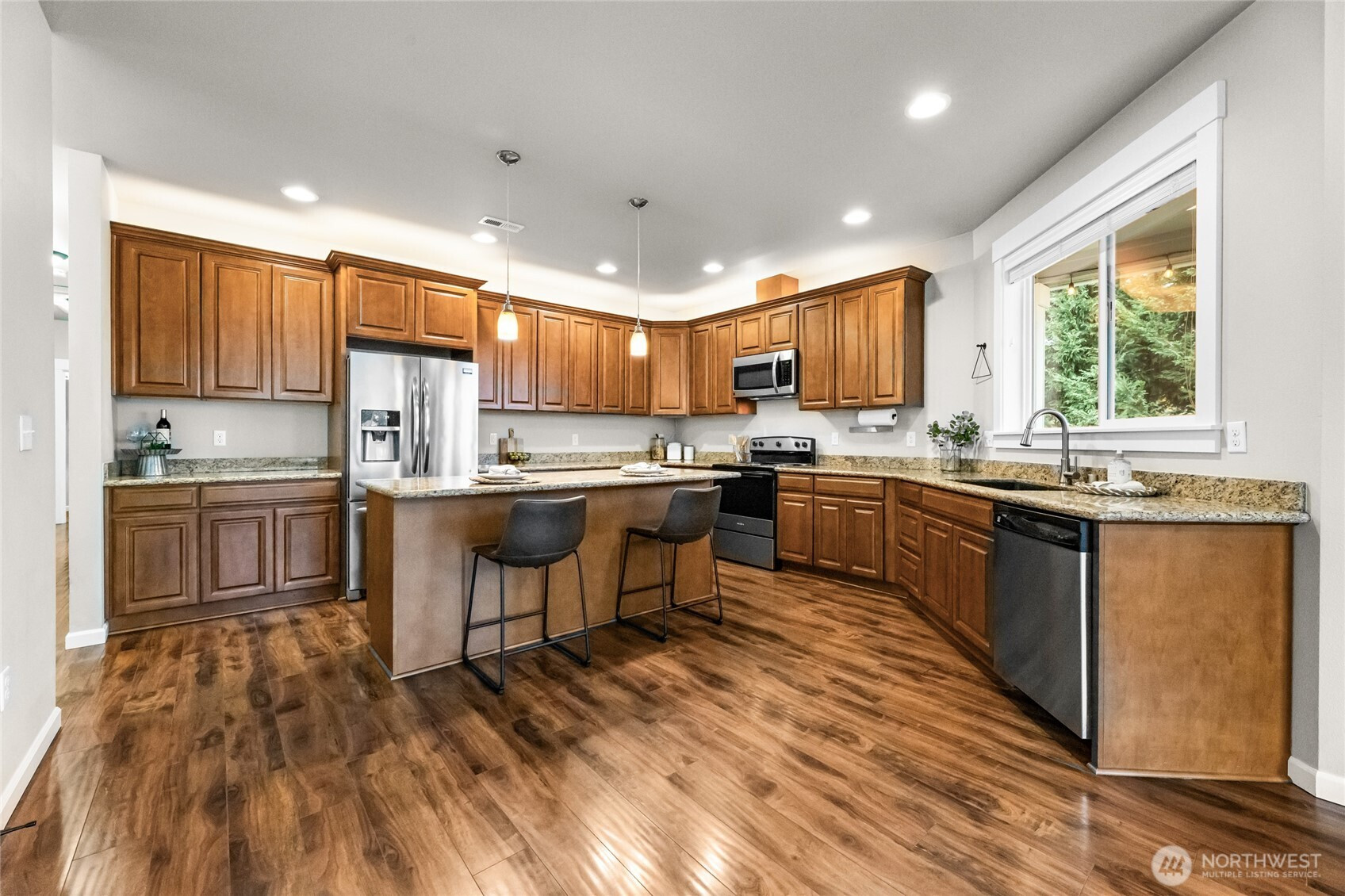 Walk to town from your beautiful 1-story 1915 sqft 3 bedrms 2 bathrms home w/9' ceilings & NO HOA's. Plenty of space on 1/3 acre lot, 3 car garage w/11' ceiling & built-in storage, RV PARKING, raised garden beds & 10x16 shed for more storage. Gorgeous VIEWS OF MT RAINIER & plenty of space to entertain on the deck off kitchen & oversized backyard patio. Amazing kitchen is what every cook needs w/granite counters, large island, stainless steel appli, pantry & abundance of cabinets. Engineered laminate floors throughout w/carpet in bedrms & vinyl in bathrms. Large primary bedrm & bathrm has soaker tub, brand new shower enclosure & fixtures, dual sinks & walk in closet. Both bathrms have granite counters. Built in 2016 this home is a stunner.