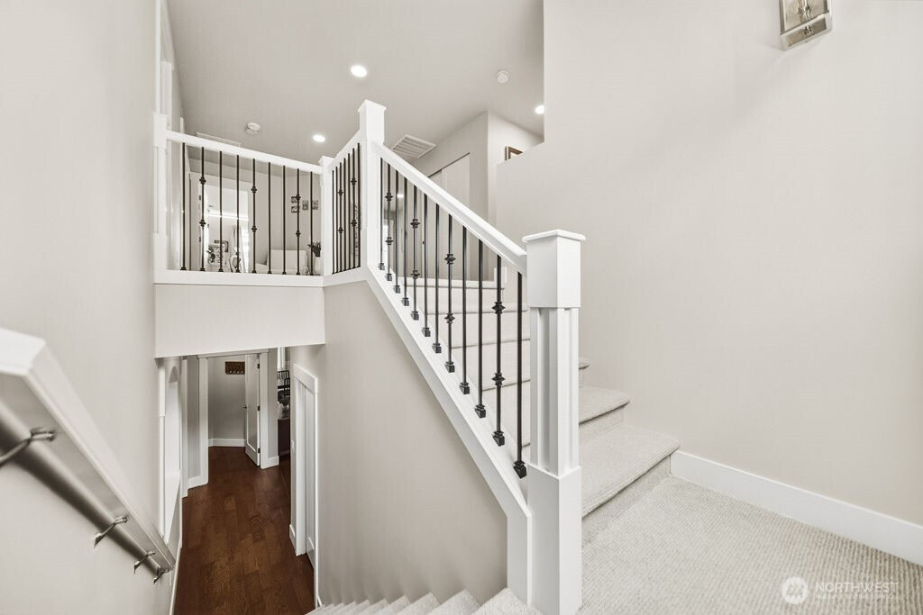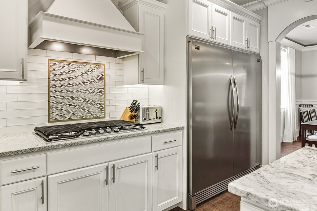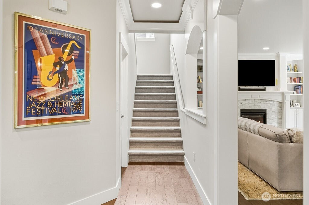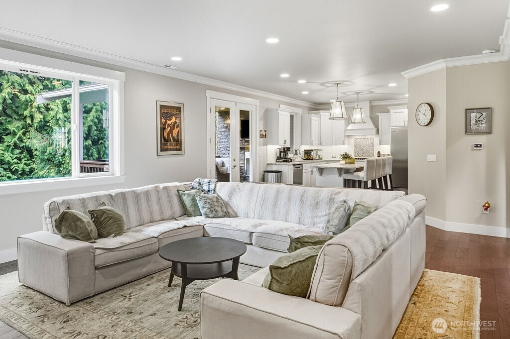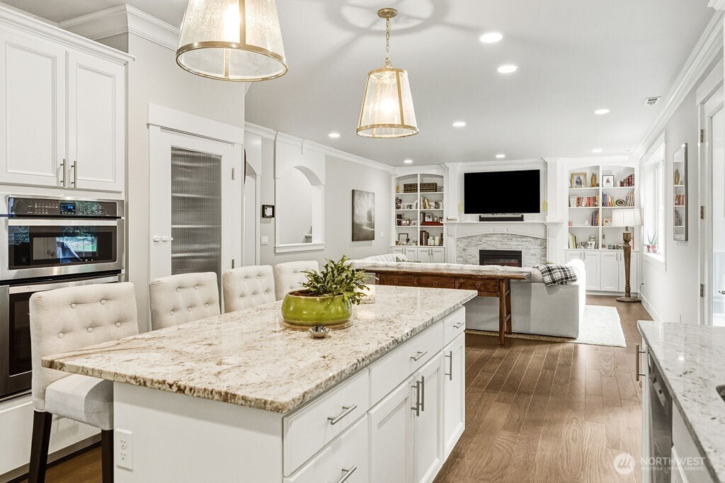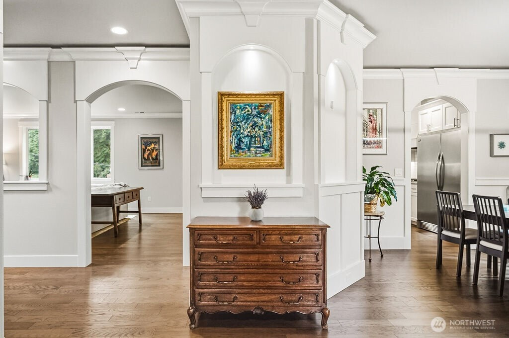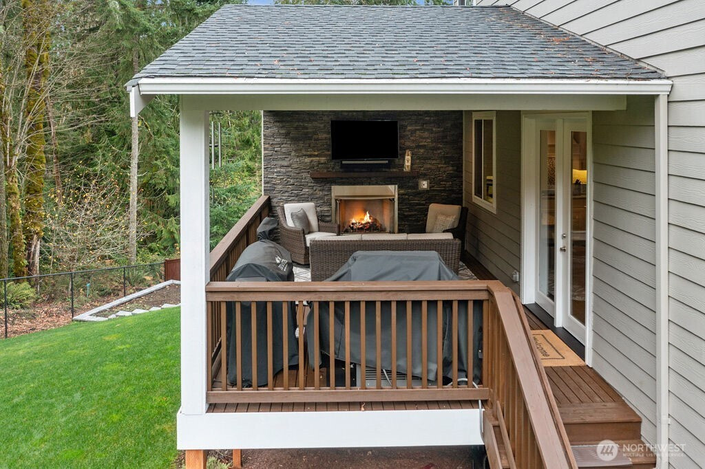 Welcome to Chelsea Park, one of Gig Harbor's premier neighborhoods. This elegant home blends timeless architectural details with modern comfort and convenience. 8-foot iron doors lead into a large foyer adorned with crown molding, accent cove lighting, and wainscoting in the dining room and office. A Great room with oversized windows and gas fireplace leads out to a covered deck also with fireplace. The chef's kitchen features slab granite countertops and custom cabinetry. Upstairs are 4 bedrooms including the Primary suite with 5-piece bath, and 2 flex rooms. The property backs onto a greenbelt, with lush lawn, garden beds, and fruit trees. Close to Gig Harbor High school, commuter routes for Tacoma & Seattle/Tacoma airport.