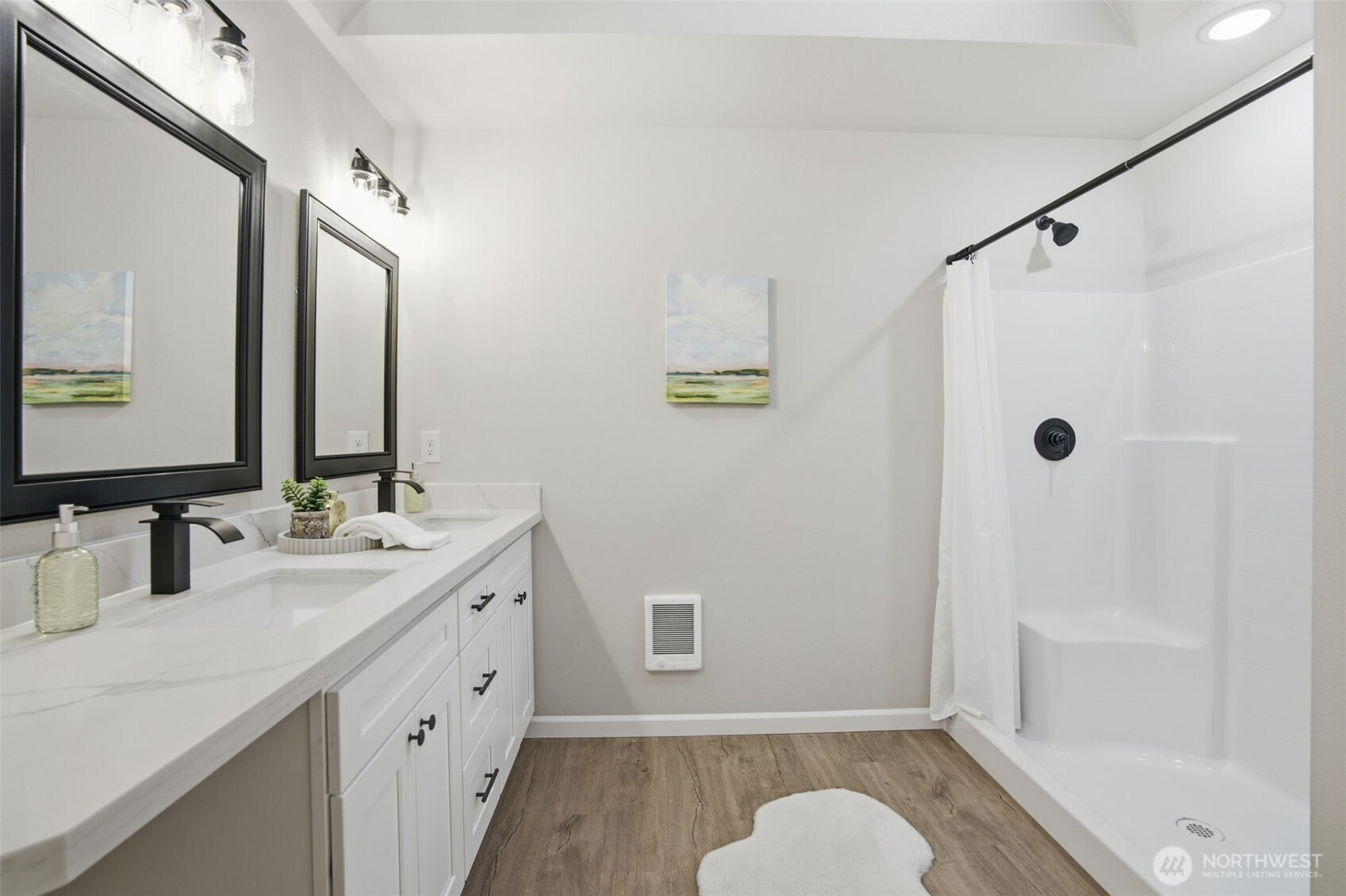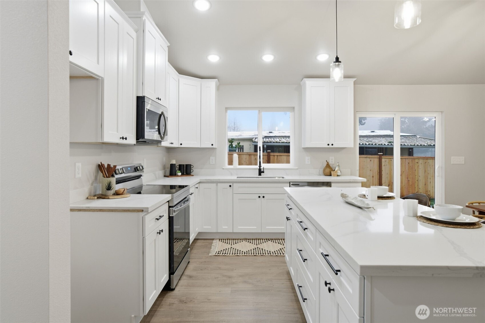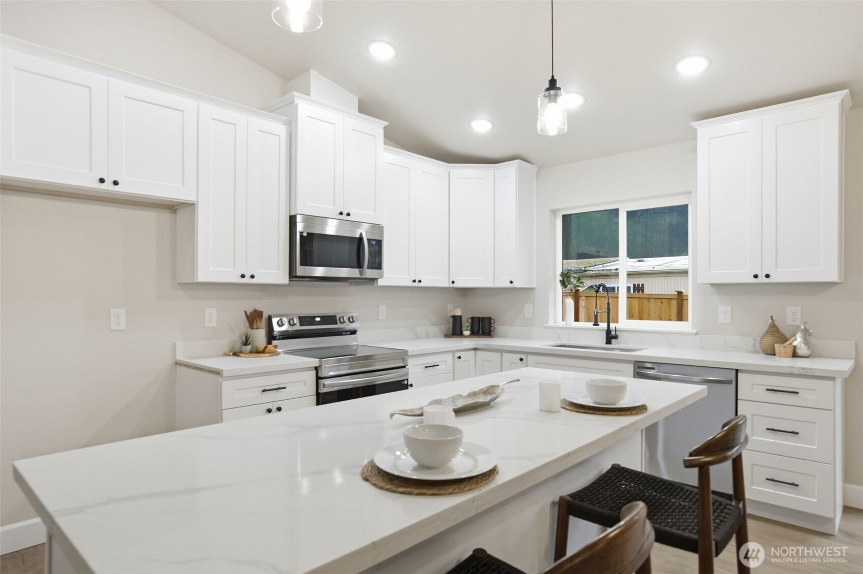 New construction in Graham! This open-concept home offers 1,475 sq ft with 2 bedrooms (septic approved for 2) plus a versatile bonus room with a closet—ideal for a home office, guest space, or hobby room. Vaulted ceilings create a spacious feel, complemented by LVP flooring, plush carpet, beautiful quartz countertops throughout, and modern light fixtures. The kitchen features a large island, brand-new appliances, a pantry, and a sliding glass door that opens to an uncovered back patio and side yard—perfect for indoor/outdoor living. A dedicated laundry room includes sound-dampening insulation. Enjoy the covered front porch with pine board ceiling. Situated on a partially fenced 8,250 sq ft lot with a 400 sq ft garage with garage door opener.
