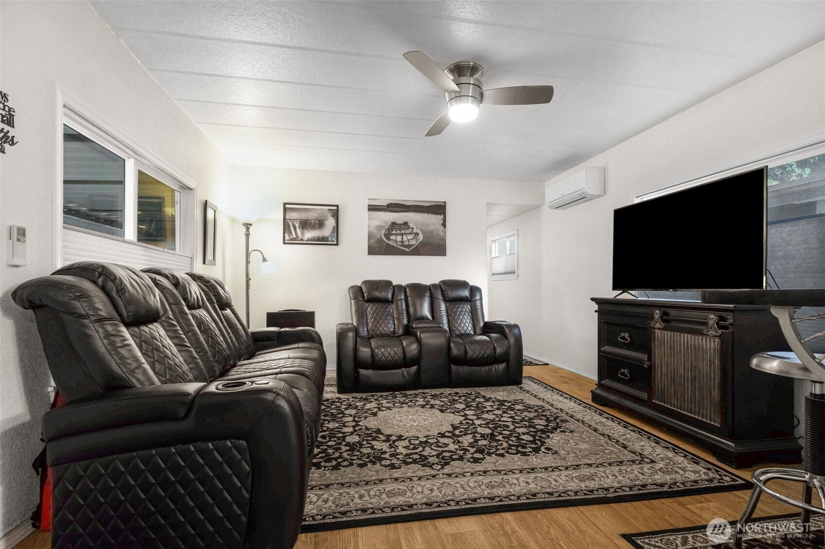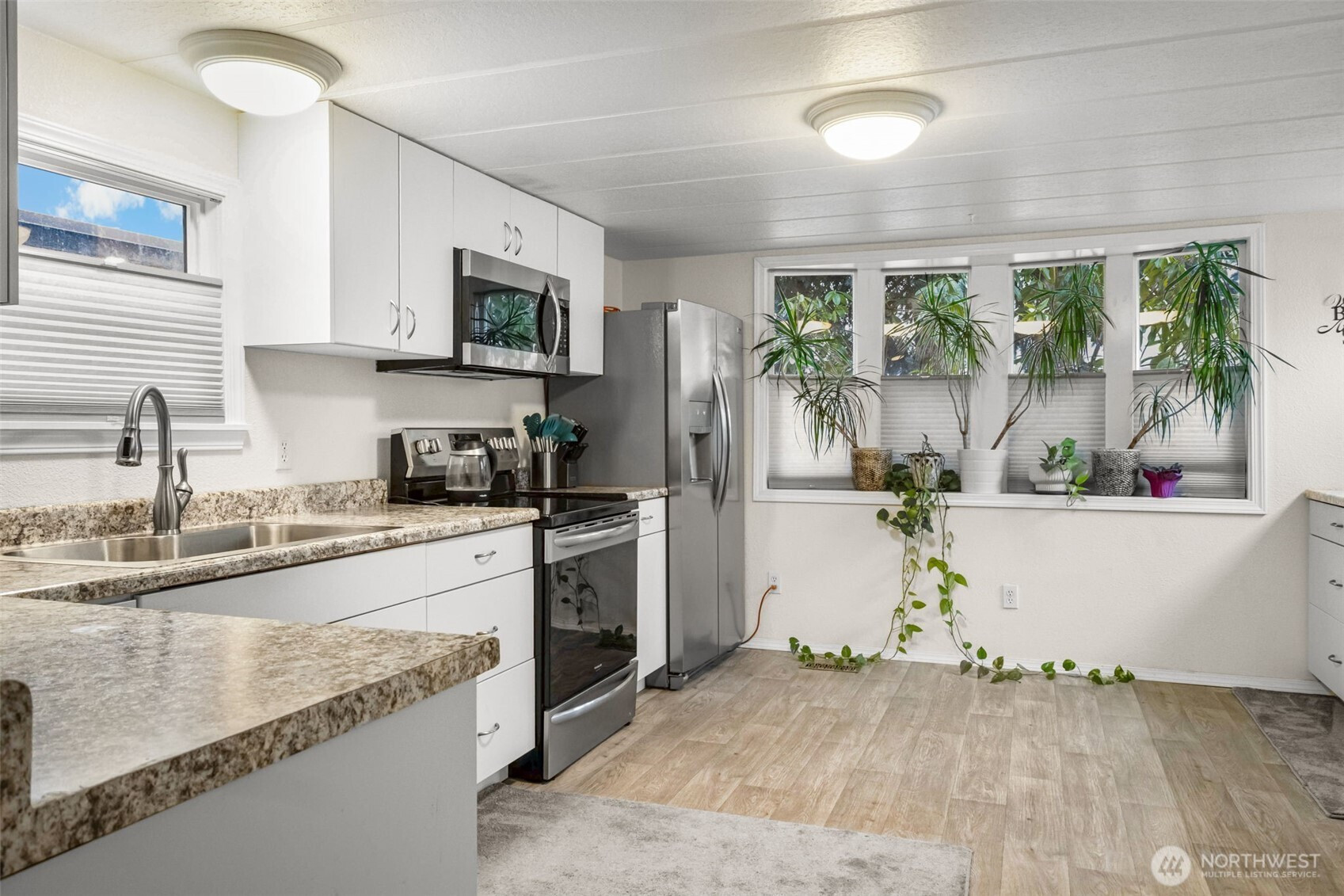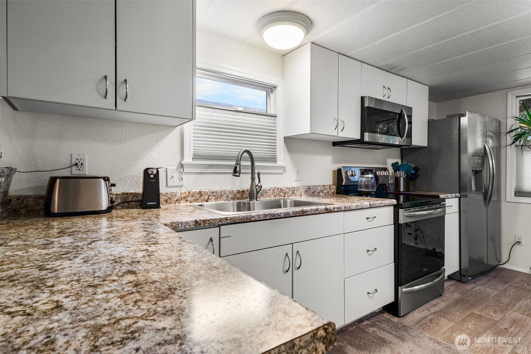 Welcome to this nicely updated and well-maintained home in the Crestview 55+ community. This affordable home offers many recent improvements, including a newer roof, updated insulation and drywall, low-maintenance flooring, and double-paned vinyl windows that bring in great natural light and create a bright, comfortable living space. Both the furnace and mini-split system (with A/C) have been replaced within the last few years. The spacious kitchen features stainless-steel appliances that all stay, while on-demand hot water adds everyday convenience. The bathroom includes a low step-in shower, and the primary bedroom offers direct access to the back deck — a perfect spot to enjoy your morning coffee or soak up some afternoon sun. Crestview is conveniently located near groceries, libraries, and restaurants in both Summit and downtown Puyallup. You’ll enjoy easy access to I-5, SR-512, and SR-167 while still having a quiet, country feel. Space rent $850 per month, and pets under 20 pounds are allowed with park approval.