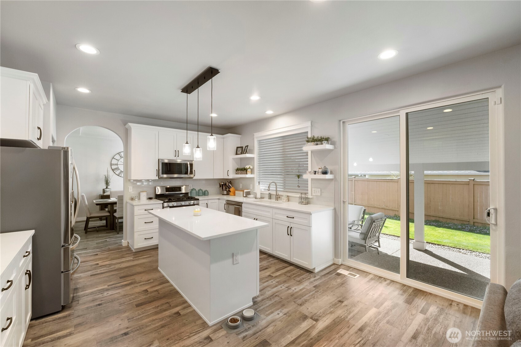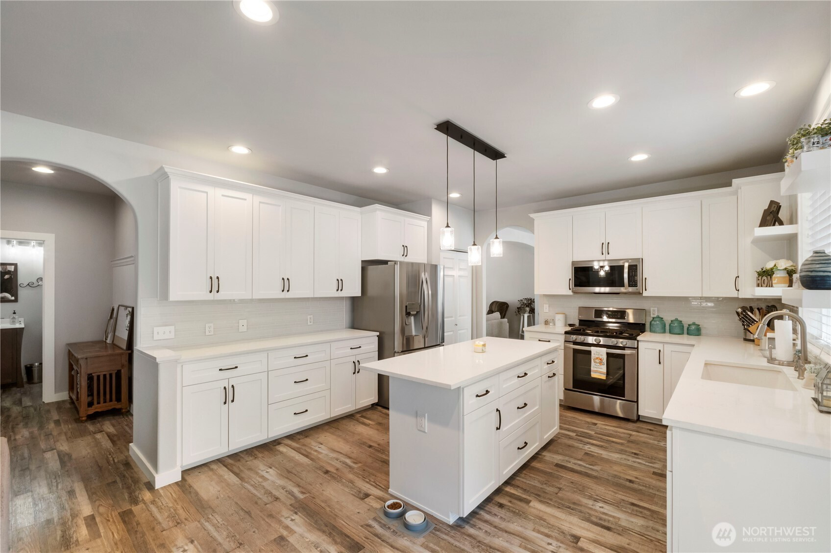 Meticulously maintained home in Lakeland! Exterior house painted, the interior painted, plus inside the three car garage. Newer carpet 2nd floor, new LVP entire lower level, 4 inch real wood trim through out the interior, Graber 2" wooden blinds all window coverings. Enjoy your gas fireplace with new beautiful mantel, shiplap with slate and hearth and recently serviced. New kitchen cabinets with soft close, added kitchen island, quartz countertops, undermounted sink, backsplash, all new appliances, plus new garbage disposal. Primary bathroom refresh, new vanities, mirrors, faucets, lighting, and paint. Guest bathroom complete remodel with tile work, and new features through out. Wood shelving in laundry room. Custom covered patio with tung and groove ceiling, built in lighting with electric plugs. Entire new roof in 2025 with 25 year material warranty and 10 year labor warranty. Duct work cleaned, all upstairs carpet professionally steamed cleaned. Entire new fence and gates. Professionally landscaped yard with sprinkler system. Garage bench and cabinets stay. Five bedroom home, 5th bedroom could be used as a bonus room.