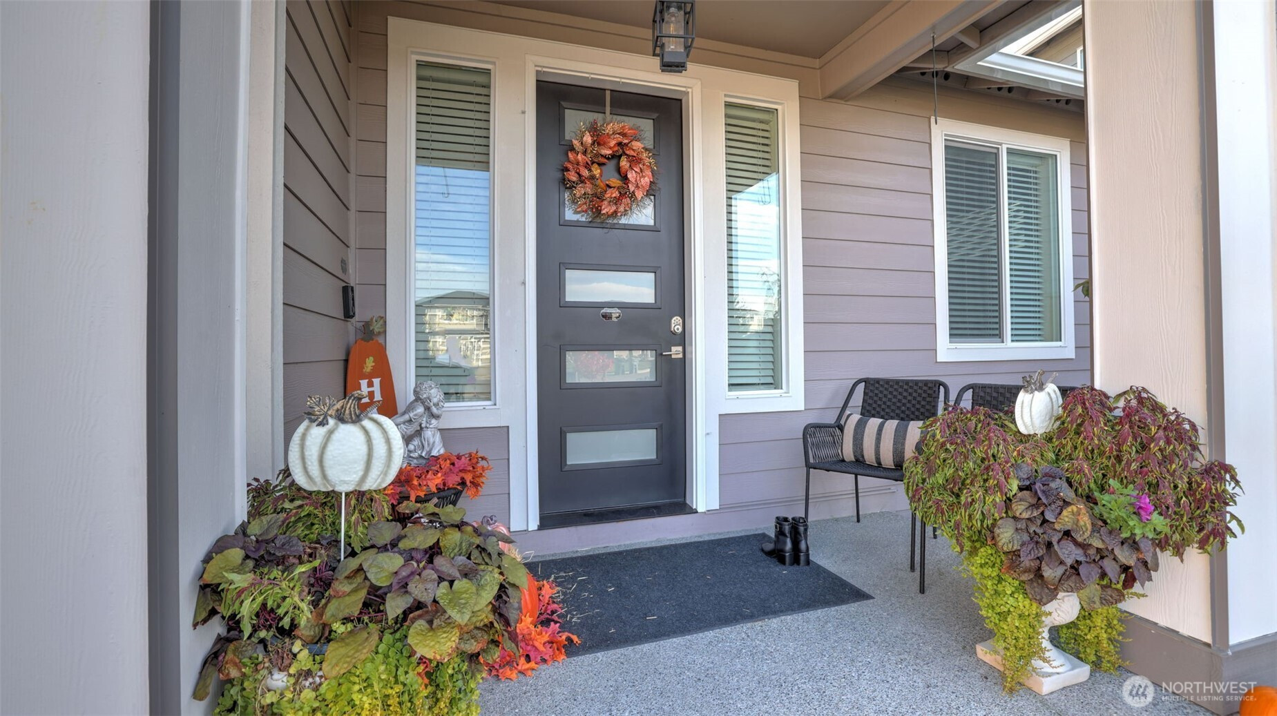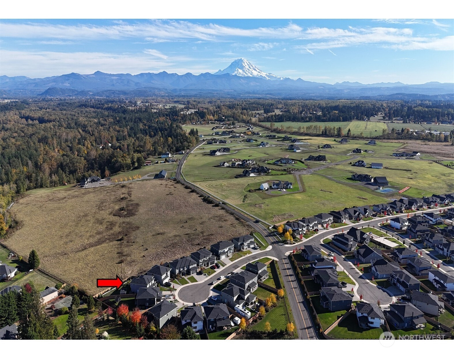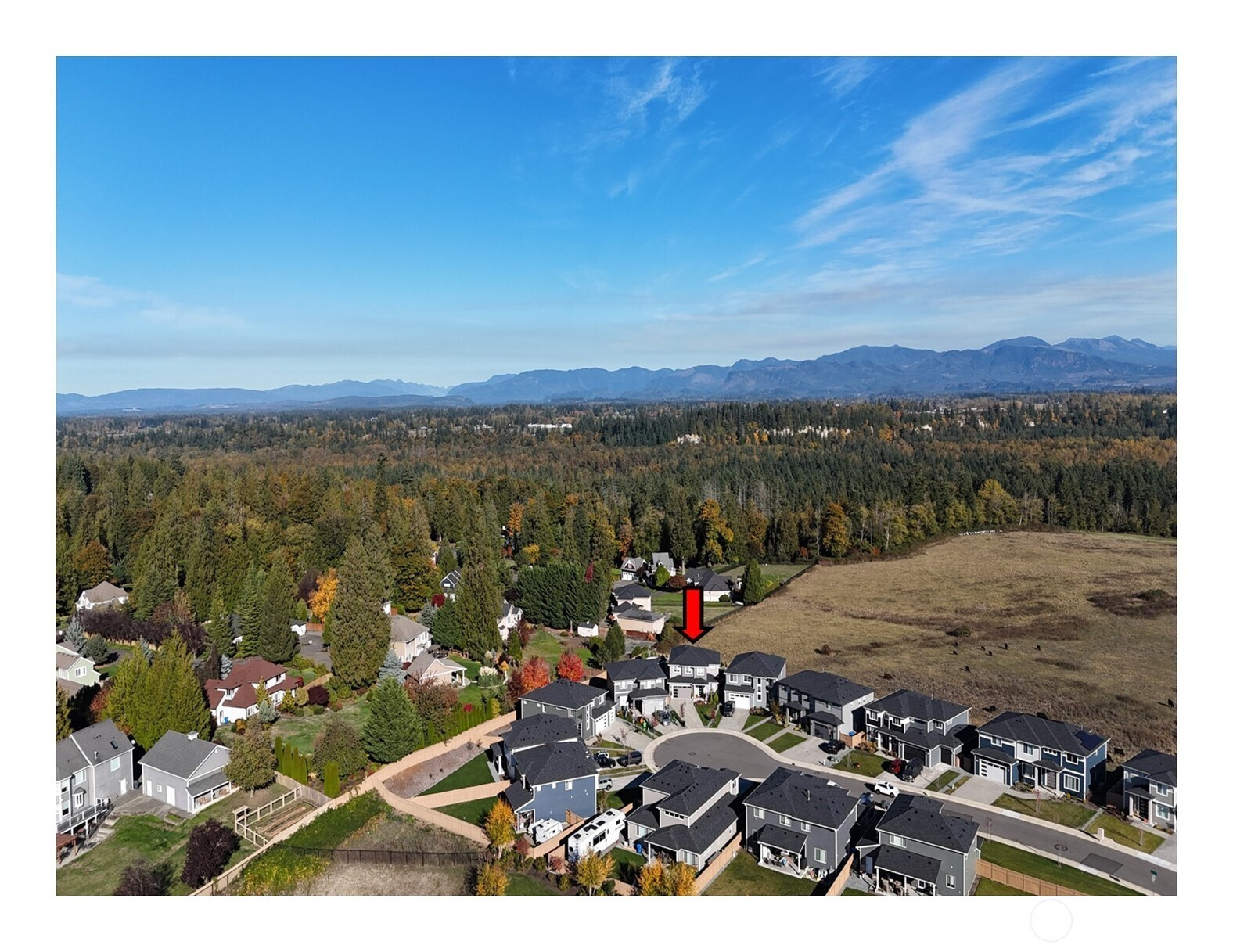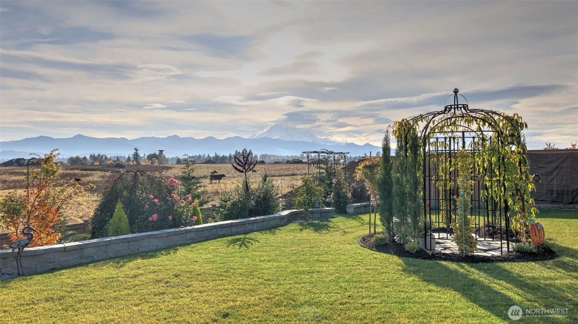 Situated on a prime lot in the beautiful community of Elk Run, this home features incredible views of Mt Rainier. An innovative home design features a main floor Guest Suite w/walk-in closet & private bath. Open concept living with Chef's Kitchen, overlooking the spacious Great Room which features a gas FP. Enjoy outdoor living w/ the oversized covered patio, a beautifully landscaped backyard & views of Mt. Rainier. Features include staircase w/ modern rod iron railing, 2" faux wood blinds, quartz slab counter tops, gas cooktop, walk-in pantry, ceiling fans and more! Upstairs Leisure Room, Tranquil Primary Suite w/ 5PC Bath, & 3 additional bedrooms. 3 car tandem garage and EV charging. Fully fenced yard and stylish outbuilding.