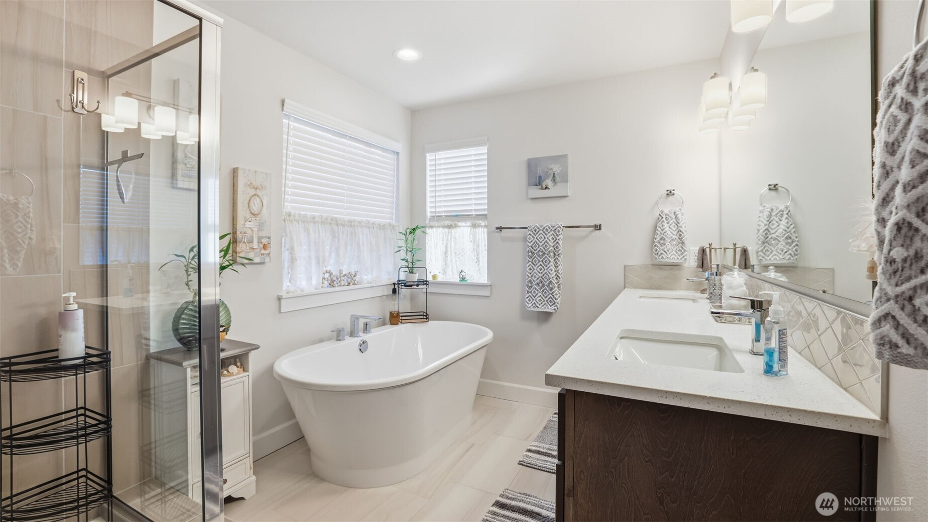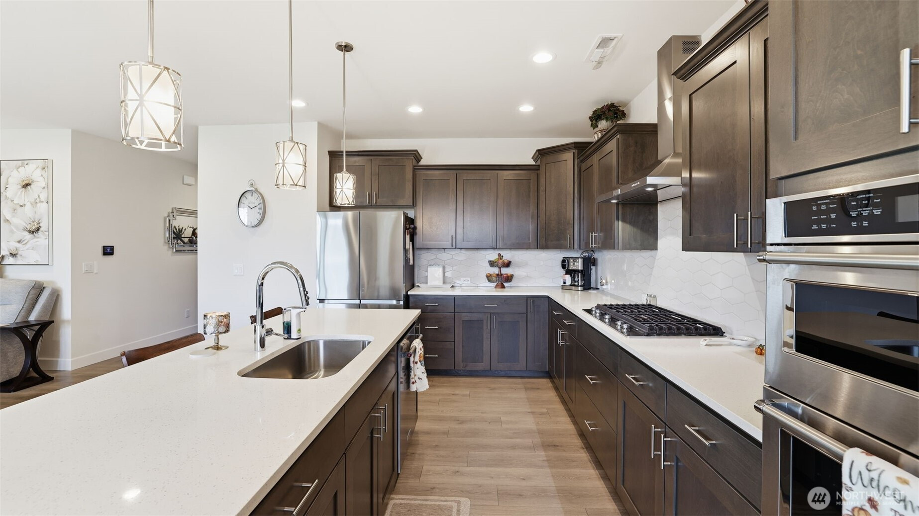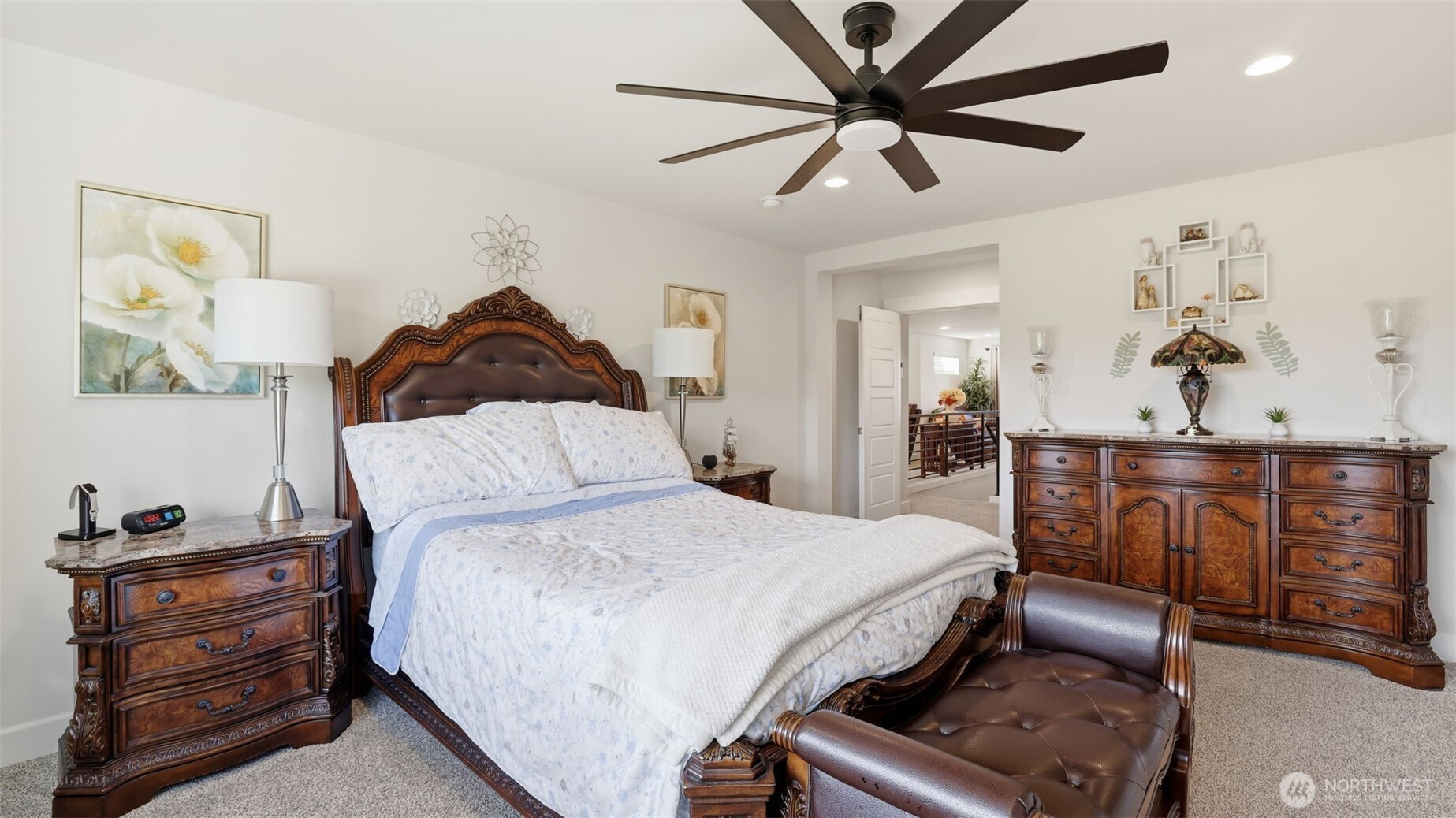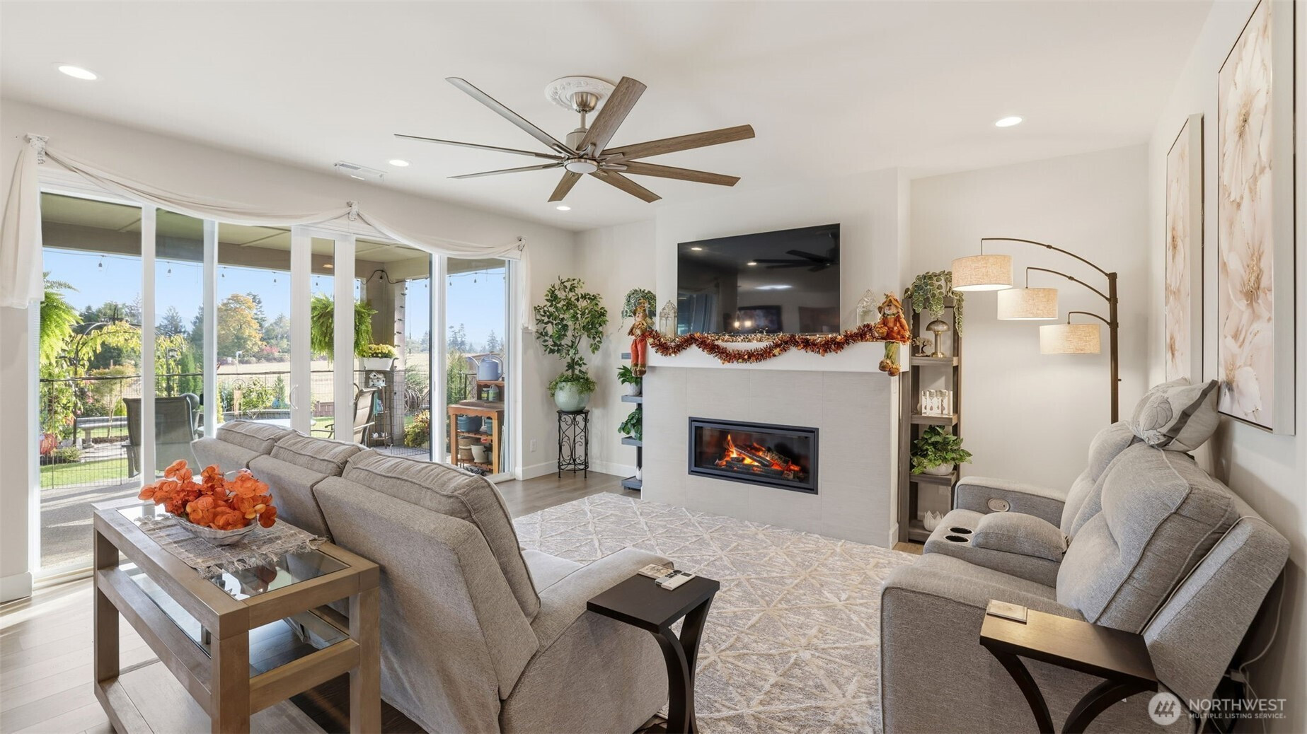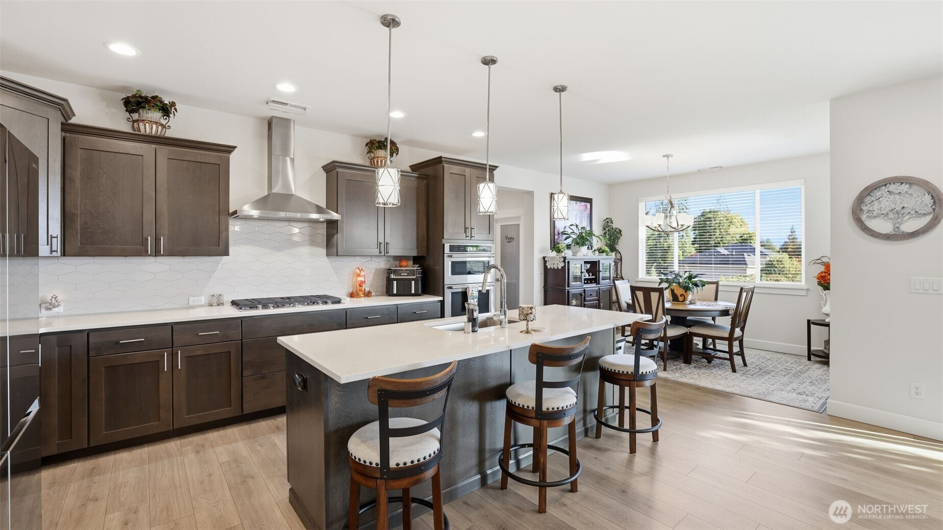 Situated on a prime lot in the beautiful community of Elk Run, this home features incredible views of Mt Rainier. An innovative home design features a main floor Guest Suite w/walk-in closet & private bath. Open concept living with Chef's Kitchen, overlooking the spacious Great Room which features a gas FP. Enjoy outdoor living w/ the oversized covered patio, a beautifully landscaped backyard & views of Mt. Rainier. Features include staircase w/ modern rod iron railing, 2" faux wood blinds, quartz slab counter tops, gas cooktop, walk-in pantry, ceiling fans and more! Upstairs Leisure Room, Tranquil Primary Suite w/ 5PC Bath, & 3 additional bedrooms. 3 car tandem garage and EV charging. Fully fenced yard and stylish outbuilding.