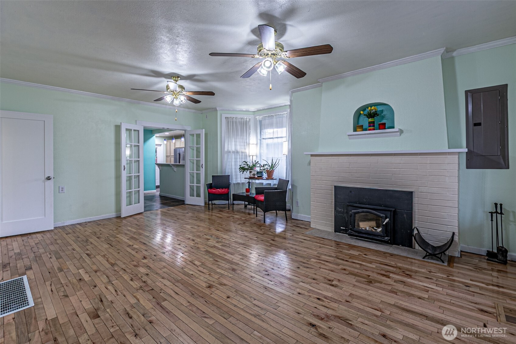 Timeless Charm Meets Modern Living – Circa 1873. Welcome to this stately two-story home offering historic character with today’s most sought-after updates. Elevated from the street for added privacy & featuring a welcoming wraparound covered porch with western exposure, you’ll enjoy stunning sunsets and warm afternoon light. Step inside to soaring ceilings in the grand entryway that opens to spacious living room complete with cozy fireplace. French doors lead to formal dining room, perfectly positioned next to beautifully updated kitchen. Kitchen features quartz countertops, coordinating subway tile backsplash, updated cabinetry, an eating bar & full appliance package that stays with the home. Highly desirable main-floor primary suite includes private ensuite bath. Second bedroom, additional 3/4 bathroom, & convenient utility room complete the main level. Upstairs, you’ll find four additional bedrooms (six total including two on the main floor)along with a three-quarter bath, offering flexibility for guests, home office space, hobbies, or multi-generational living. A pull-down ladder provides access to sheetrock-finished attic with two versatile areas for storage or creative use. Outside, fully fenced yard offers space to relax, play, or entertain. Covered rear porch leads to oversized two-car garage accessed by the alley, with a gate allowing convenient entry into backyard. Move-in ready, solidly built, this spacious home offers endless possibilities to suit your lifestyle.