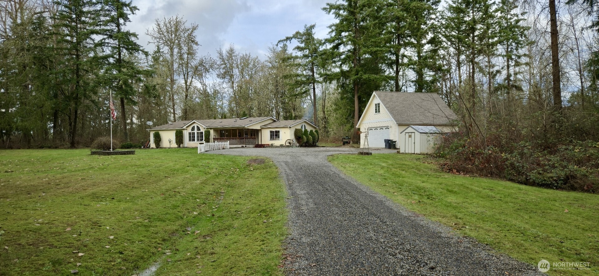 This spacious 2,241 sq ft home sitting on just over 5 acres, offers a very open floor plan with 3 bedrooms and 2 bathrooms, including a generous primary suite with a walk-in closet and 5-piece bath. Enjoy multiple living spaces, a bright, open living room, a large dining area plus kitchen with eating area, and a cozy family room with a wood-burning fireplace and French doors leading to the patio. Waterproof laminate flooring throughout, a detached 2-car garage with loft space. The property sits on just over 5 acres with plenty of room for gardening. A brand-new septic system in 2021, and a private well. Relax and take in the surrounding wildlife from the concrete back patio or unwind on the quiet covered front porch.