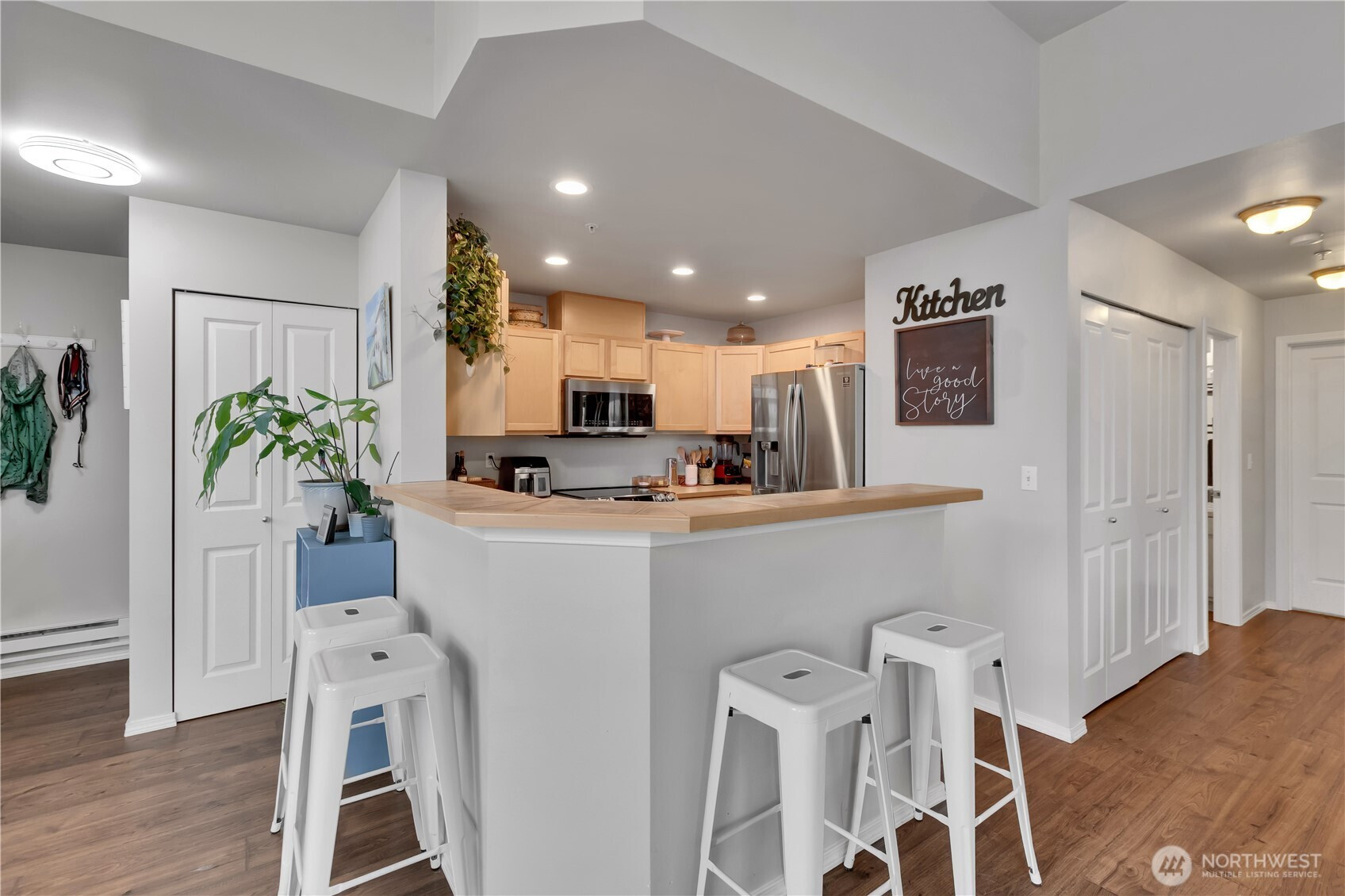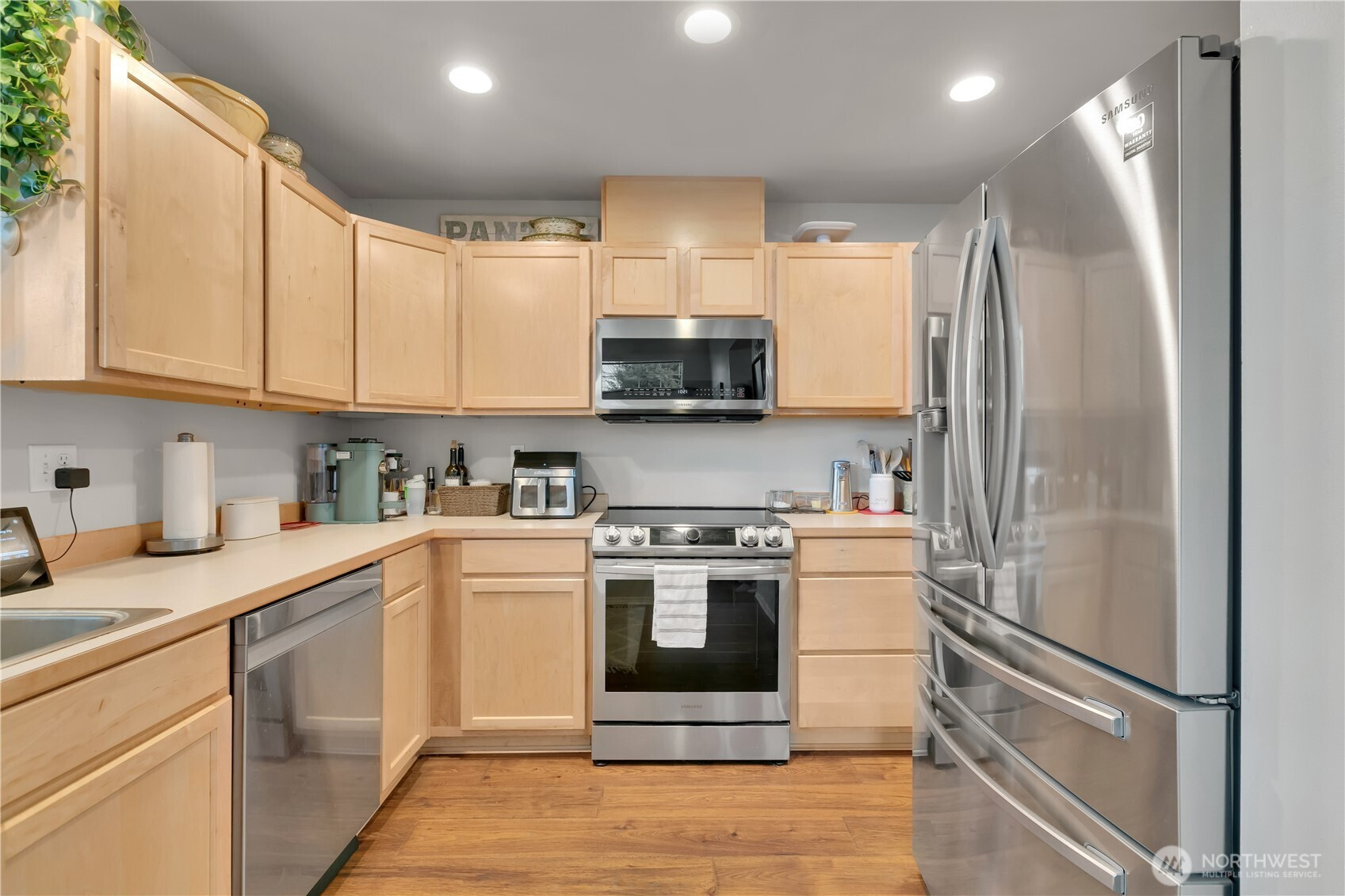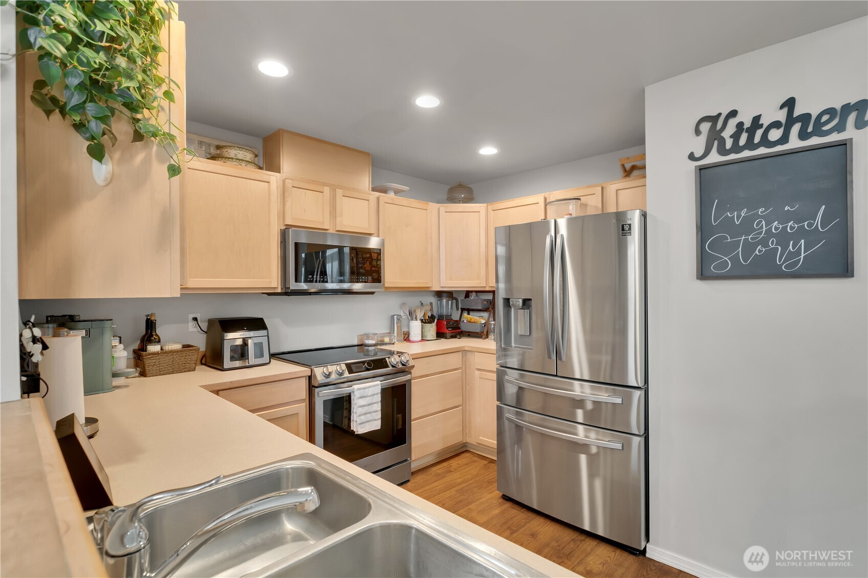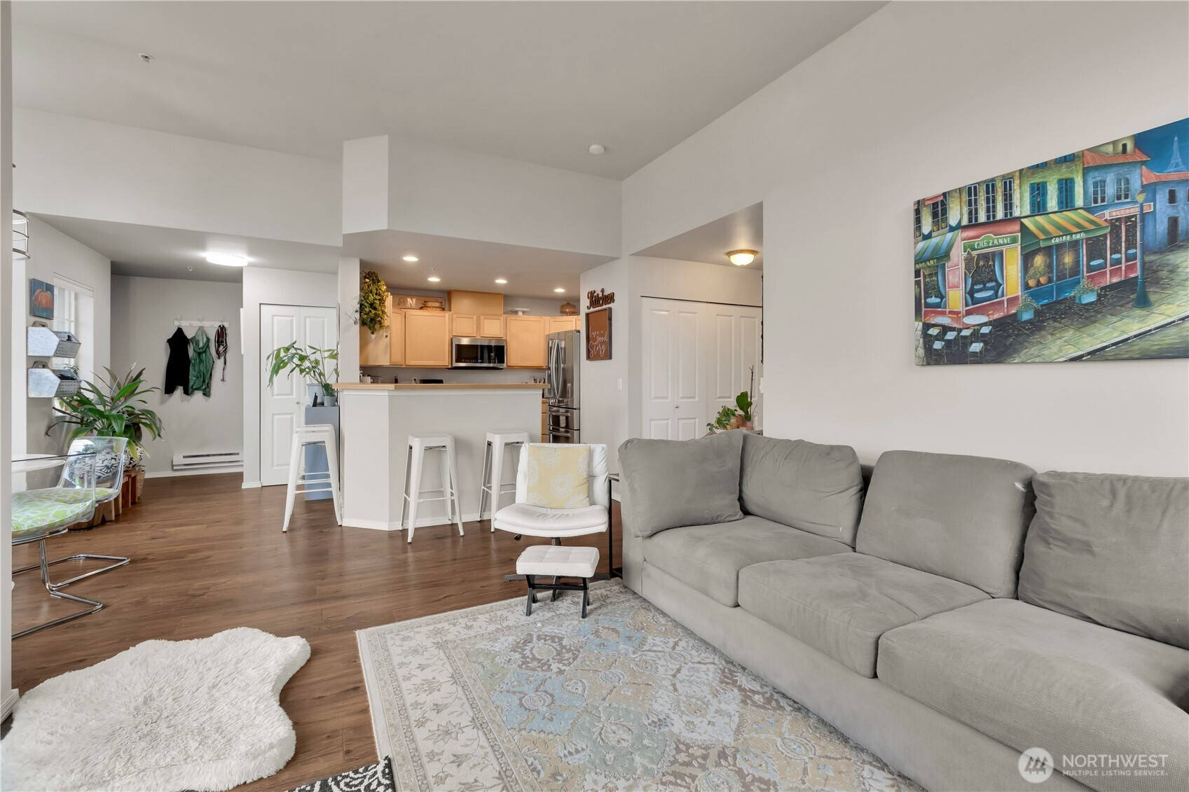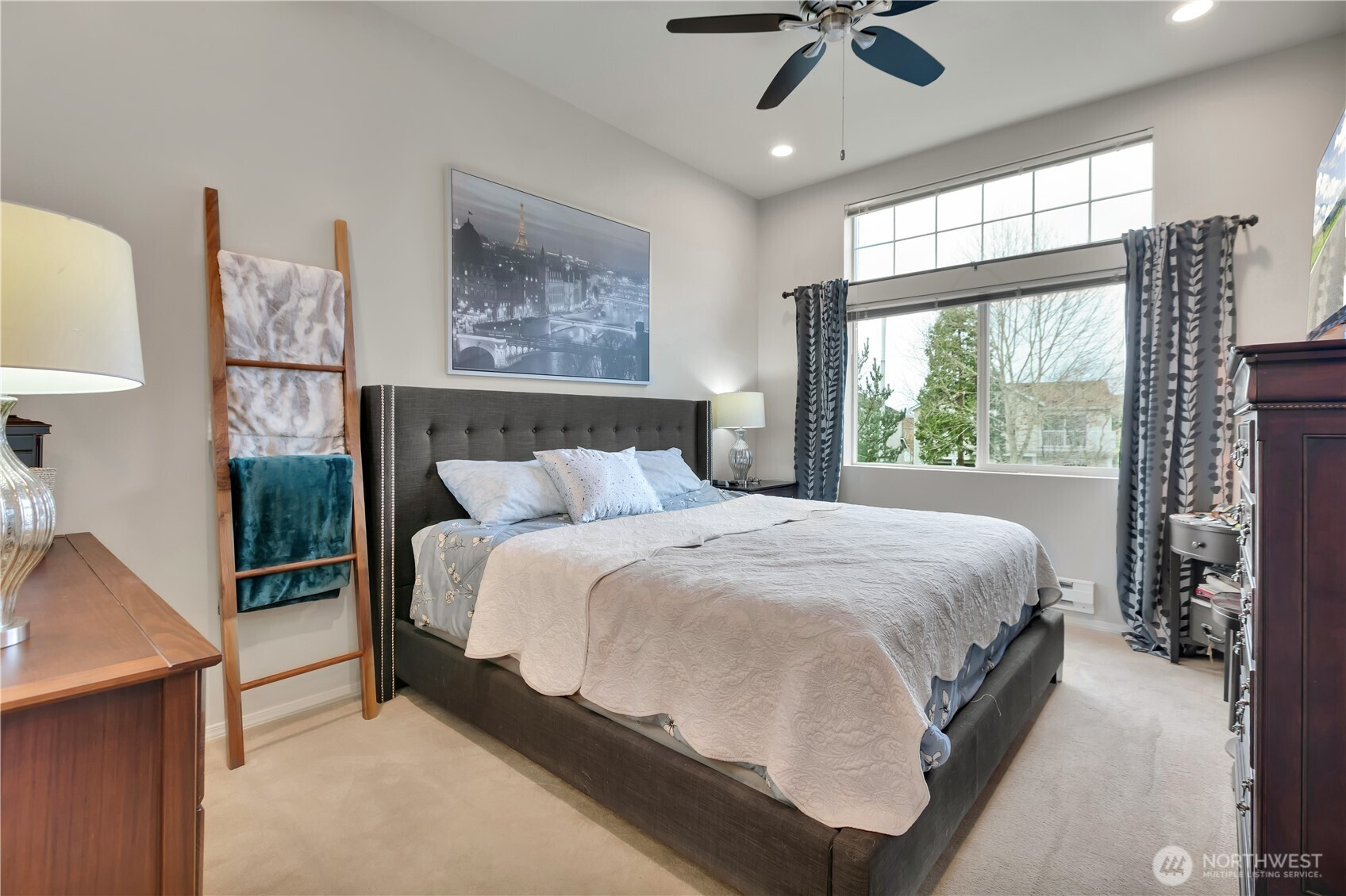 Welcome home to Carrara at Lakeland~ where bright, comfortable living meets a highly desirable community.This top-floor end unit is filled w/natural light & offers a welcoming, open layout. The spacious great room extends to a private deck—ideal for relaxing or enjoying your morning coffee. Fresh, neutral paint throughout provides a clean and modern feel from the moment you step inside. LVP flooring make cleaning a breeze. Unwind by the cozy fireplace or enjoy cooking in the open kitchen featuring maple cabinetry, ample counter space, and new appliances. The primary suite feels spacious w/vaulted ceilings, a walk-in closet, & a private bath complete w/a soaking tub & dual sinks. Close to schools, shopping & easy access to HWY167