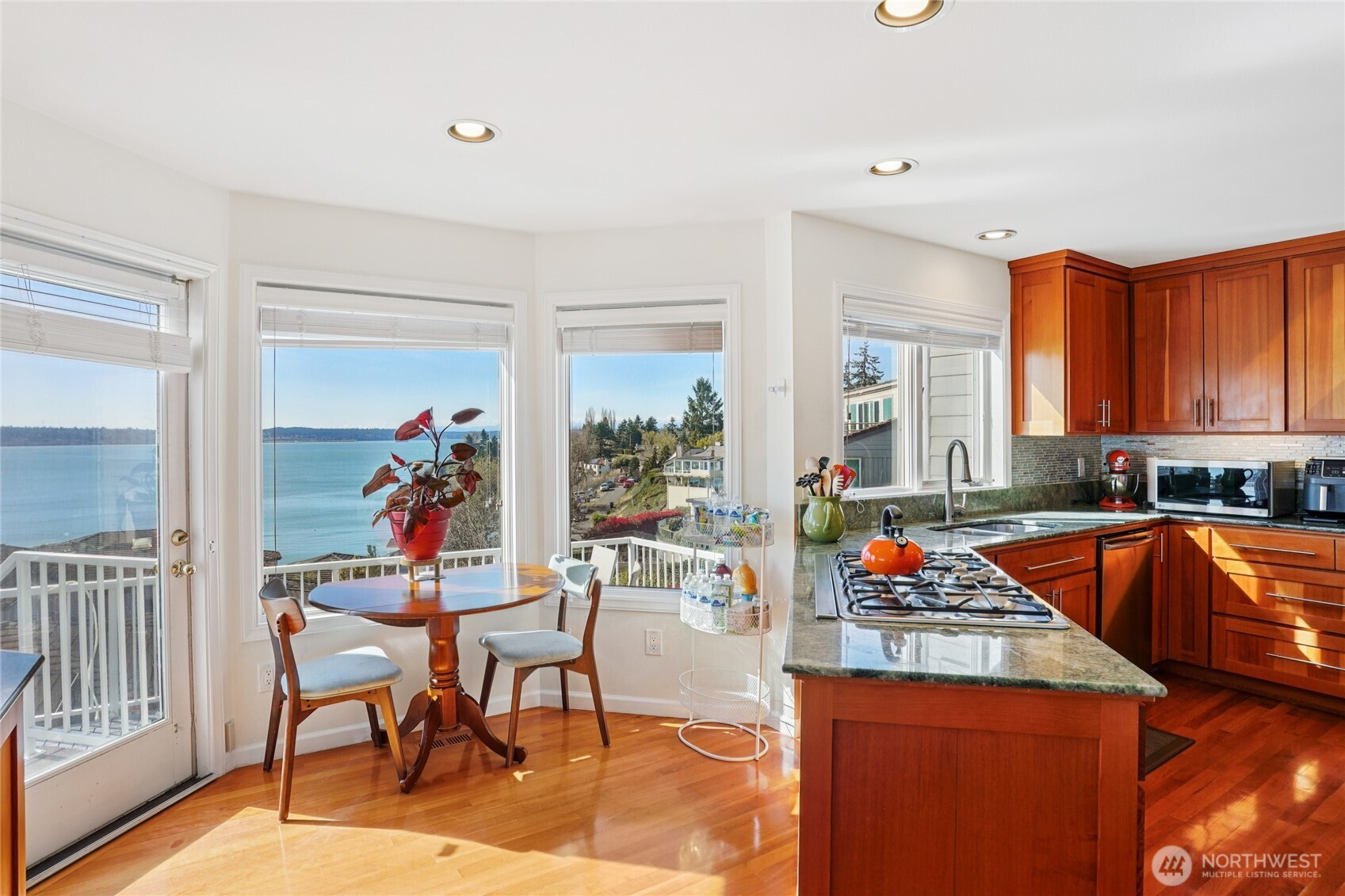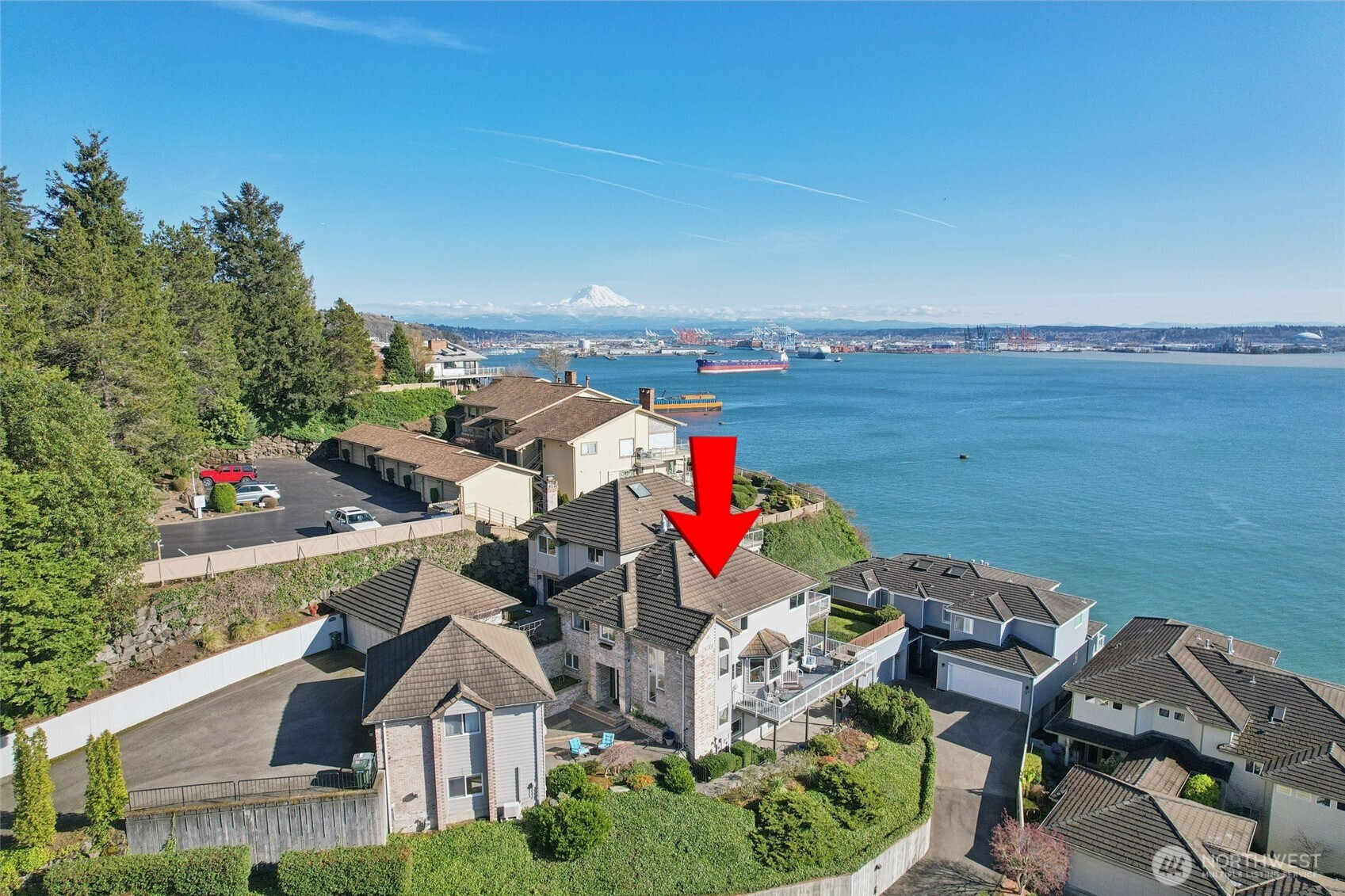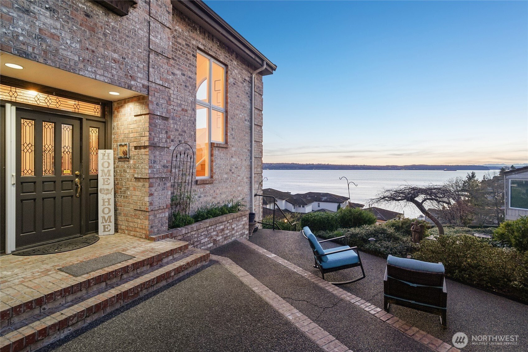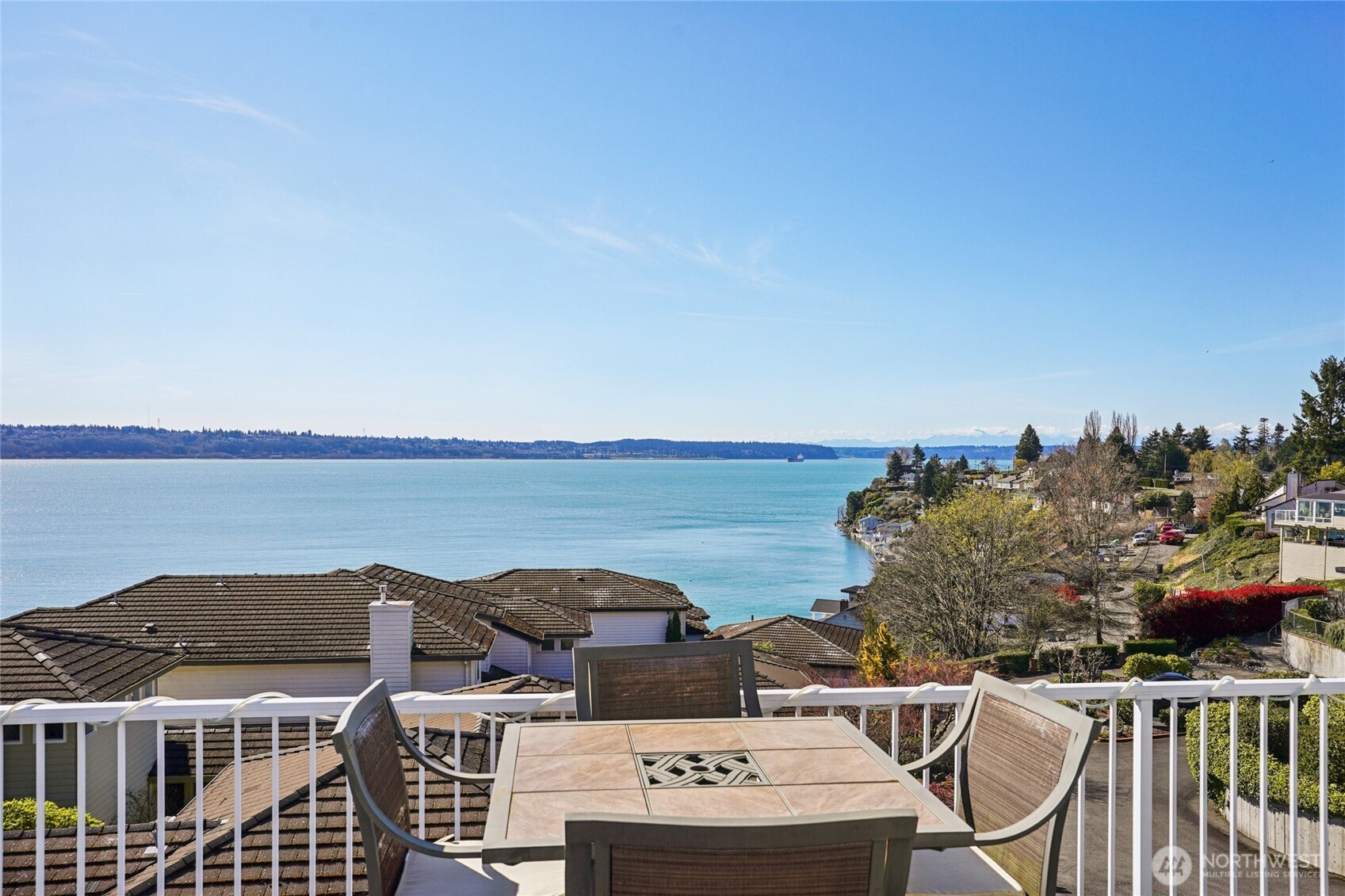Perched for unobstructed, panoramic views of Puget Sound, this multi-level home is a rare find — designed to showcase the scenery from every level. Bright, open living, dining, and kitchen spaces on the main floor feature wood floors and new carpet, all framing breathtaking water vistas. The generous primary suite upstairs includes an oversized walk-in closet, a spa-inspired bath, and a private deck. Also upstairs are two additional bedrooms—one positioned to capture the views—and a freshly remodeled bath. Flexible lower-level living offers comfortable guest space with full-size and king-size Murphy beds. A fully remodeled detached casita adds an independent bedroom, full kitchen, bath, living area, laundry room, Puget Sound views, and its own mini-split HVAC — perfect for guests or rental income. A separate ADU behind the home is ideal for a home office and also has an amazing view of Puget Sound. Outdoor living is exceptional: three private decks, a courtyard, and a peaceful shared green space, all facing the water. Thoughtful updates include new AC and furnace, a stair lift from the garage to the courtyard, a updated half bath, and upgraded closet organization. Two-car private garage. Plus additional amenities. The HOA provides real value by covering weekly garbage and recycling, basic cable, water, outdoor pest control, and partial landscaping — reducing ongoing chores and upkeep costs. Experience maintenance-light living with spectacular, uninterrupted Puget Sound views.