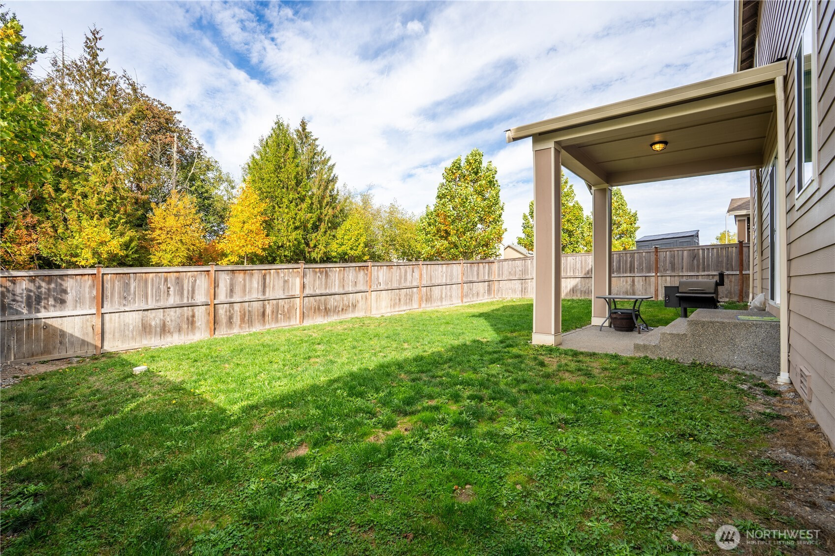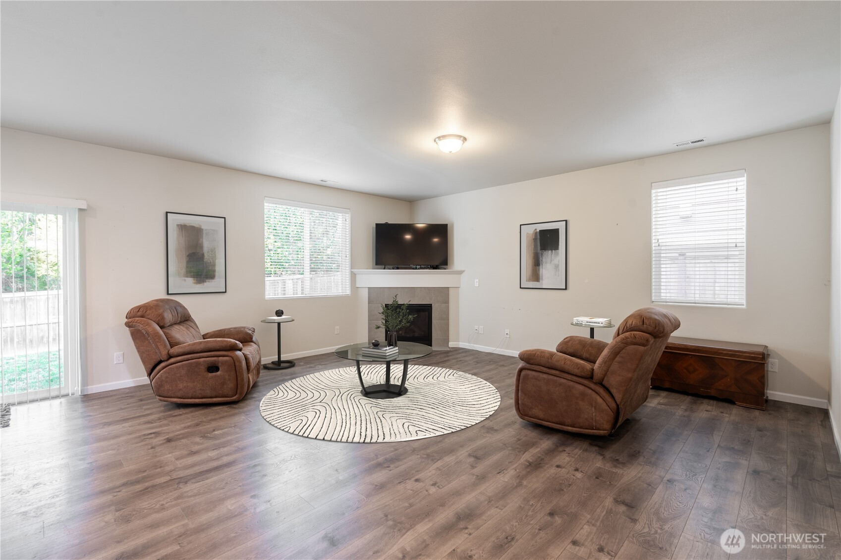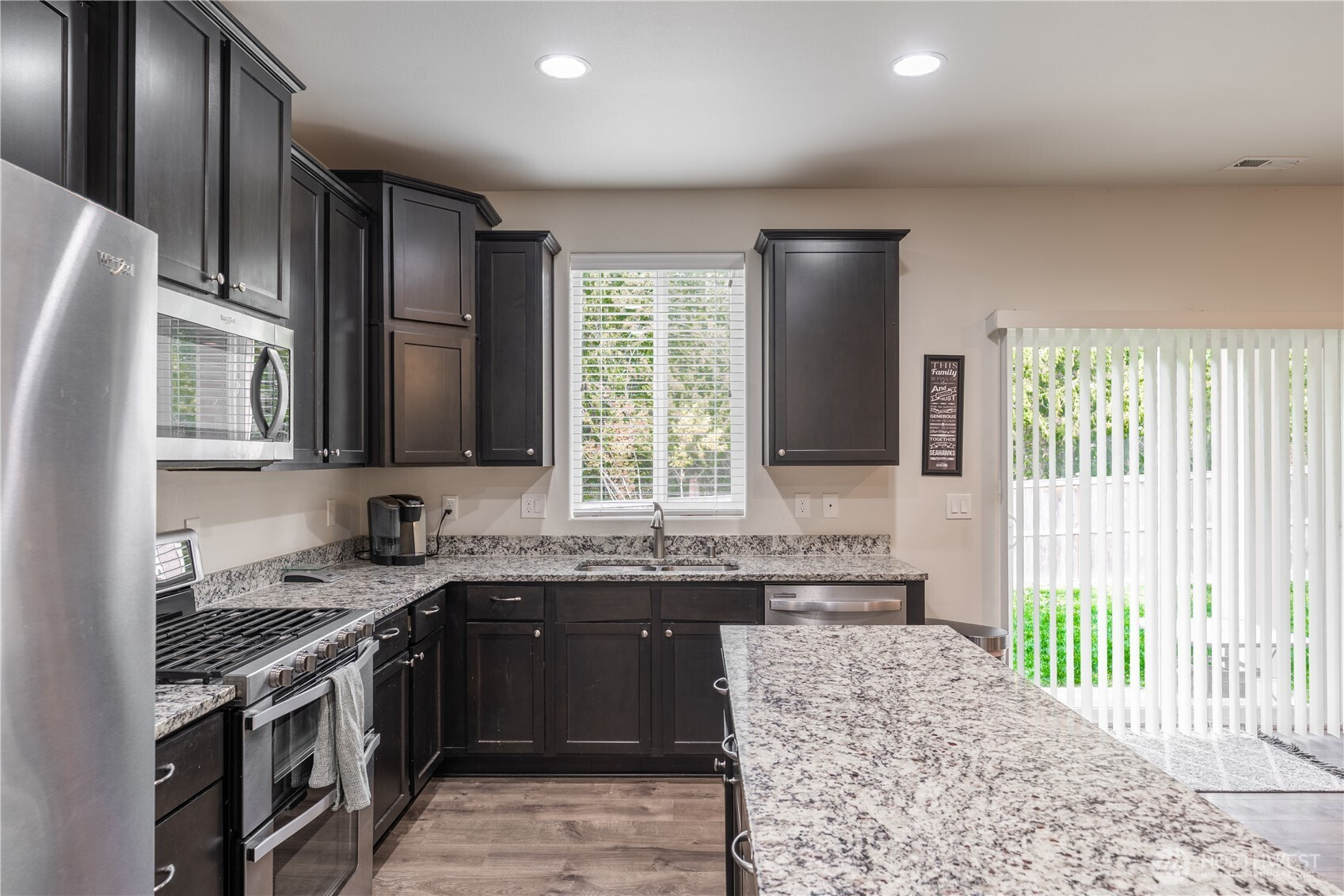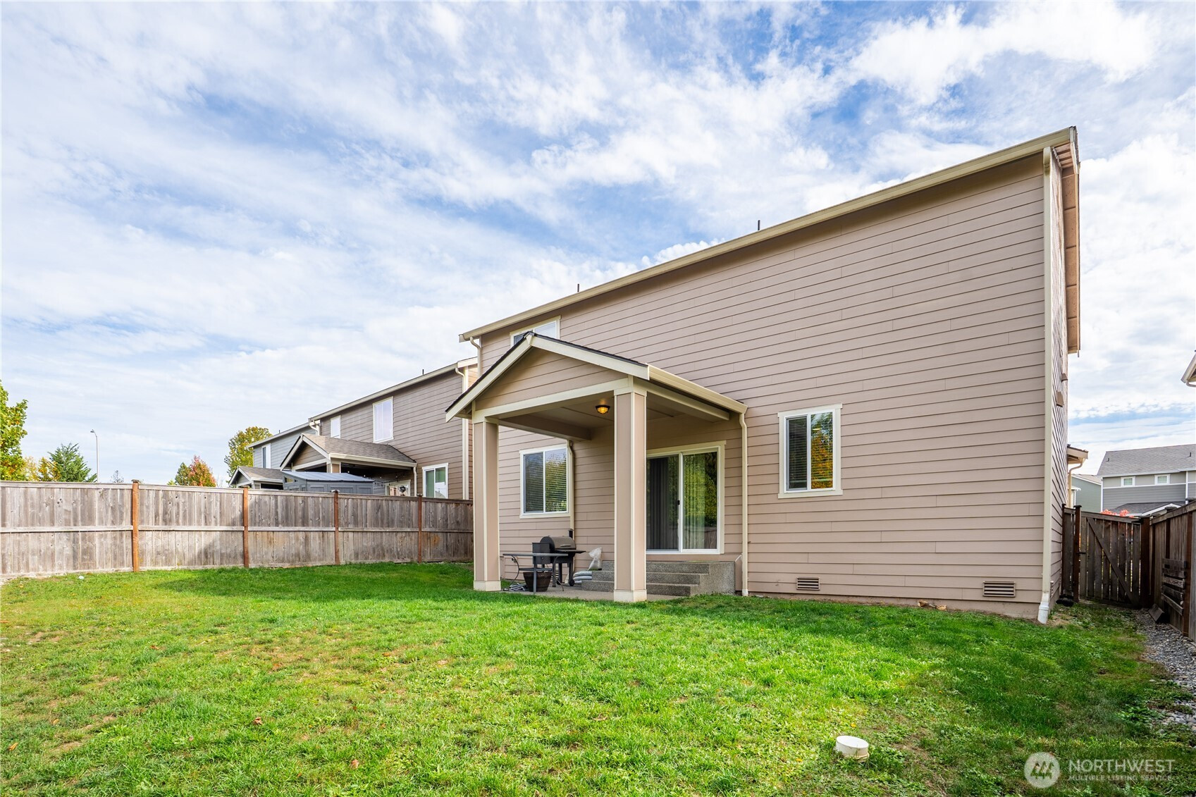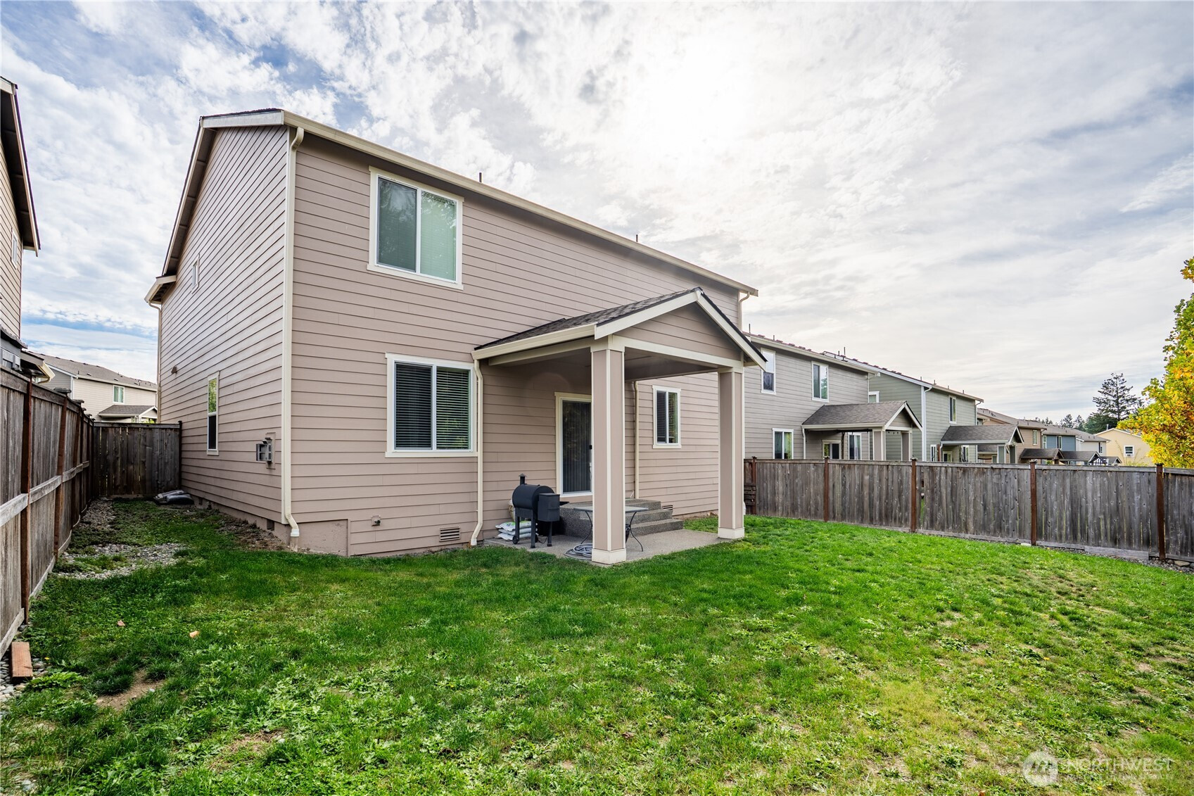 Set your sights on home ownership in Summerwood Park! Beautiful plank flooring greets you & flows to living with corner gas fireplace, dining area & island kitchen with rich cabinets, granite counter tops, stainless appliances & walk-in pantry. Rare main floor guest bedroom & full bath. Upstairs offers loft/flex space. Large primary bedroom with en suite 5-piece bath & large walk-in closet. Generous secondary bedrooms & convenient upstairs laundry. Complete with custom 2 inch blinds. Enjoy the covered outdoor space open to your private, flat, fenced back yard with peaceful scenery. 2-car garage has TONS of storage. Nearby community park. Convenient commute to Hwy 512, JBLM. Centered between Puyallup, Tacoma & Spanaway amenities/resources.