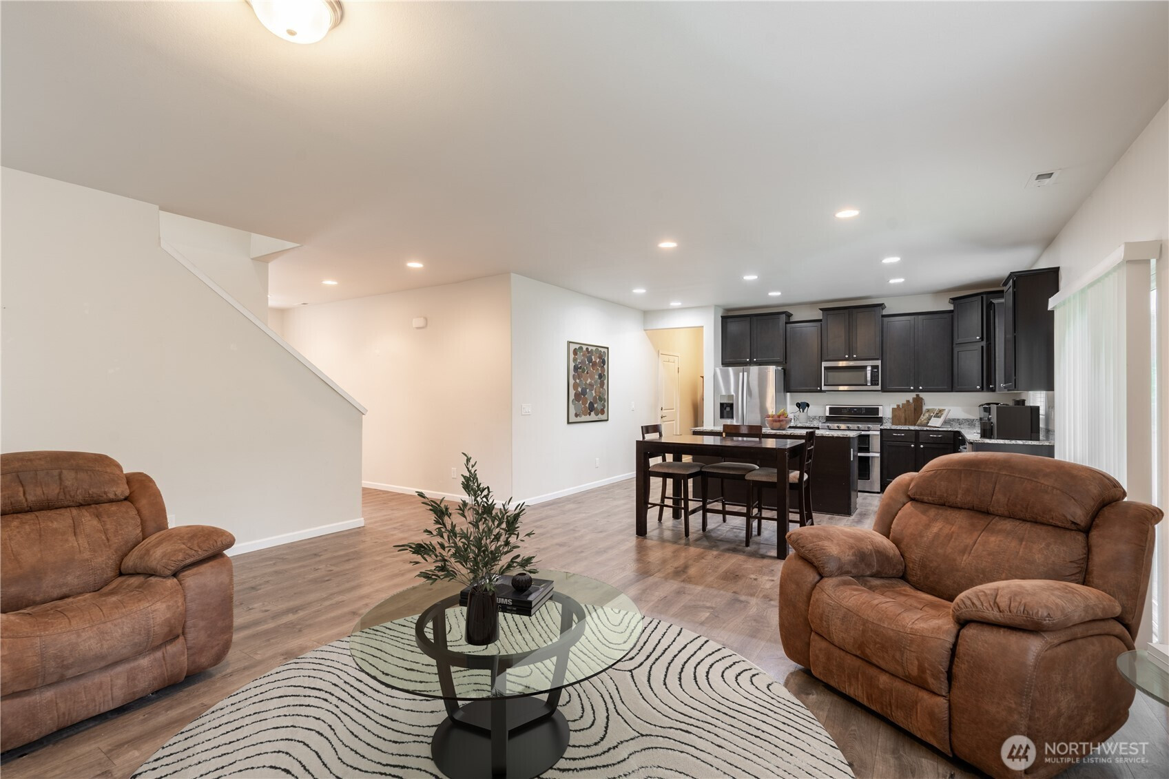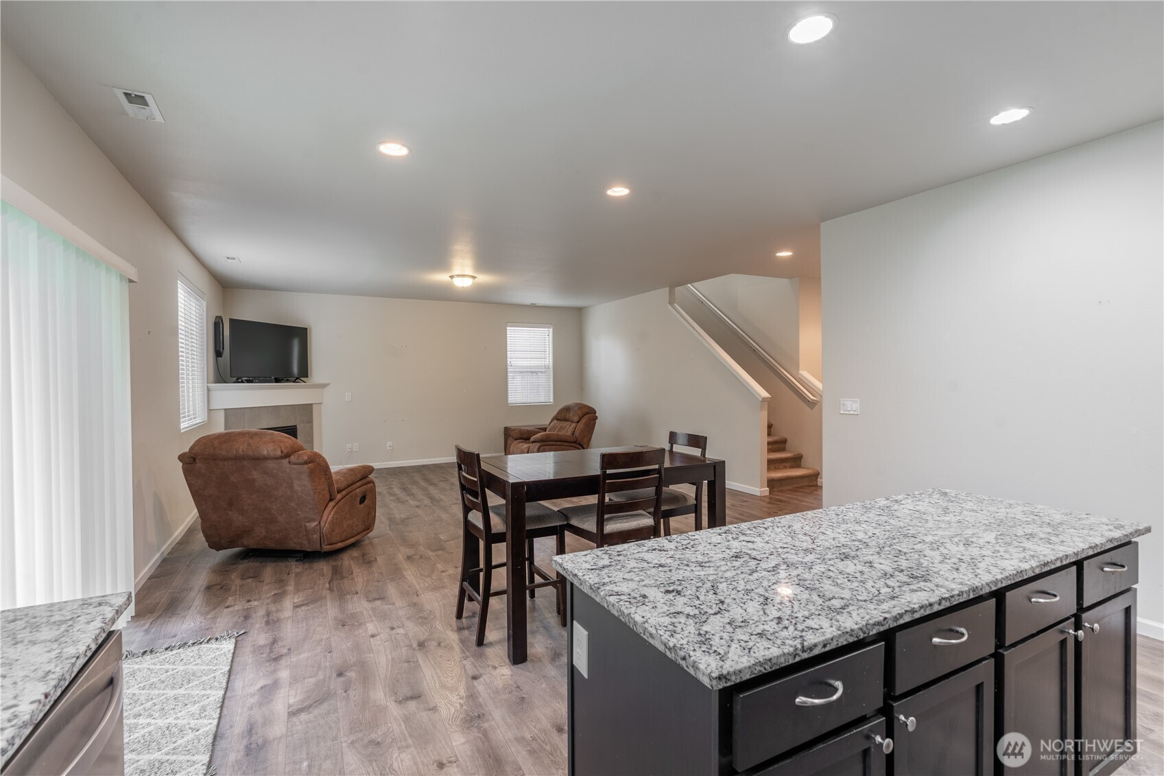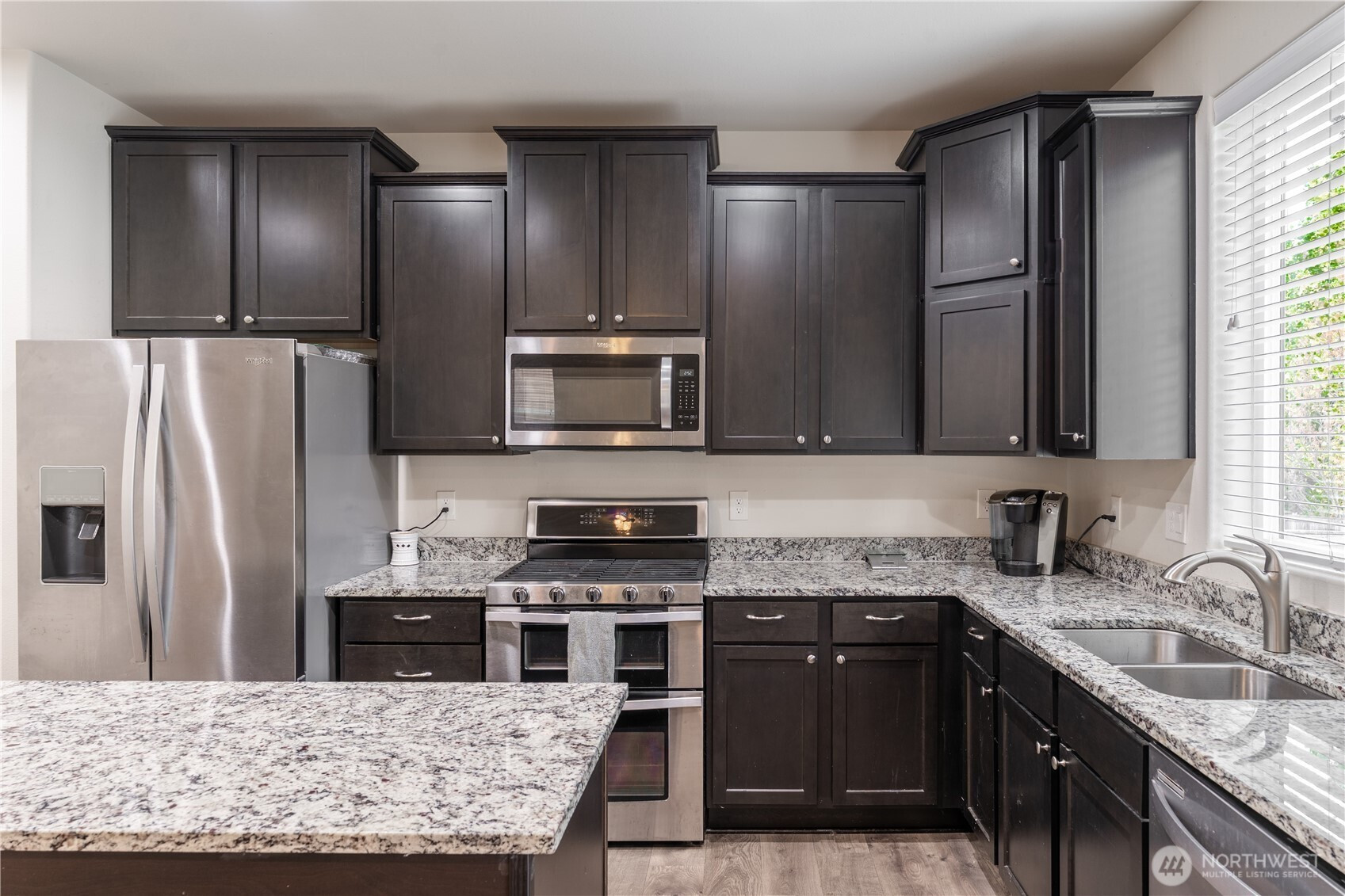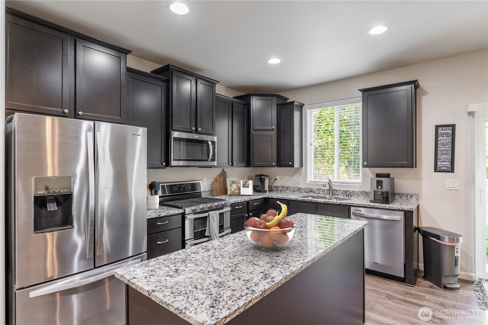 Set your sights on home ownership in Summerwood Park! Beautiful plank flooring greets you & flows to living with corner gas fireplace, dining area & island kitchen with rich cabinets, granite counter tops, stainless appliances & walk-in pantry. Rare main floor guest bedroom & full bath. Upstairs offers loft/flex space. Large primary bedroom with en suite 5-piece bath & large walk-in closet. Generous secondary bedrooms & convenient upstairs laundry. Complete with custom 2 inch blinds. Enjoy the covered outdoor space open to your private, flat, fenced back yard with peaceful scenery. 2-car garage has TONS of storage. Nearby community park. Convenient commute to Hwy 512, JBLM. Centered between Puyallup, Tacoma & Spanaway amenities/resources.