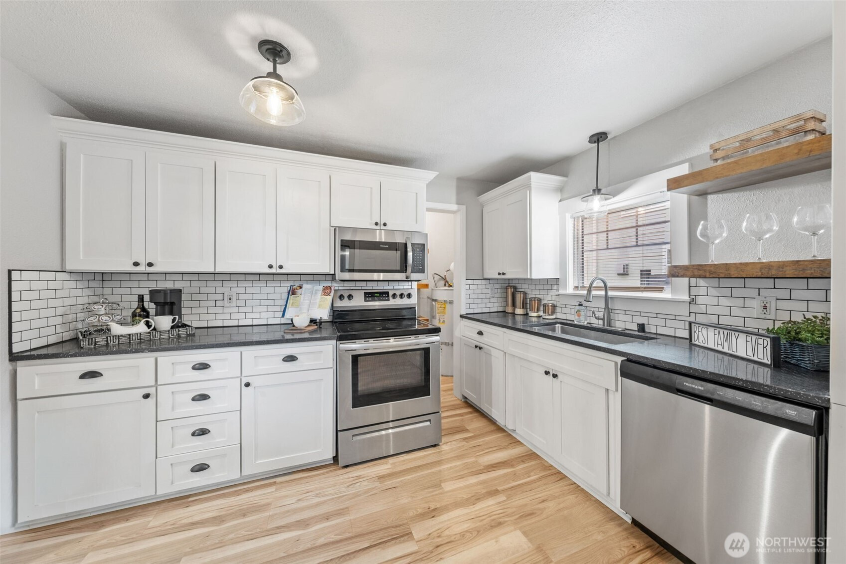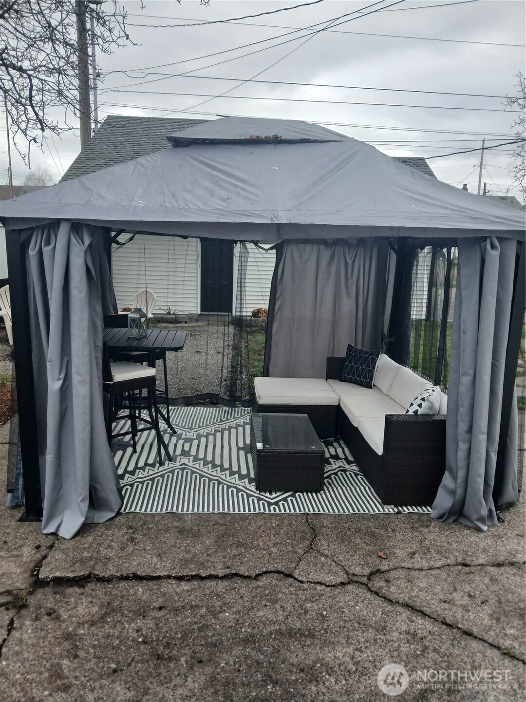 Absolutly move in ready because you get it all! Includes all kitchen appliances, staging in the home & all outdoor w/ new Gazebo & its furniture. Newly updated w/ interior/exterior paint, trex decking front porch, LPV flooring, tile bathroom, quartz kitchen counters, black fixtures, new roof 8 years ago, large fully fenced yard w/ new flower beds & new front grass, rest of grass in back yard has been seeded & should fill in spots soon w/ growth. Garage is oversized w/ a shop area that could easily be turned into an ADU for extra living or rental income. Extra parking outside of garage for 2 more cars. Close to shopping & easy freeway access. Be in your new home before the holidays w/ no stress of even having to buy furniture or decorate.