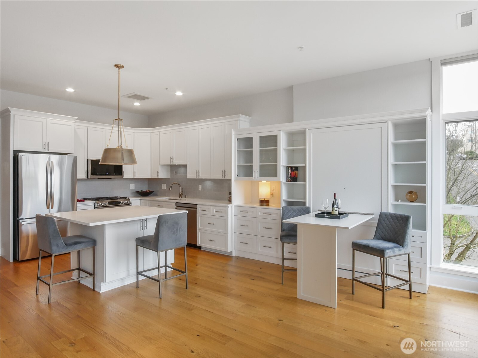 Welcome to the coveted "The Roberson". Secured Grand Lobby Entrance features local Art displays. 5th floor 1 bedroom, 1.5 baths unit lives like a 2 bdrm w/built in Murphy bed & pull down multiple use table/desk. Great room concept with over $70K in upgrades & remodeling. Newer HVAC interior exchange unit tied to the HOA monitored HVAC Roof unit. SS appliances, expanded kitchen island seats 4, soft close drawers, designer lighting & recessed LED LIGHTS. Added built-in's for storage and closet organizers throughout. Primary bdrm w/walk-in closet, full bath w/heated flooring. Balcony to relax and enjoy the views of the city, night lights, mountains & fireworks off the bay. Experience the open air Tuscan style Courtyard Fountain all year around with lush landscaping. Curl up with a book or connect with your Roberson Community at any of the monthly Summer concerts just outside your unit door. Work out in the gym and have gatherings in the Owners lounge. 1 secured garage parking space #53 accessed of 7th St. Site is ideally located within walking distance to the New Tacoma link, that stops at the Tacoma Dome and connects you to the Sounder Train to Seattle. Walk to shops, restaurants, night life, spa's parks and the Theater District. Rental cap is 8. EV chargers approved, insulation begins 3/27/26.