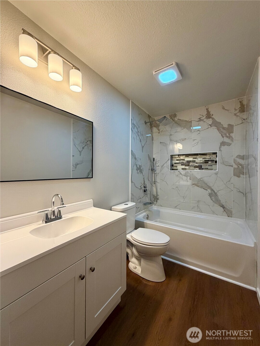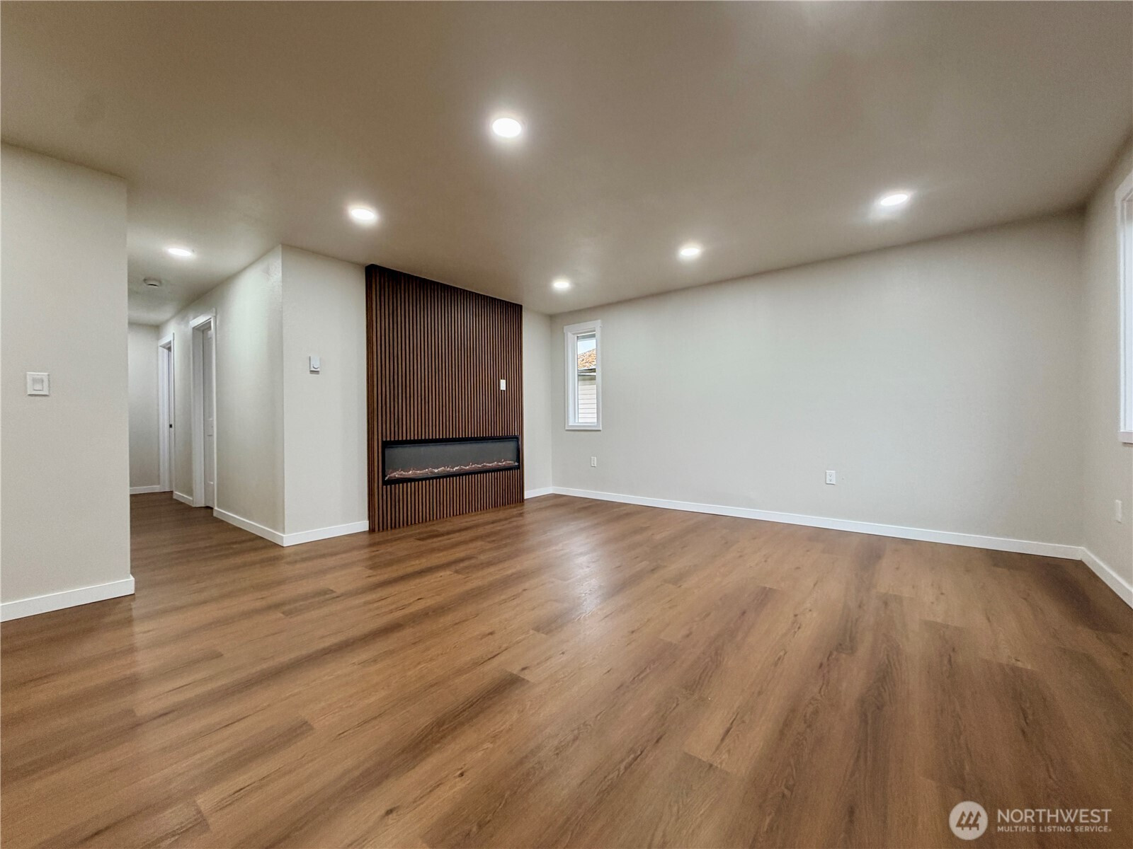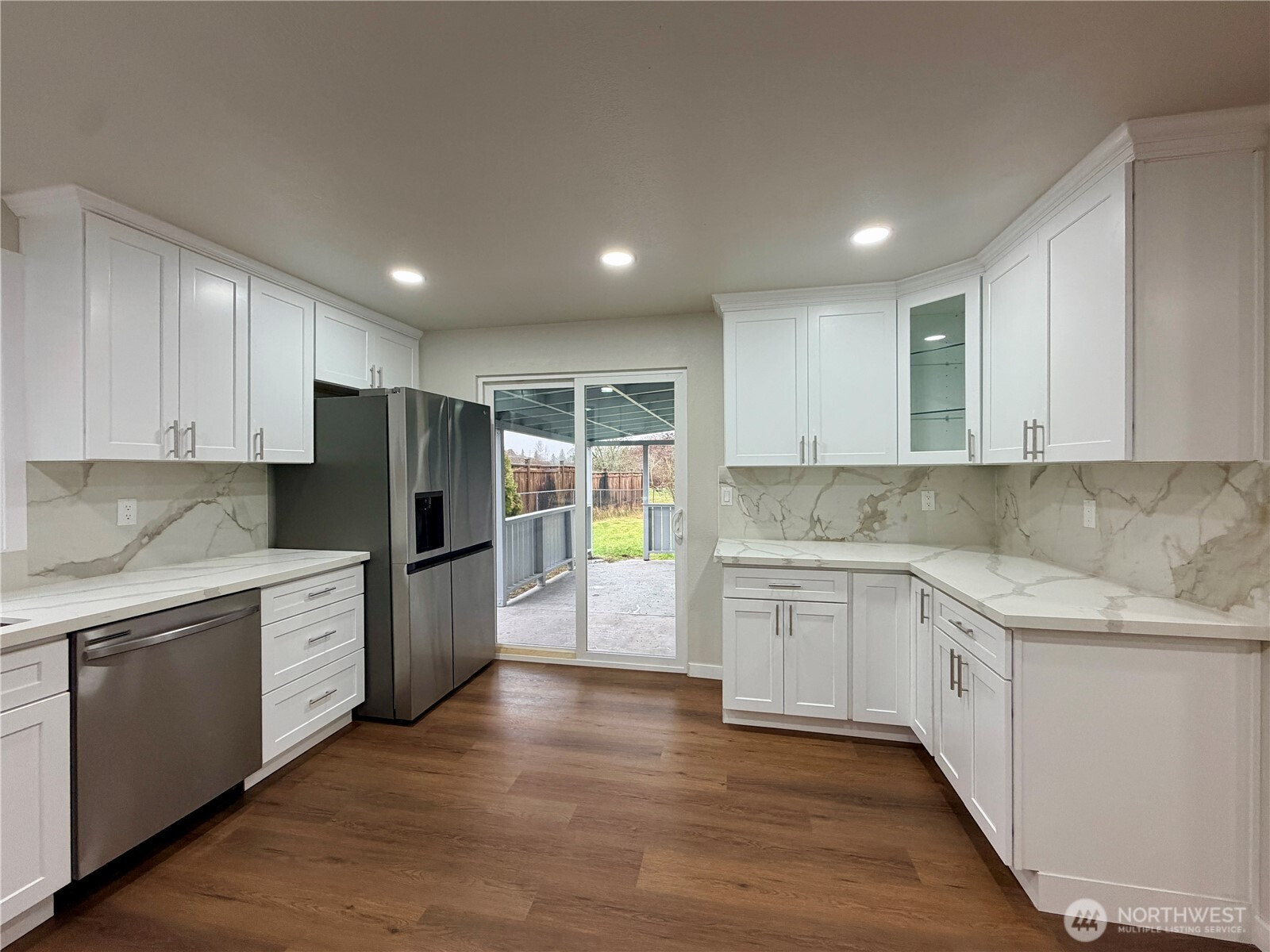Updated rambler home with a huge backyard and covered patio. Home features a bright open floor plan with nice upgrades. Beautiful designed fireplace, new kitchen cabinets, new quartz counter tops and backsplash, stainless steel appliances, new vinyl plank flooring, painted millwork and doors, recessed lighting, tile tub surrounds in bathrooms, new lighting and plumbing fixtures.