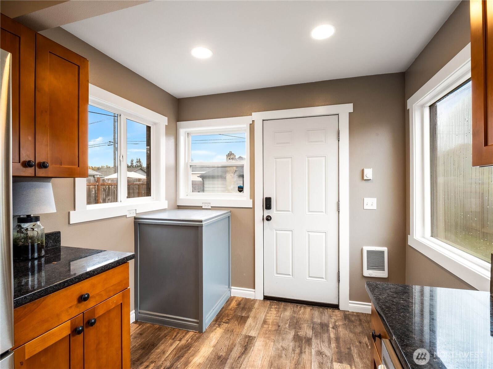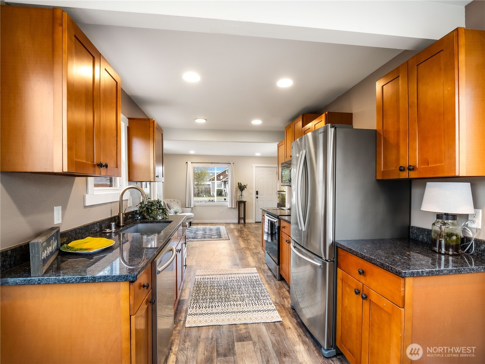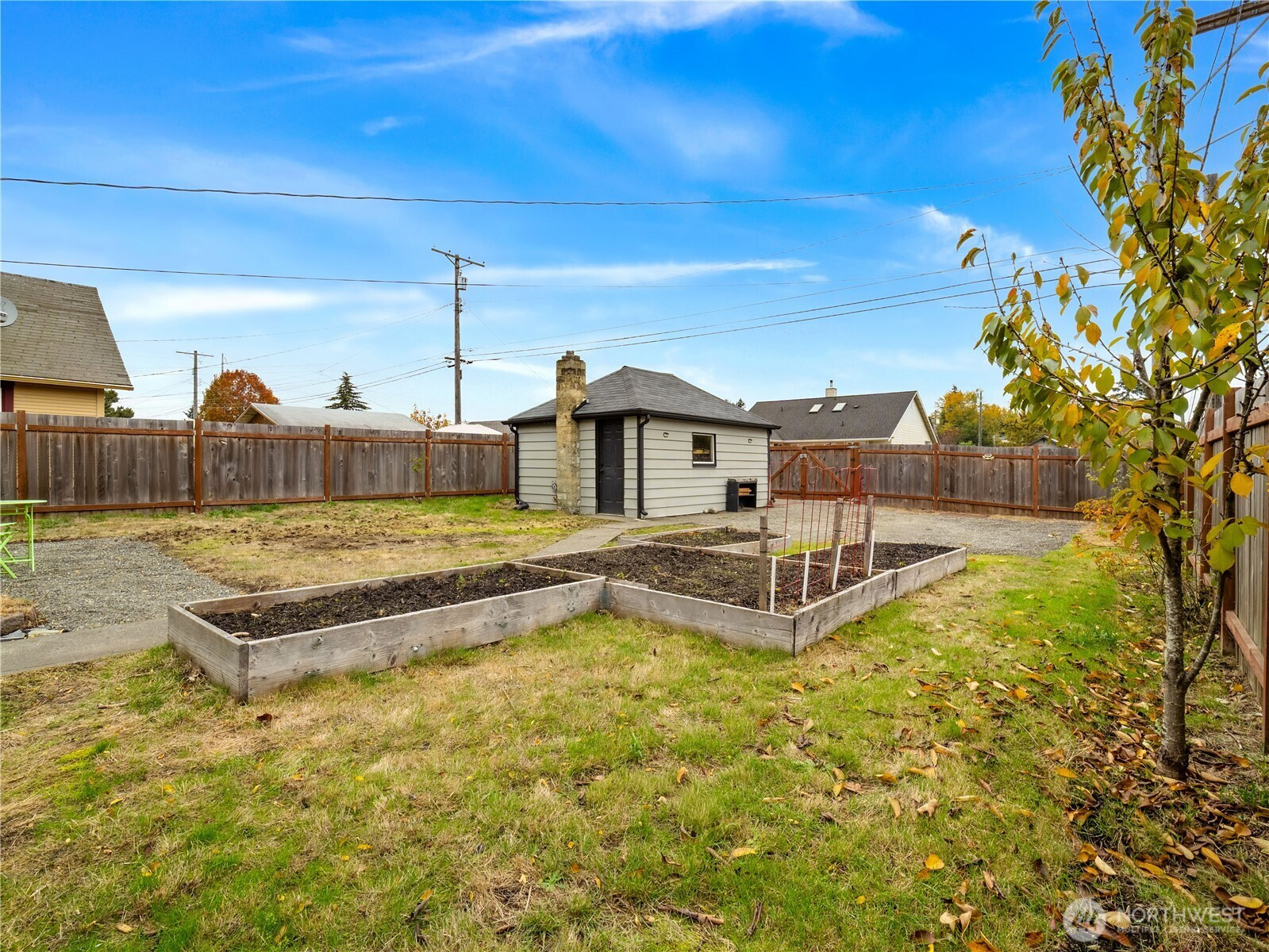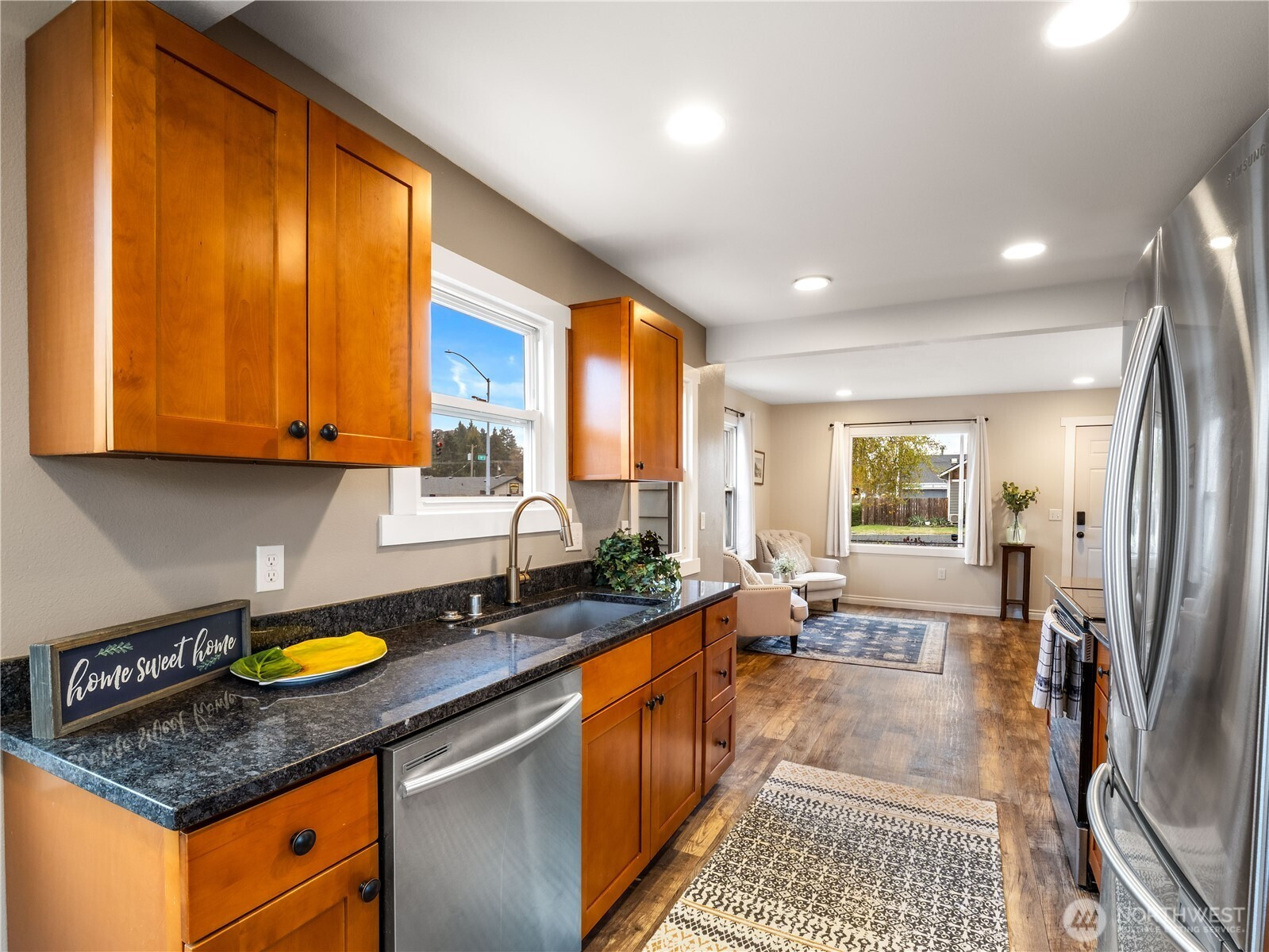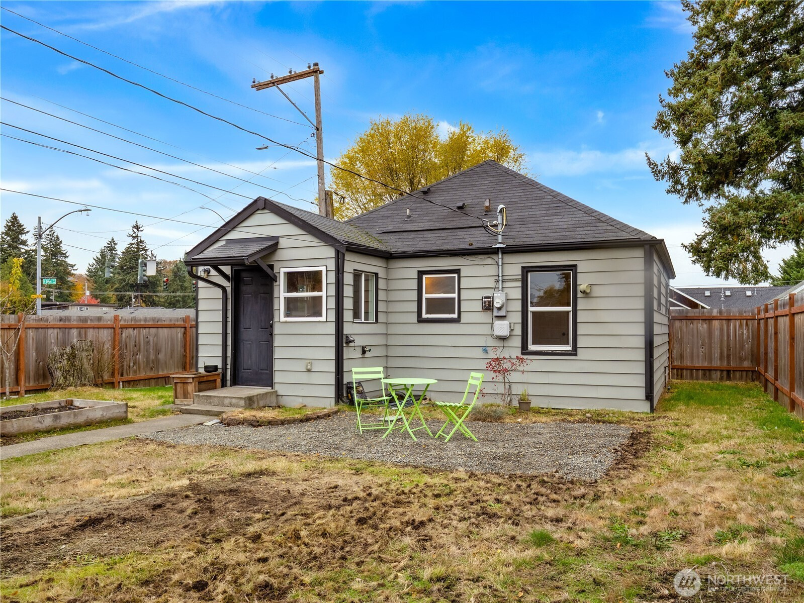 This charming 2-bedroom, 1-bath bungalow sits on a desirable corner lot near the Tacoma Mall. The open kitchen flows into the living room and features a cozy breakfast nook. Just off the main living area are two bedrooms and a full bath. The home includes granite countertops, stainless steel appliances, and newer LVP flooring, along with fresh interior paint throughout. A washer/dryer combo is also included. The private backyard offers a patio area, raised garden beds, fruit trees, and full cedar fencing for added privacy. Gated alley access leads to a single-car garage w/ parking area inside gate. Conveniently located just minutes from freeways, shopping, and schools. Additional updates include a newer roof, water heater, and electrical.