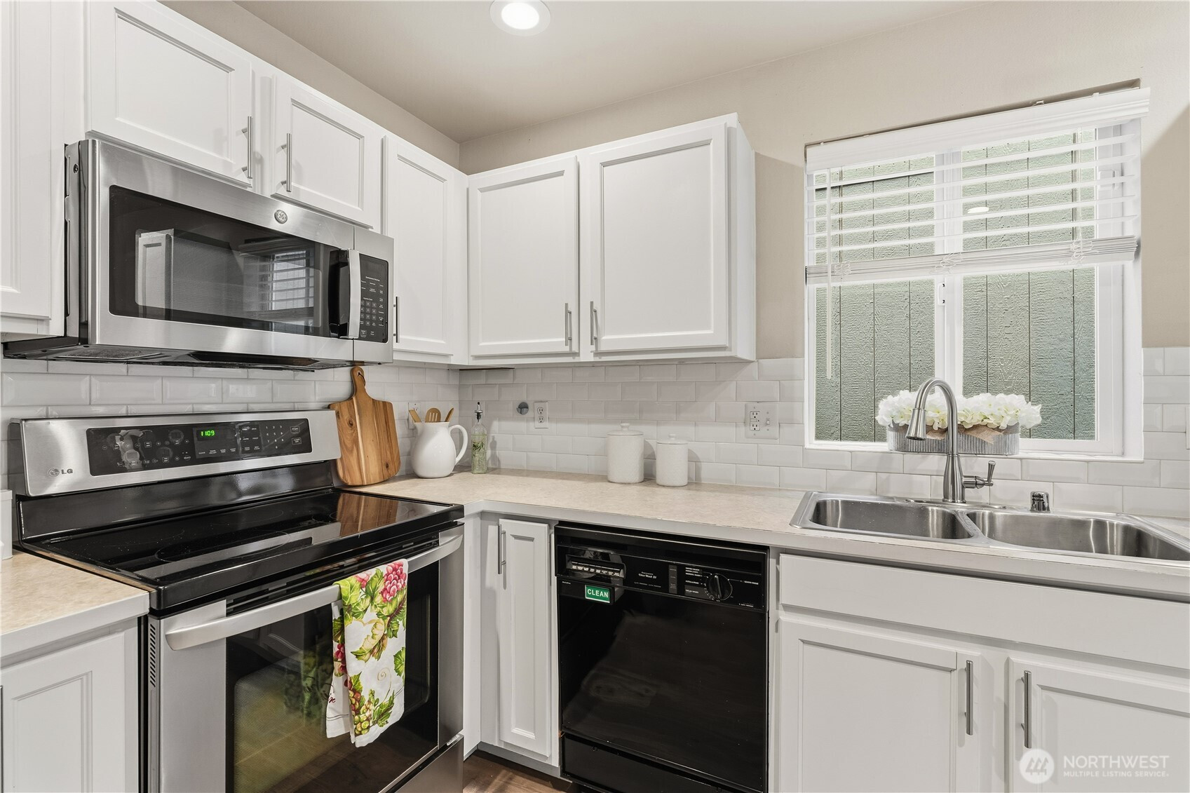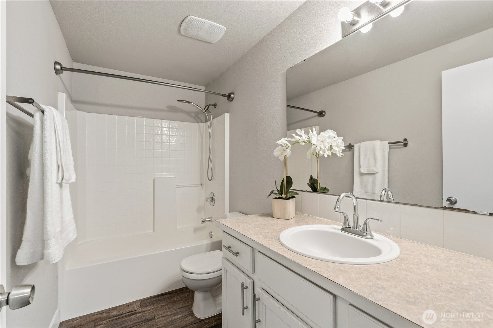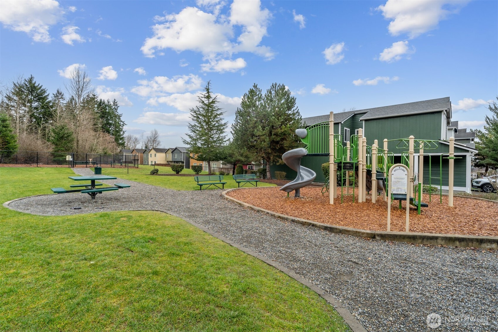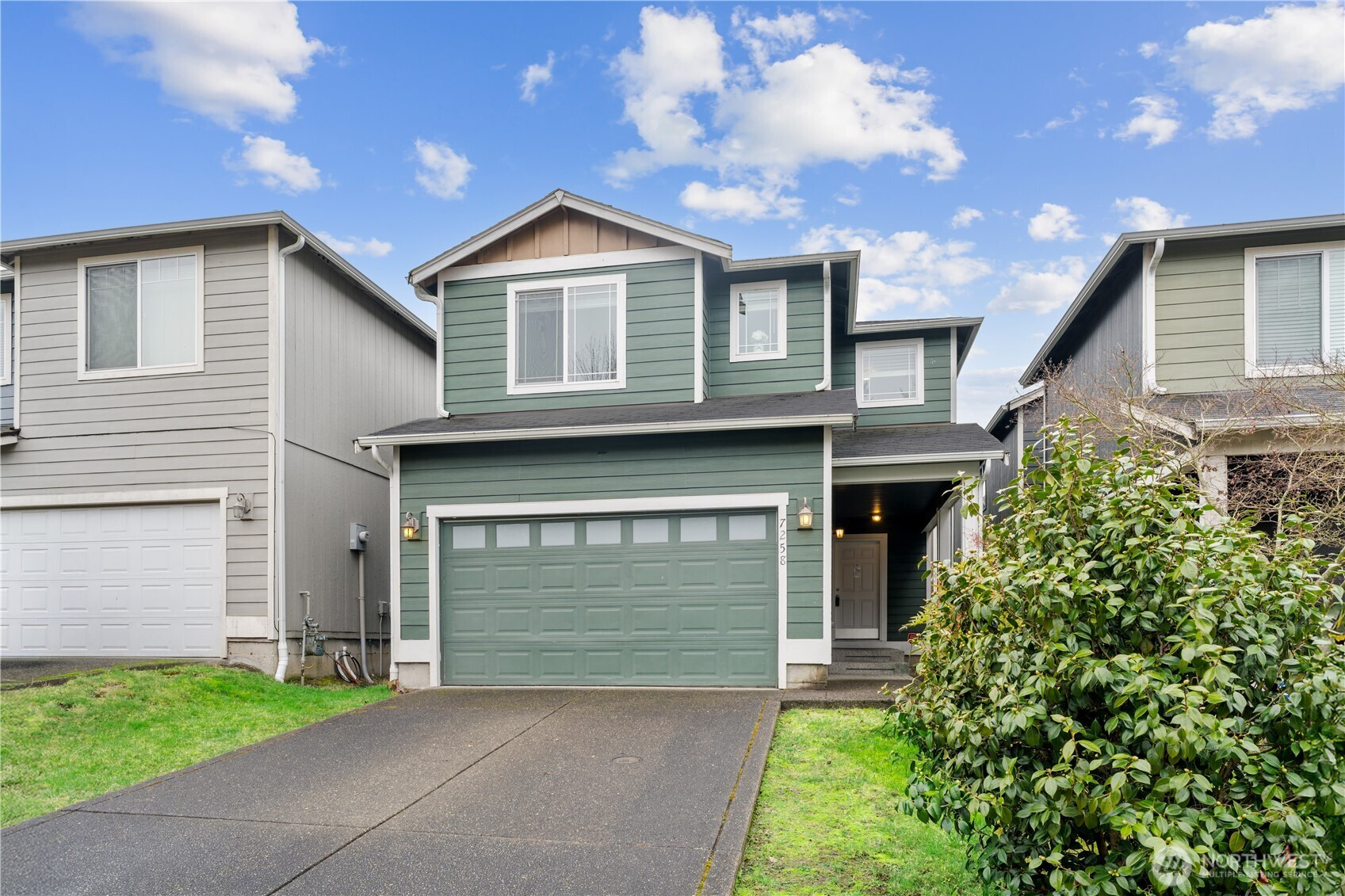 Welcome to this turn-key home in the desirable Hanson’s Estates community. Step into the inviting foyer with soaring two-story ceiling and a large picture window for beautiful illuminating natural light. Gleaming laminate hardwood flooring extends throughout the open concept great room that blends the living, dining and kitchen for easy seamless hosting and entertainment. Spacious and functional kitchen with a center island with storage space, shaker cabinetry, stainless refrigerator + oven range, newer 2022 stainless microwave and full-height tiled backsplash. New plush carpets, new slider door, new living room window, newer 2023 water heater, newer faucets & fixtures throughout home. Main floor powder room and utility room with newer 2022 full-sized washer/dryer set. Upstairs is a flexible loft area, versatile as a WFH space, entertainment center or reading nook. Spacious primary bedroom with ensuite 5-piece primary bathroom boasts dual vanity sinks, tiled surround soaking tub, step-in shower, convenient separate lavatory and oversized walk-in closet with a picture window. Two additional sizable bedrooms + full guest bathroom finish out the upstairs. Nestled in a quiet well-maintained neighborhood with an athletic court, playground and dog park for your furry best friends. Centrally located near JBLM, shopping and dining hubs.