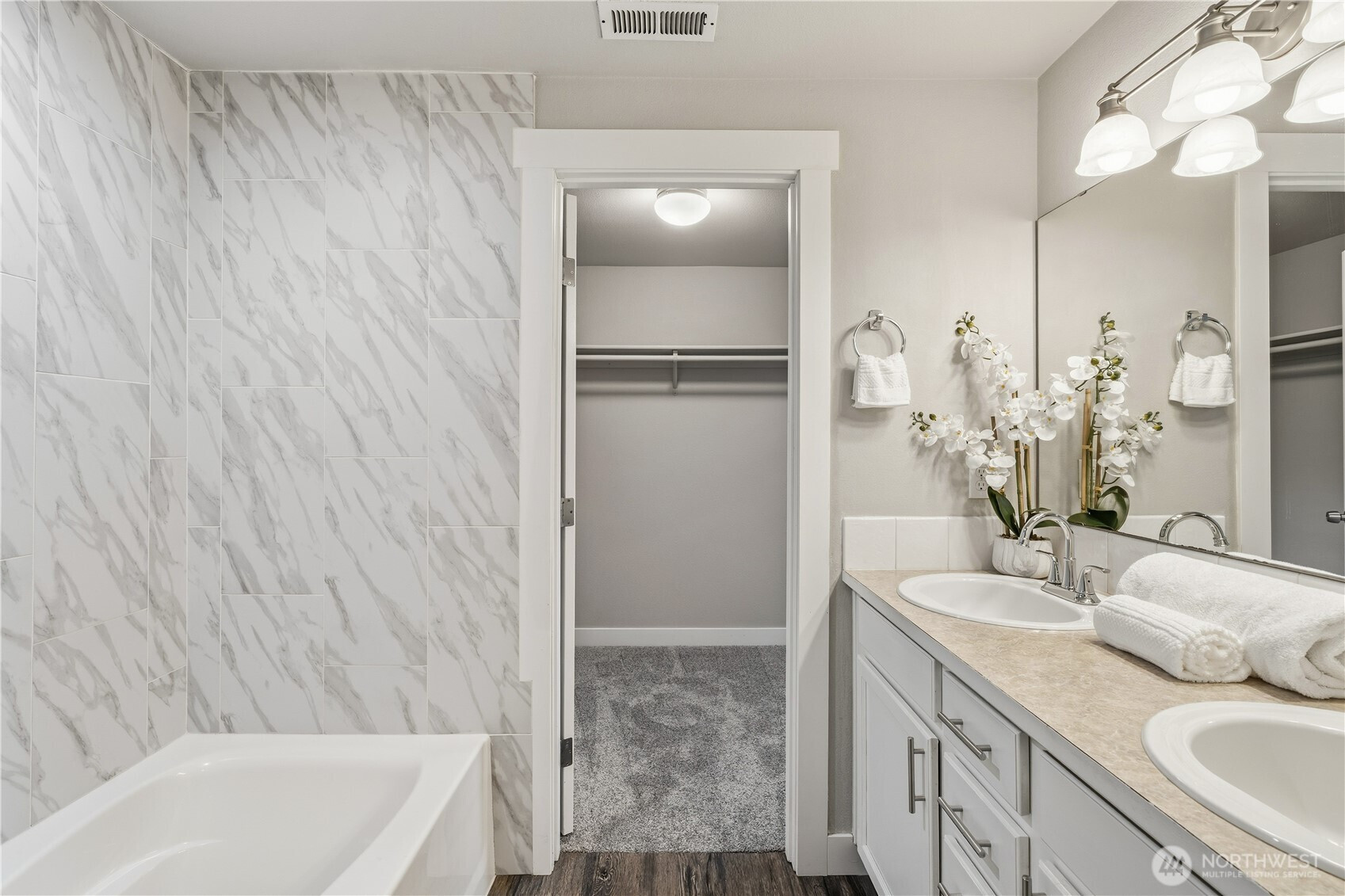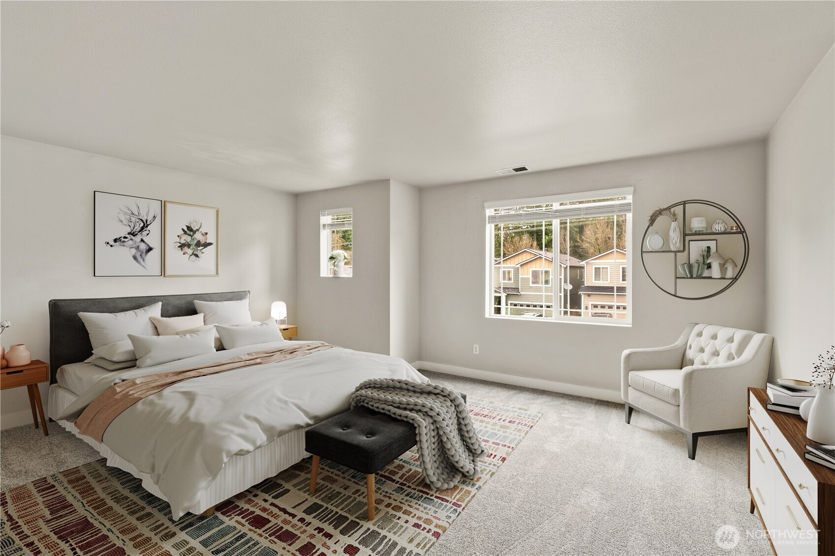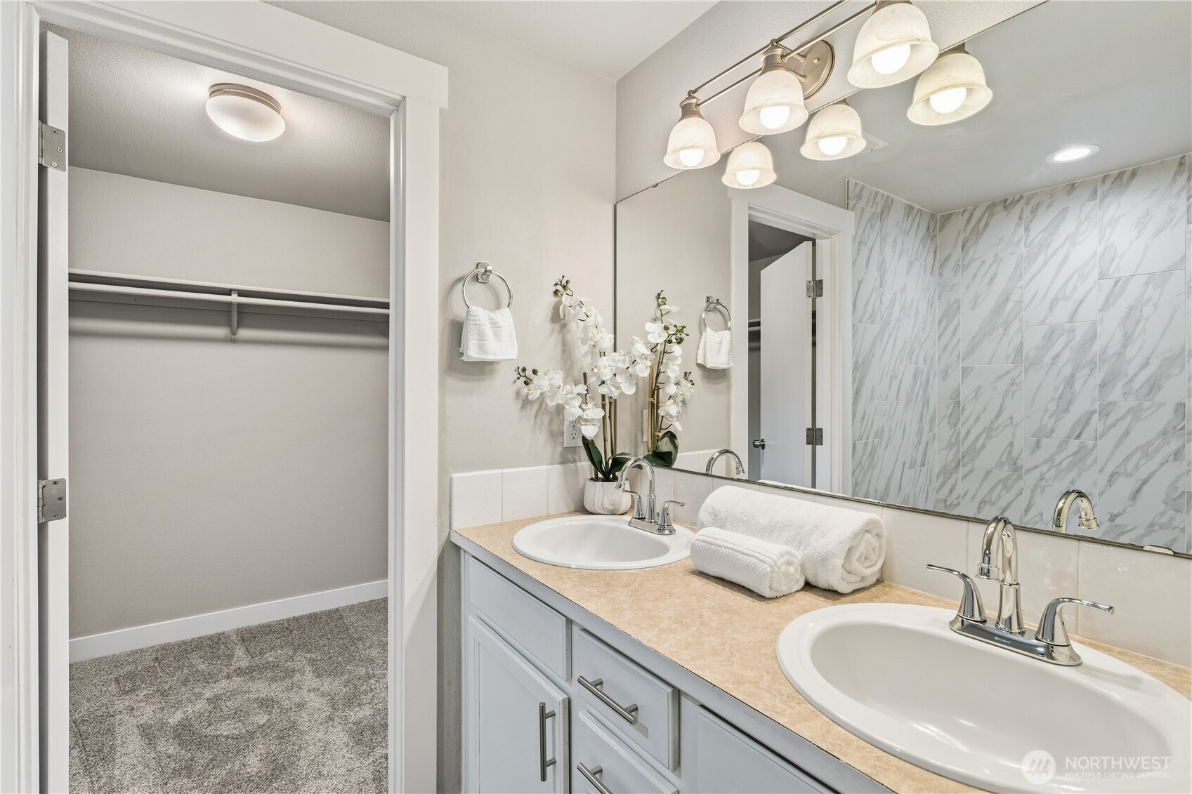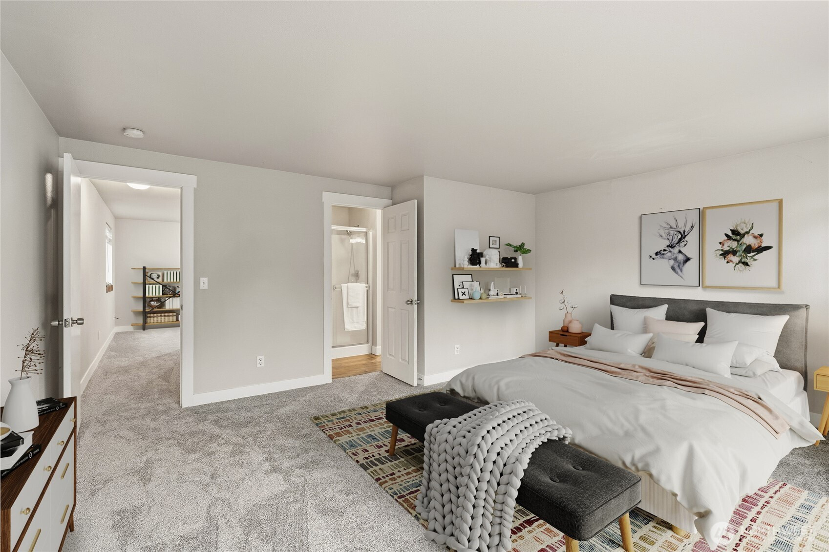 Welcome to this turn-key home in the desirable Hanson’s Estates community. Step into the inviting foyer with soaring two-story ceiling and a large picture window for beautiful illuminating natural light. Gleaming laminate hardwood flooring extends throughout the open concept great room that blends the living, dining and kitchen for easy seamless hosting and entertainment. Spacious and functional kitchen with a center island with storage space, shaker cabinetry, stainless refrigerator + oven range, newer 2022 stainless microwave and full-height tiled backsplash. New plush carpets, new slider door, new living room window, newer 2023 water heater, newer faucets & fixtures throughout home. Main floor powder room and utility room with newer 2022 full-sized washer/dryer set. Upstairs is a flexible loft area, versatile as a WFH space, entertainment center or reading nook. Spacious primary bedroom with ensuite 5-piece primary bathroom boasts dual vanity sinks, tiled surround soaking tub, step-in shower, convenient separate lavatory and oversized walk-in closet with a picture window. Two additional sizable bedrooms + full guest bathroom finish out the upstairs. Nestled in a quiet well-maintained neighborhood with an athletic court, playground and dog park for your furry best friends. Centrally located near JBLM, shopping and dining hubs.