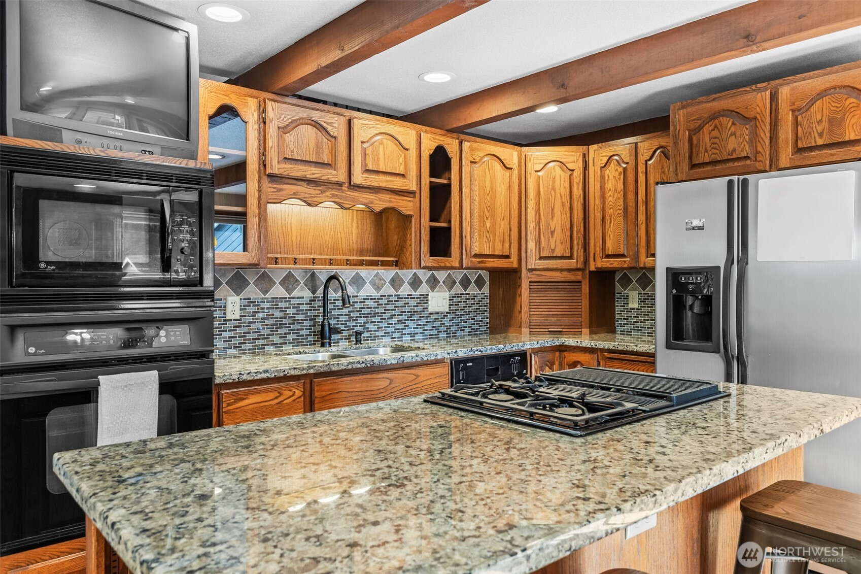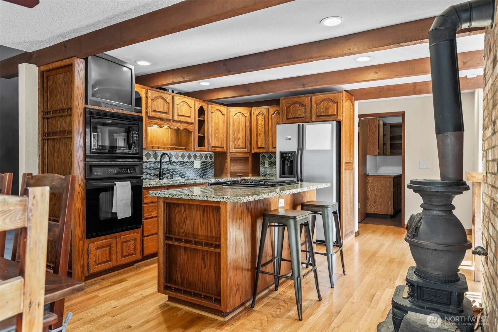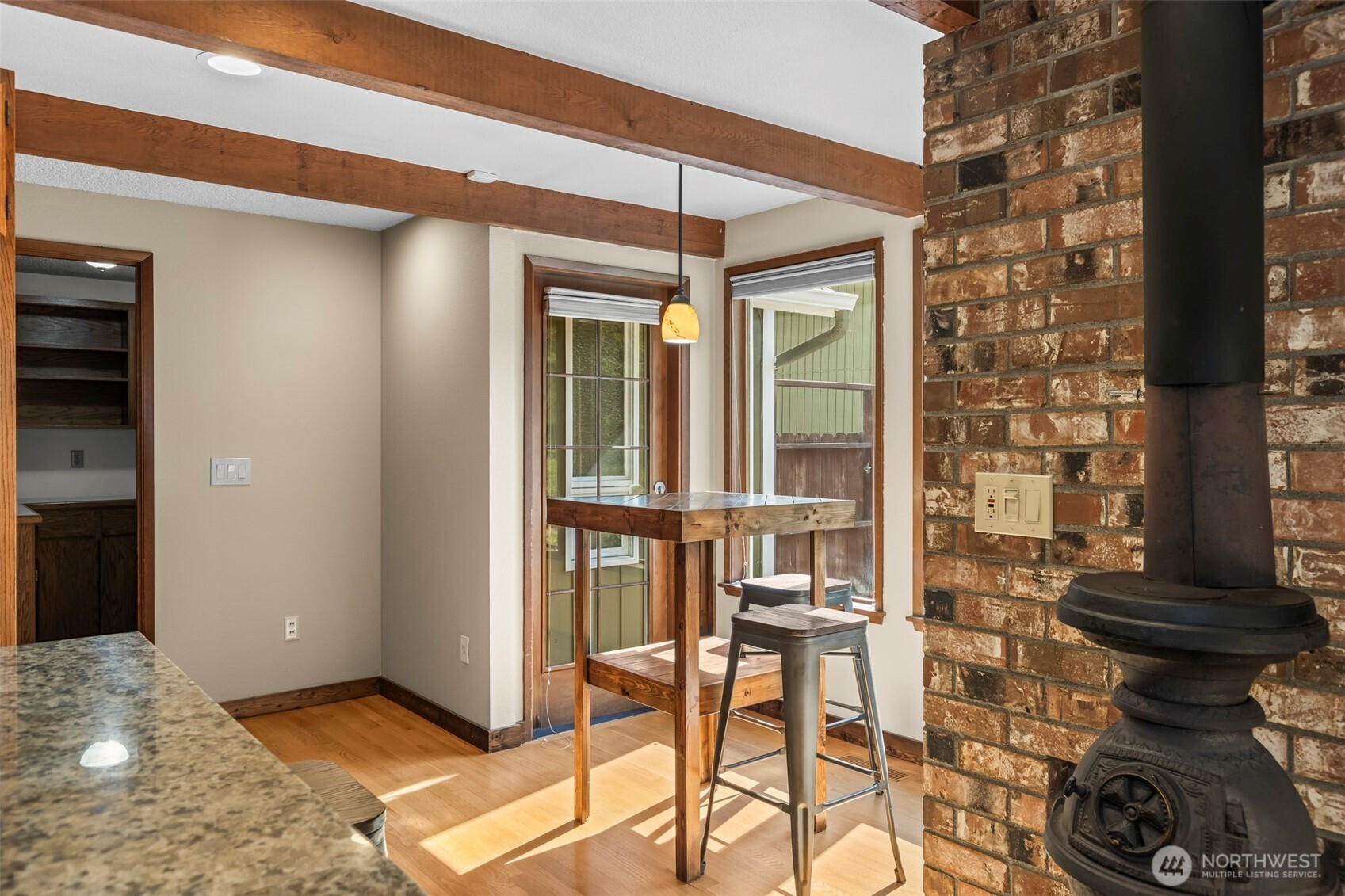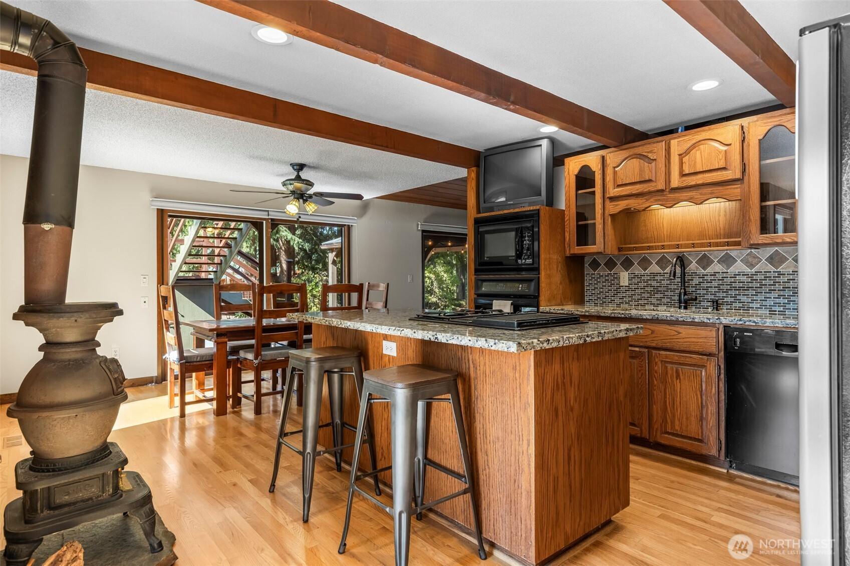 Tucked away just off 72nd & Waller, this home offers the rare gift of privacy close in. Centered on just over an acre and is fenced and cross fenced, this home and property feels like a retreat. Soaring cedar-lined ceilings, a dramatic spiral staircase with catwalk, warmth and character throughout. The spacious main-level primary suite w/full bath, walk in closet and wood stove opens to a private deck w/hot tub overlooking the greenbelt—perfect for unwinding at day’s end. Entertain with ease in the updated kitchen with granite counters, butler’s pantry, and huge walk-in pantry. Fresh paint, gas furnace w/heat pump, wired for generator, oversized 2-car garage, carport, and storage shed make this home as practical as it is unique.