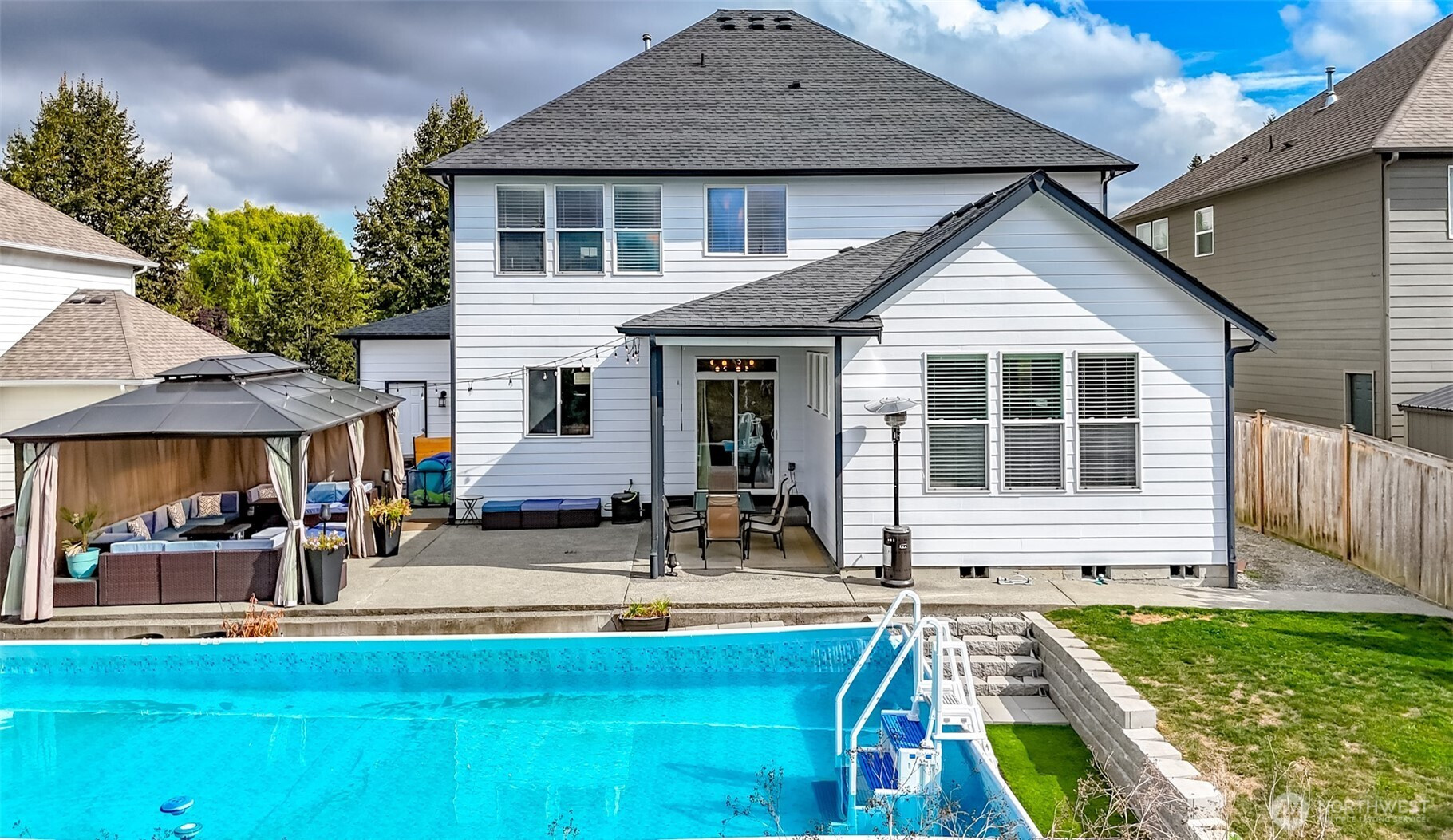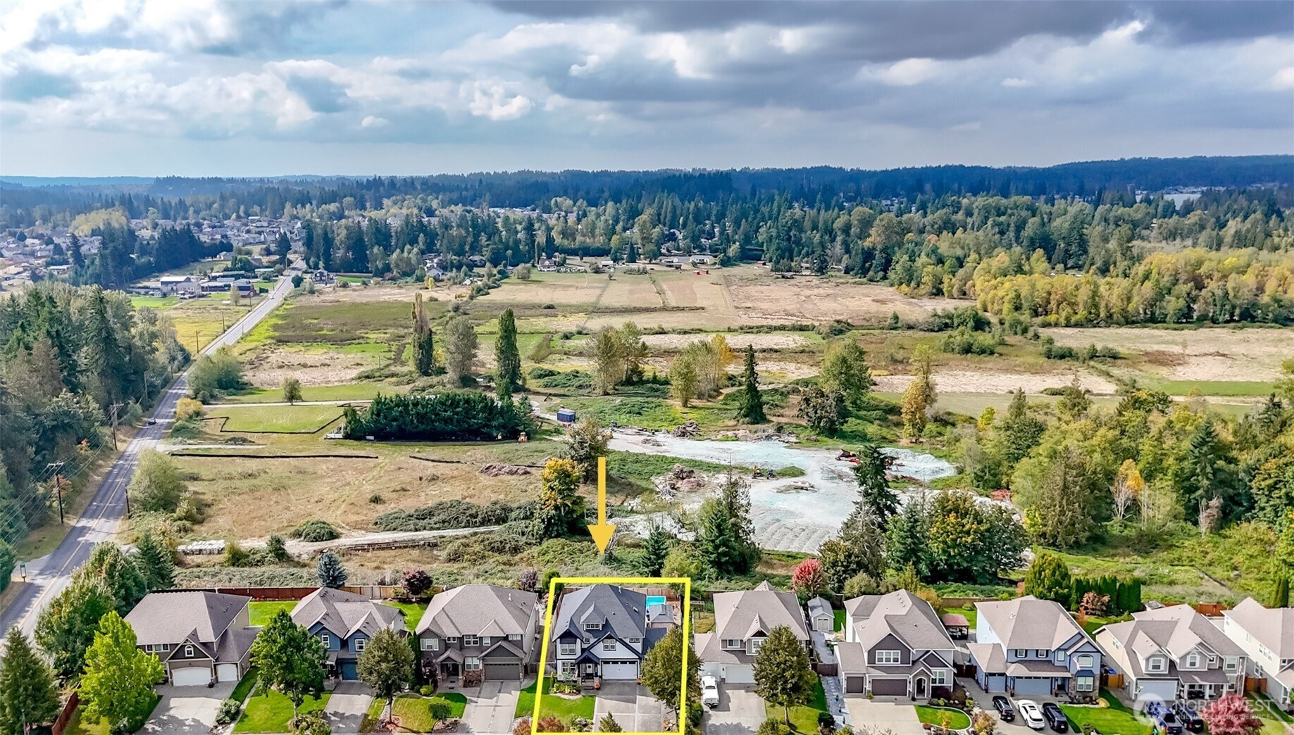Welcome to White River Estates, a highly desirable Buckley community bordering Bonney Lake and close to all amenities. This exceptional residence features an open floor plan with a chef’s kitchen boasting an oversized eat-in island, abundant storage, and elegant stone counters, complemented by a formal dining room for entertaining. The luxurious primary suite offers a spa-inspired five-piece bath with dual vanities and an impressive walk-in closet. Additional highlights include two versatile bonus rooms, an oversized upstairs laundry, and a rare four-car garage providing outstanding storage and parking. A brand-new roof installed in 2025. Outdoors, enjoy a spacious covered patio and pool with no neighbors behind for privacy.