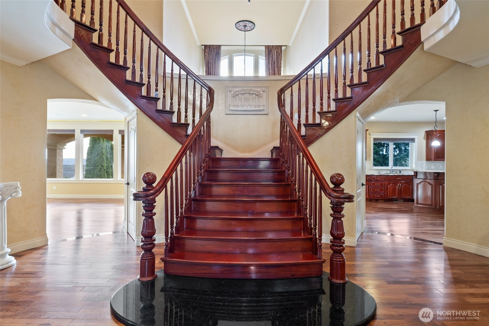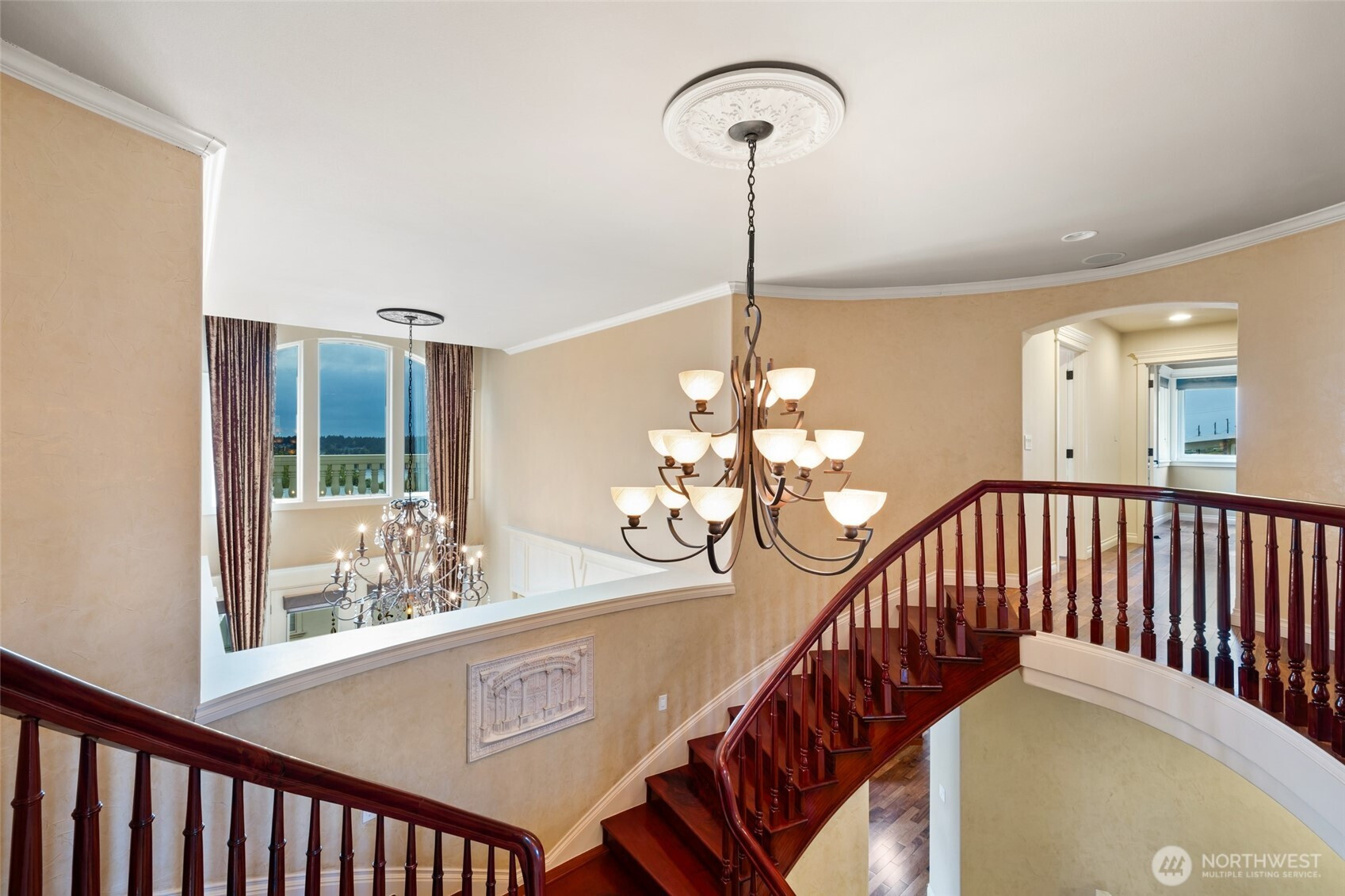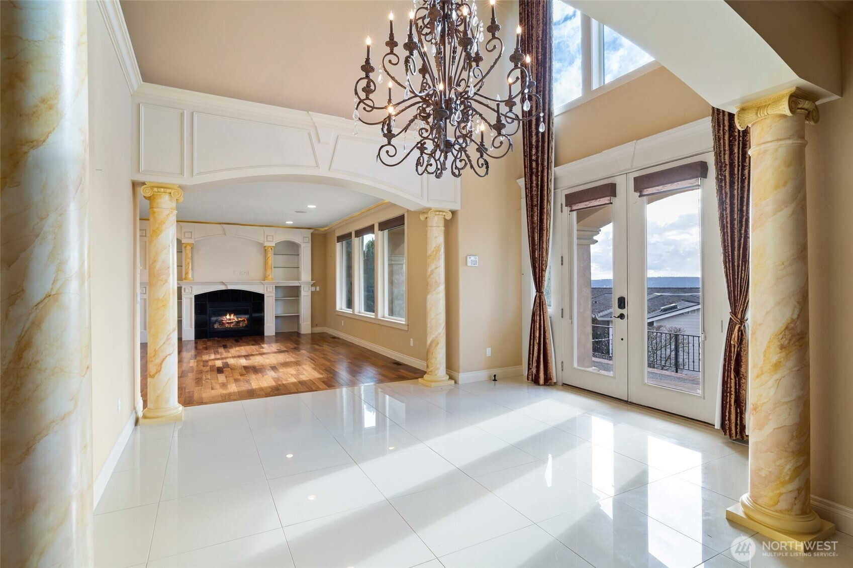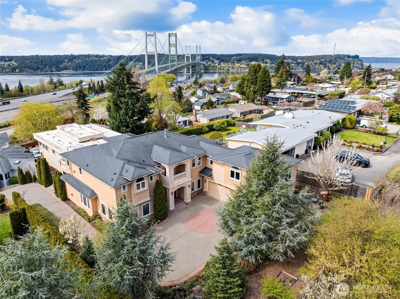 Nestled in Tacoma’s prestigious west end with gated entry, this grand custom home offers spectacular views of Puget Sound, the Olympic Mountains, and the iconic Narrows Bridge. The residence features formal and informal living and dining, a wired media room with balcony access. The gourmet kitchen with granite countertops, stainless steel Viking appliances, and a layout perfect for culinary creativity. The master suite is unrivaled, with a cozy gas fireplace, 2 spacious walk-in closets, a view balcony, and a luxurious en-suite bath with a jetted soaking tub, dual vanities, and ample space. A junior master suite with balcony access. 5 beds and 4 1/2 baths. Other features include a covered aggregate porch, low-maintenance landscaping.