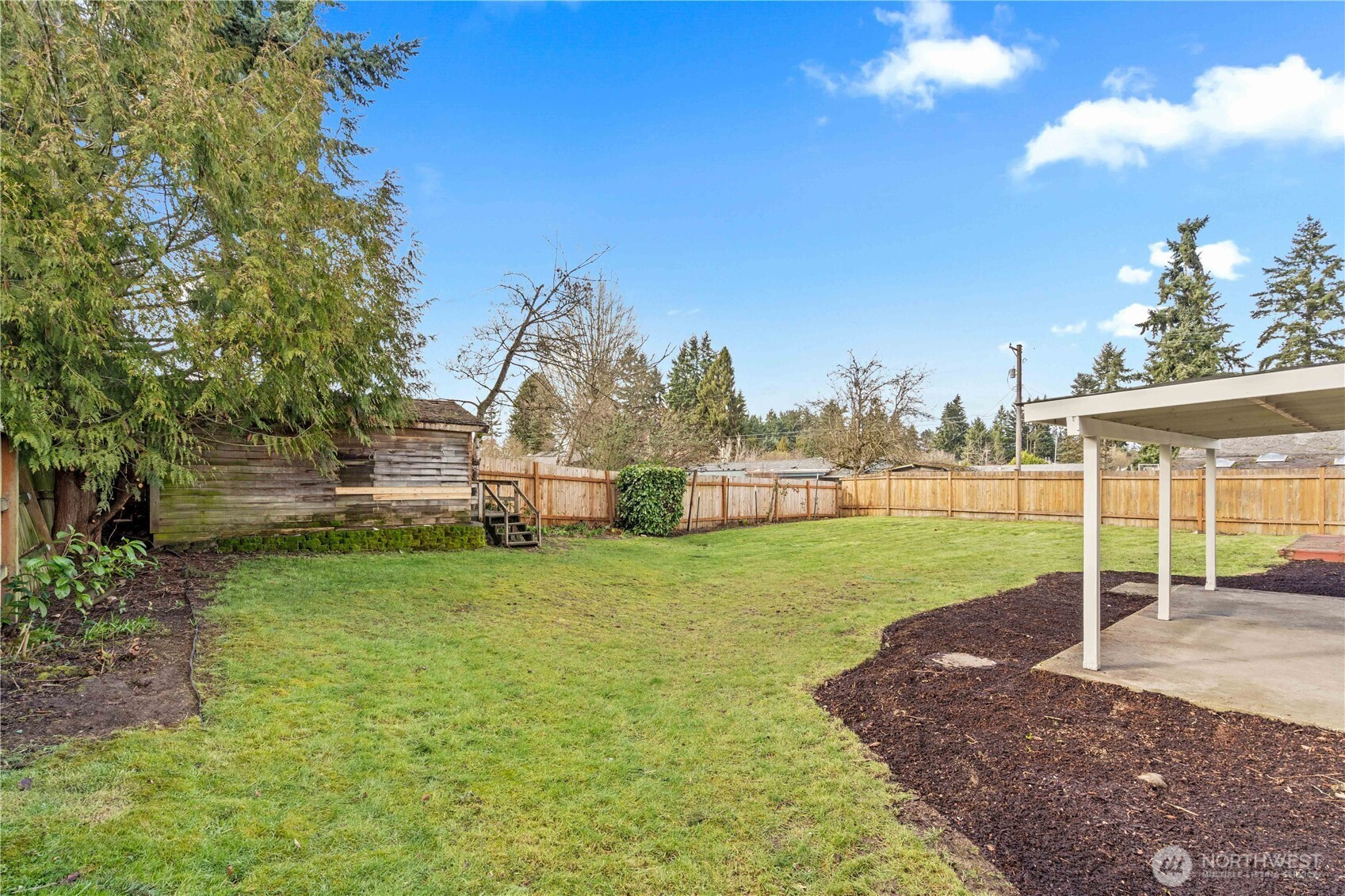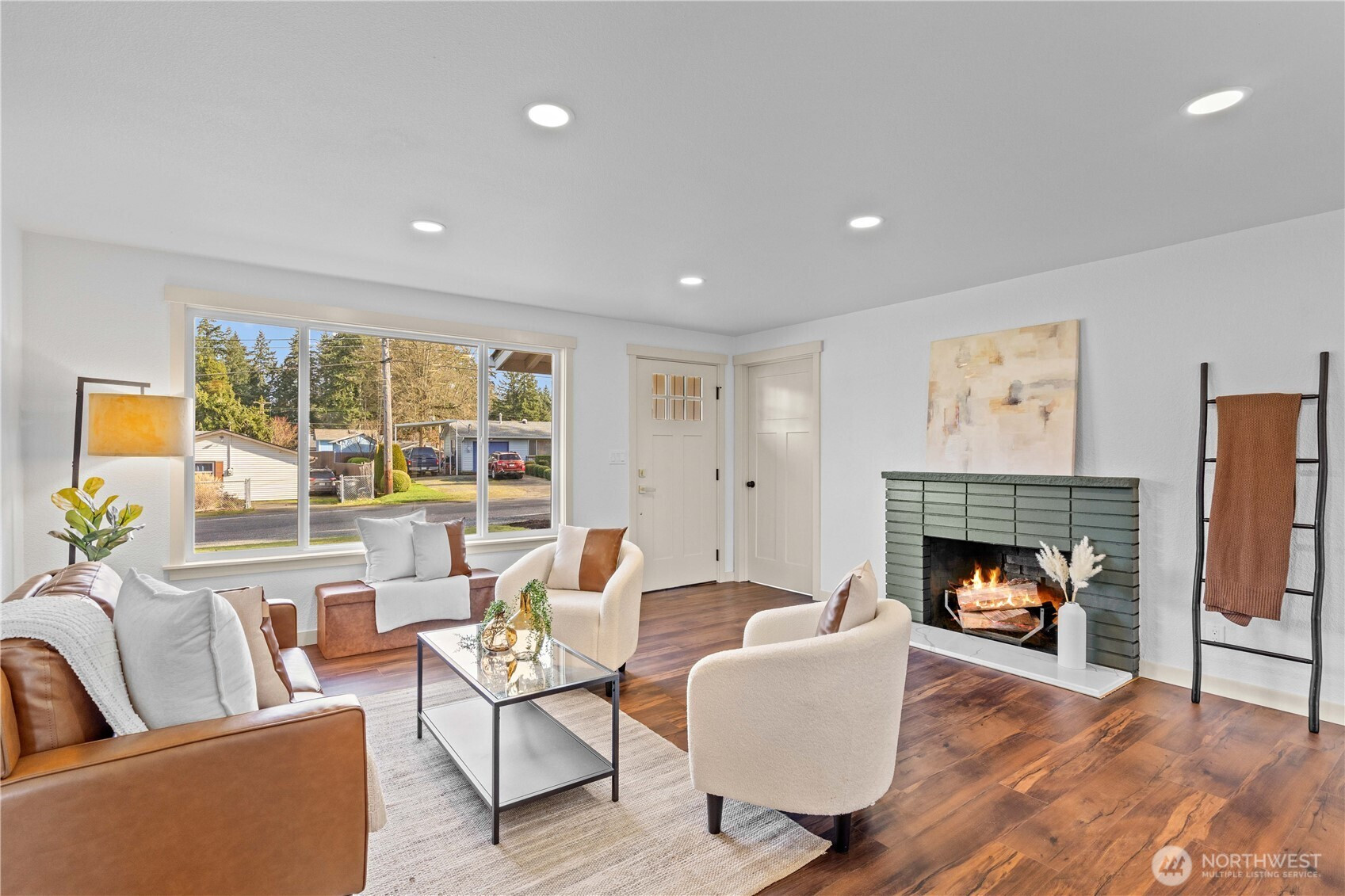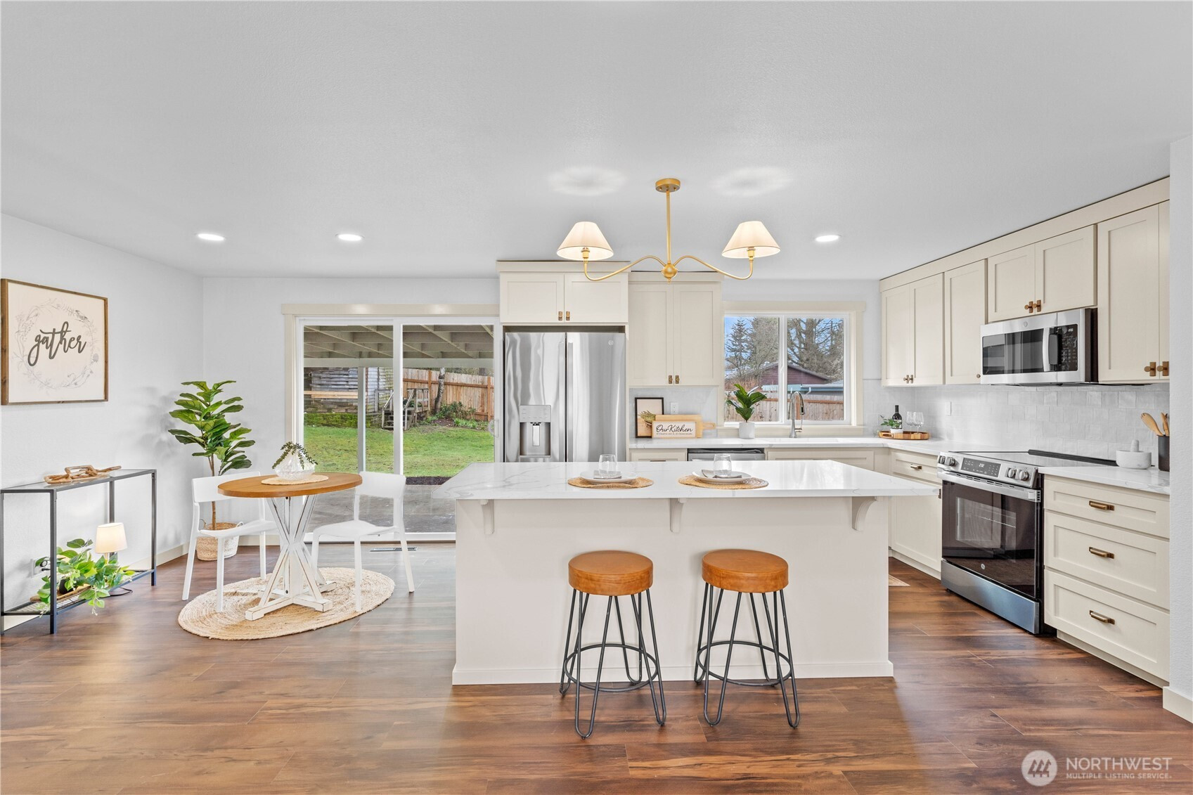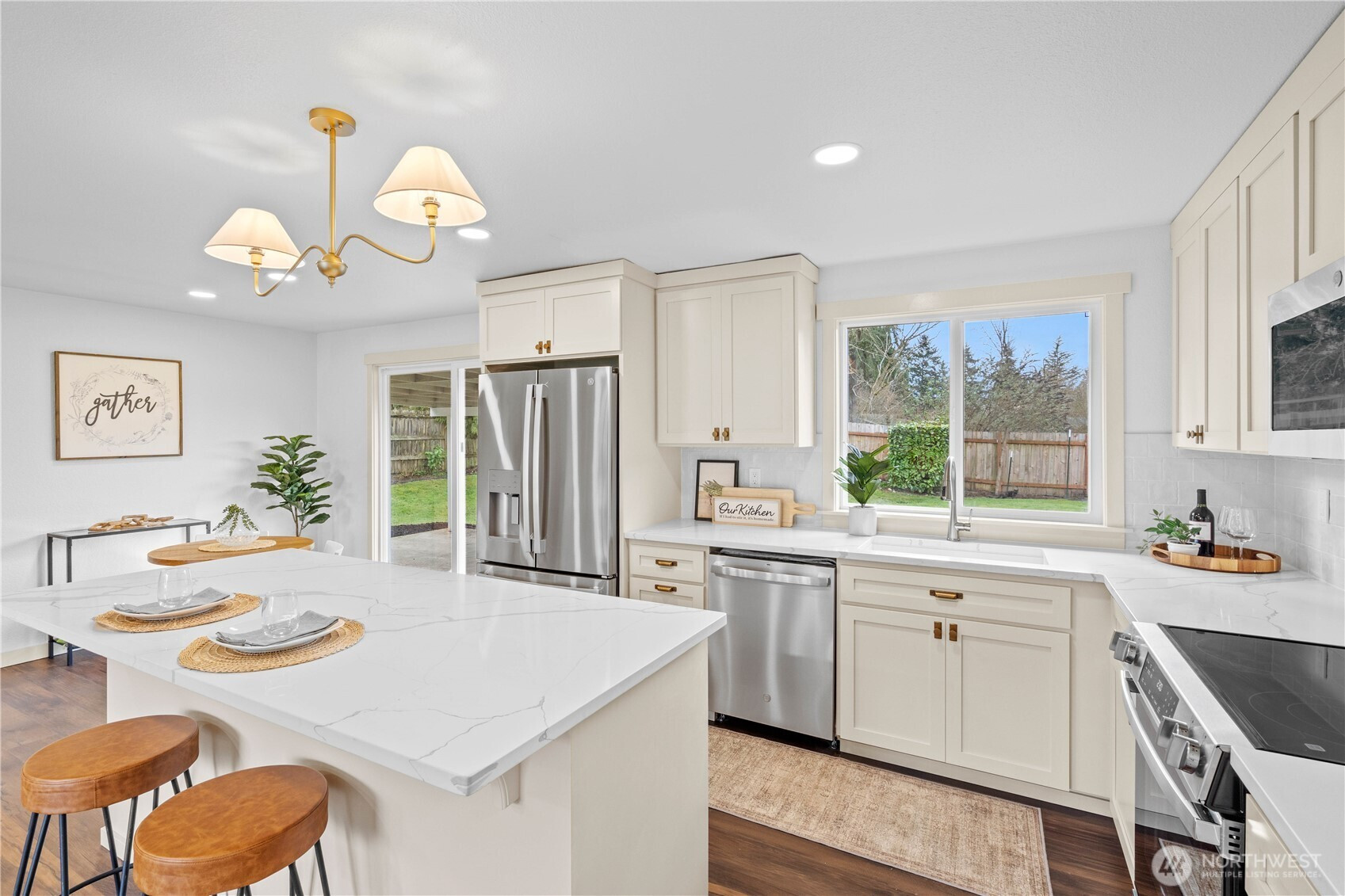 Oh so charming and ready to settle into, this beautifully refreshed 4 bedroom, 2 bath home blends cozy charm with upbeat personality. Featuring timeless accents, warm gold finishes, and a stunning light-filled kitchen at the heart of it all. A cohesive color story carries thoughtfully throughout the home, with exterior paint reflecting the interior kitchen cabinetry, doors, and trim & complimented by pops of emerald green showcased on the front door, exterior shutters and living room brick fireplace. The layout offers both flexibility and privacy, with one side functioning as a peaceful primary suite retreat. Three sliding glass doors create seamless indoor/outdoor living and open to a fully fenced backyard ready for slow mornings, summer dinners, and future garden dreams. Already home to a row of raspberries and a charming garden shed, the space invites you to grow something of your own. With fresh updates throughout, new bathrooms, and countless intentional details, this home is truly home sweet home.