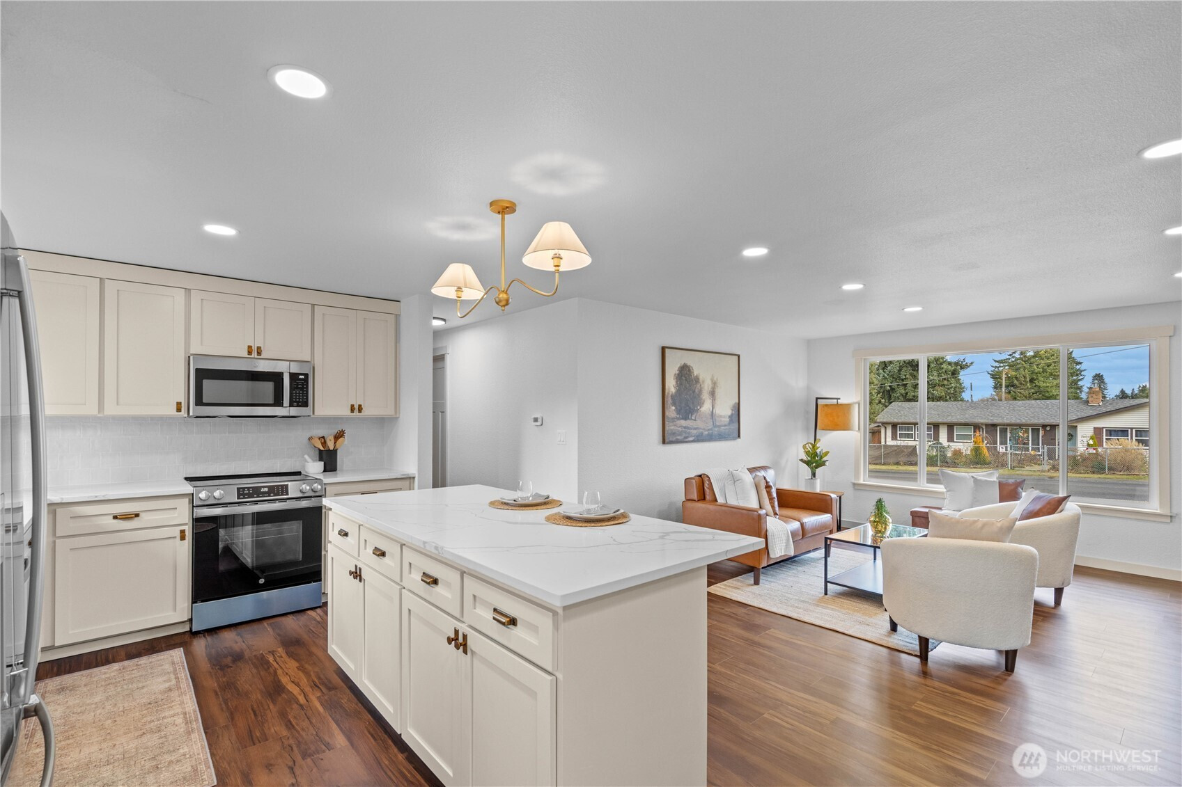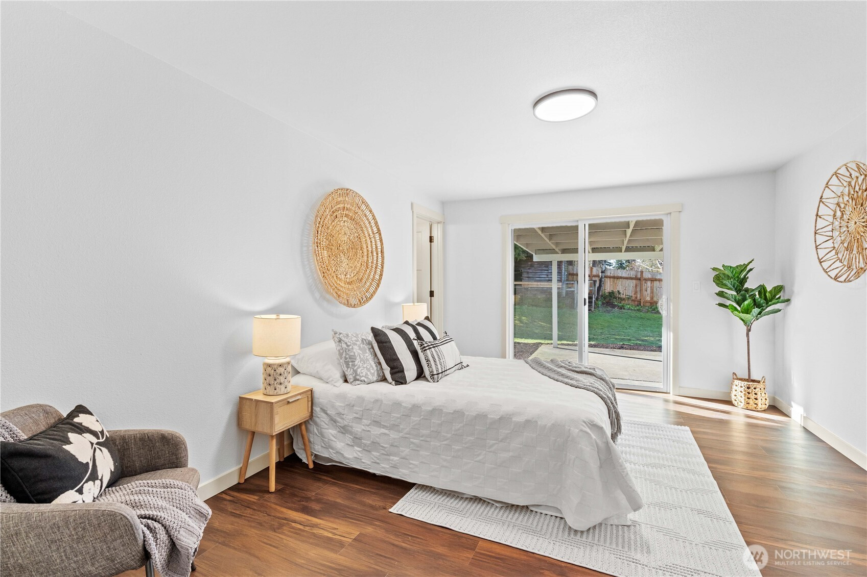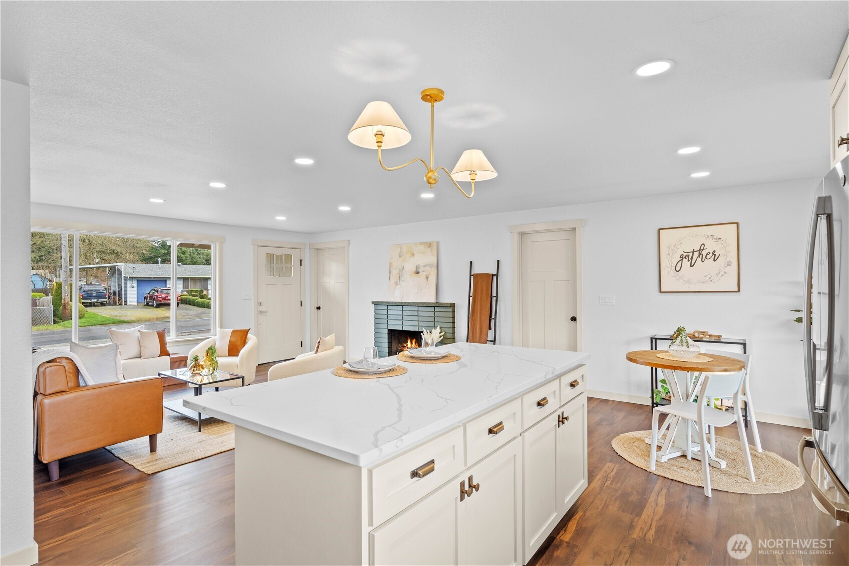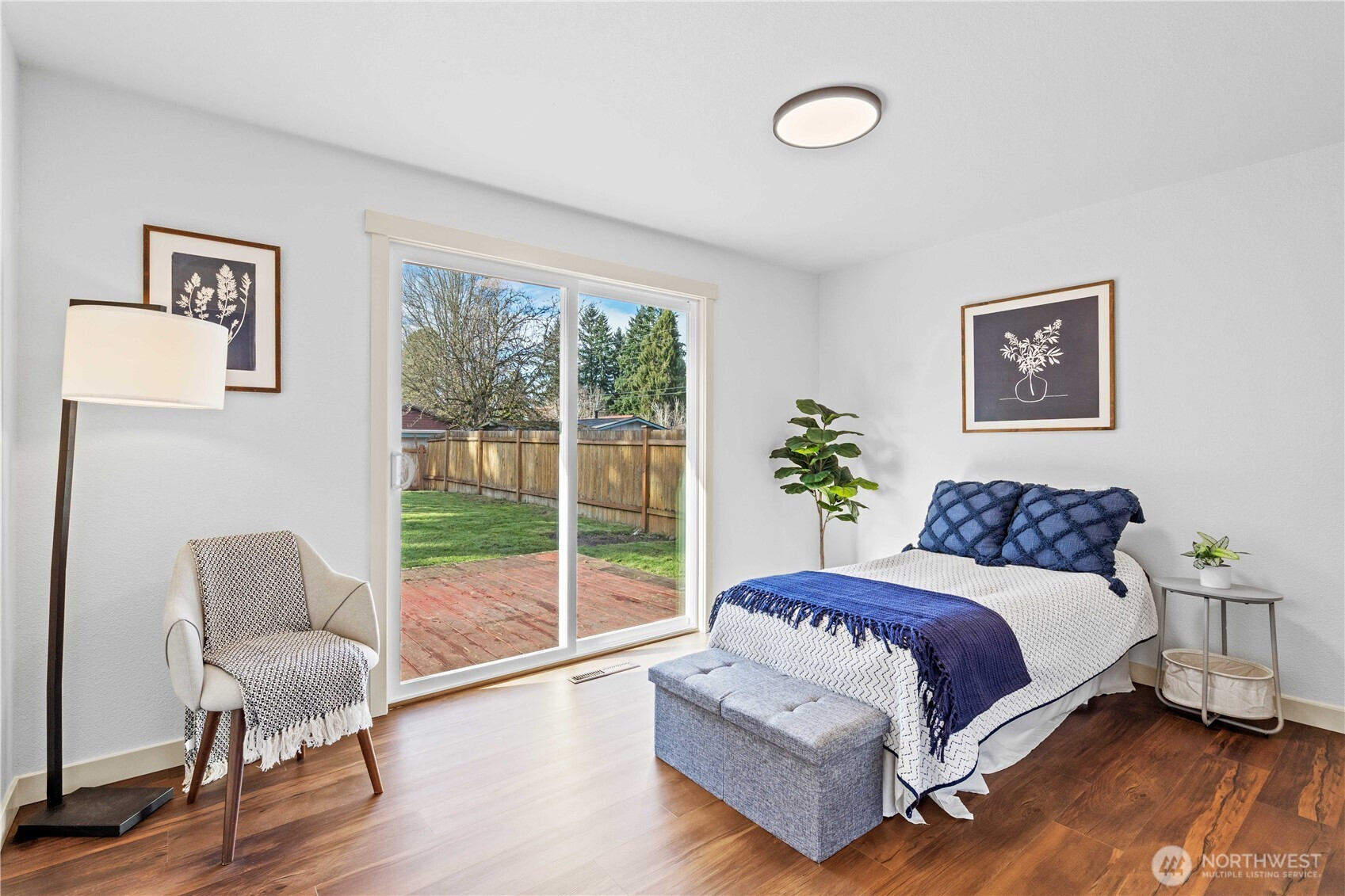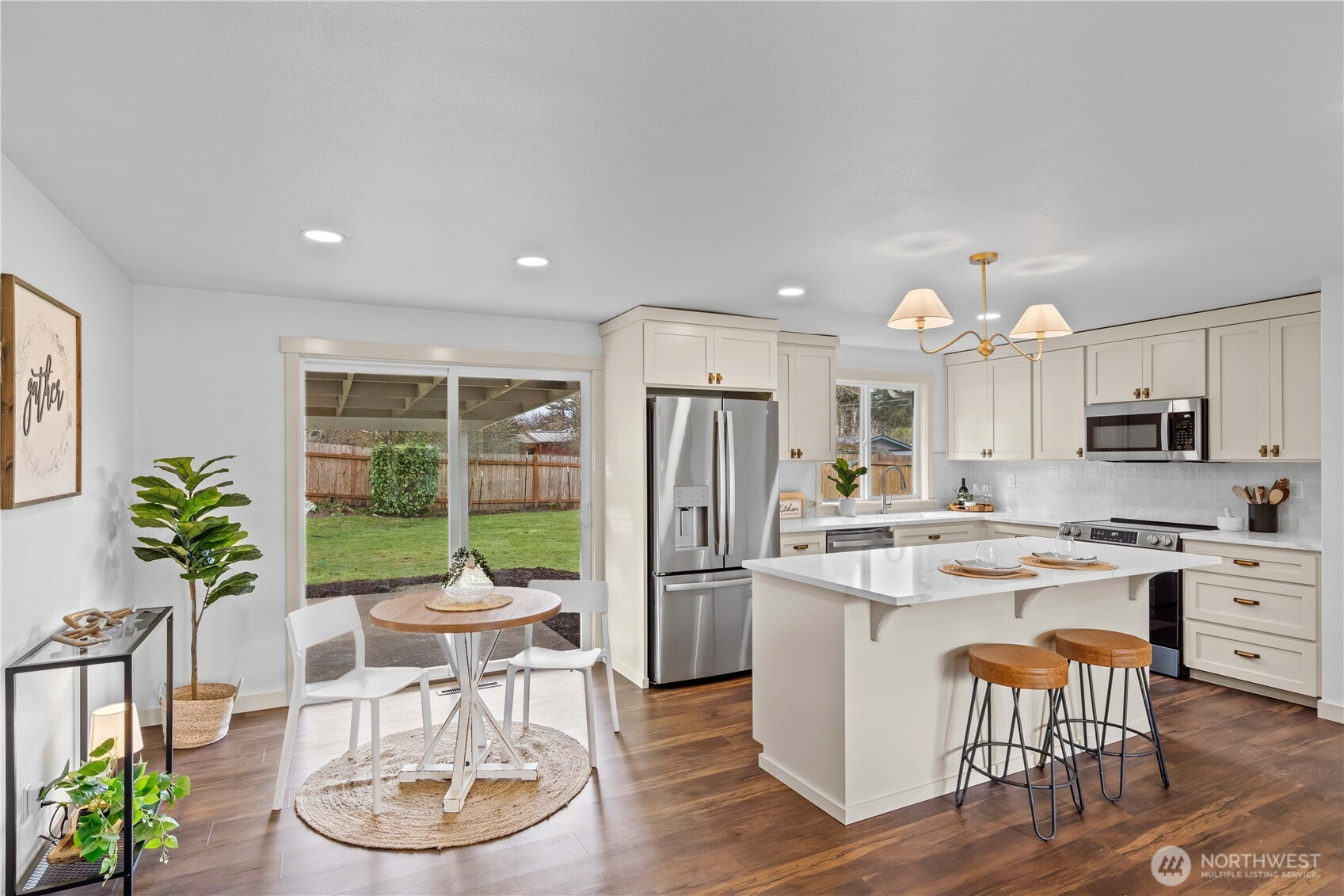 Oh so charming and ready to settle into, this beautifully refreshed 4 bedroom, 2 bath home blends cozy charm with upbeat personality. Featuring timeless accents, warm gold finishes, and a stunning light-filled kitchen at the heart of it all. A cohesive color story carries thoughtfully throughout the home, with exterior paint reflecting the interior kitchen cabinetry, doors, and trim & complimented by pops of emerald green showcased on the front door, exterior shutters and living room brick fireplace. The layout offers both flexibility and privacy, with one side functioning as a peaceful primary suite retreat. Three sliding glass doors create seamless indoor/outdoor living and open to a fully fenced backyard ready for slow mornings, summer dinners, and future garden dreams. Already home to a row of raspberries and a charming garden shed, the space invites you to grow something of your own. With fresh updates throughout, new bathrooms, and countless intentional details, this home is truly home sweet home.