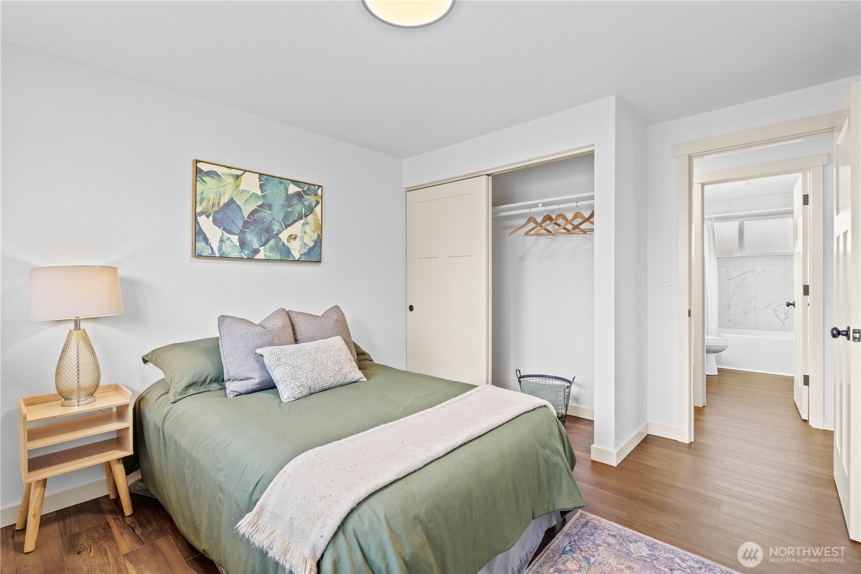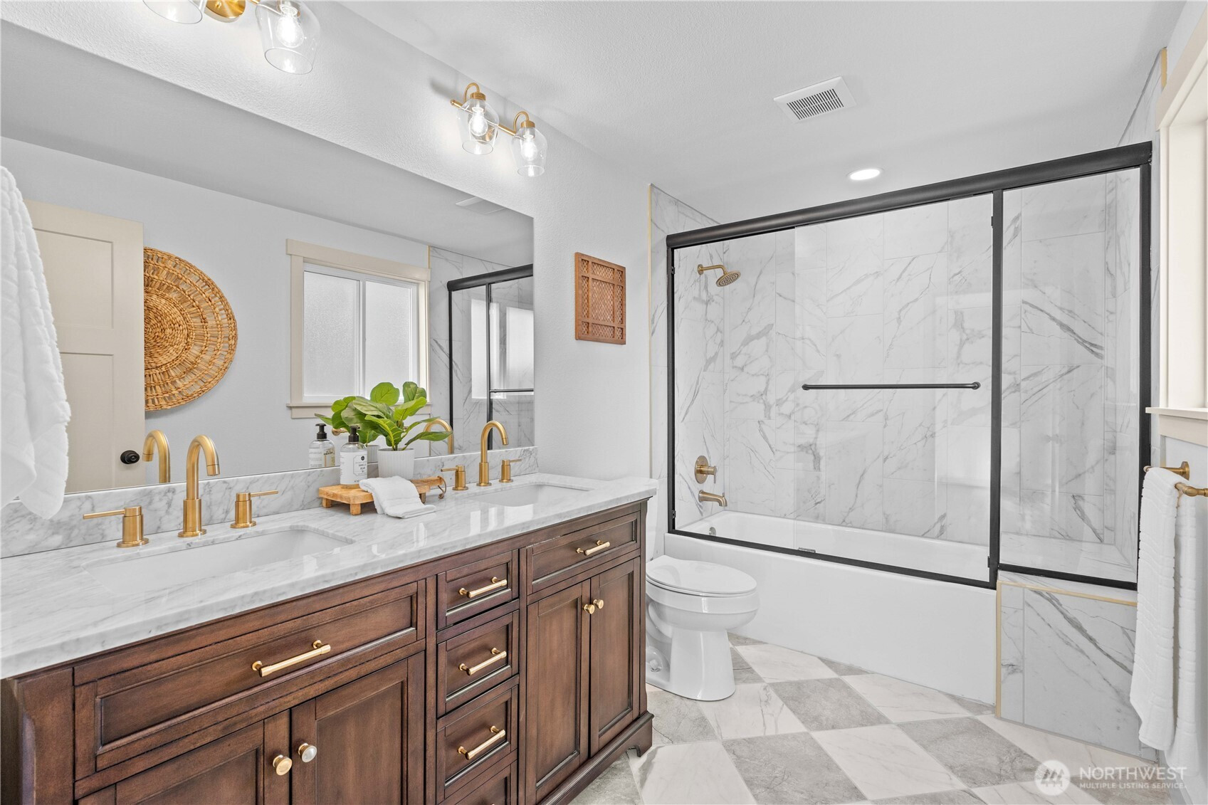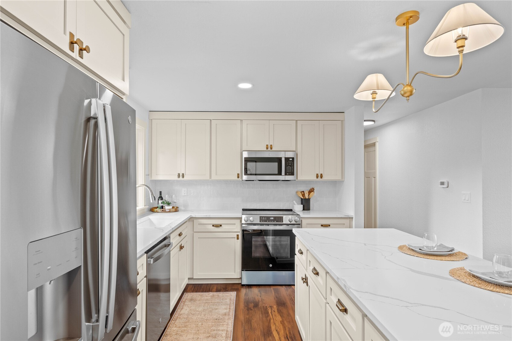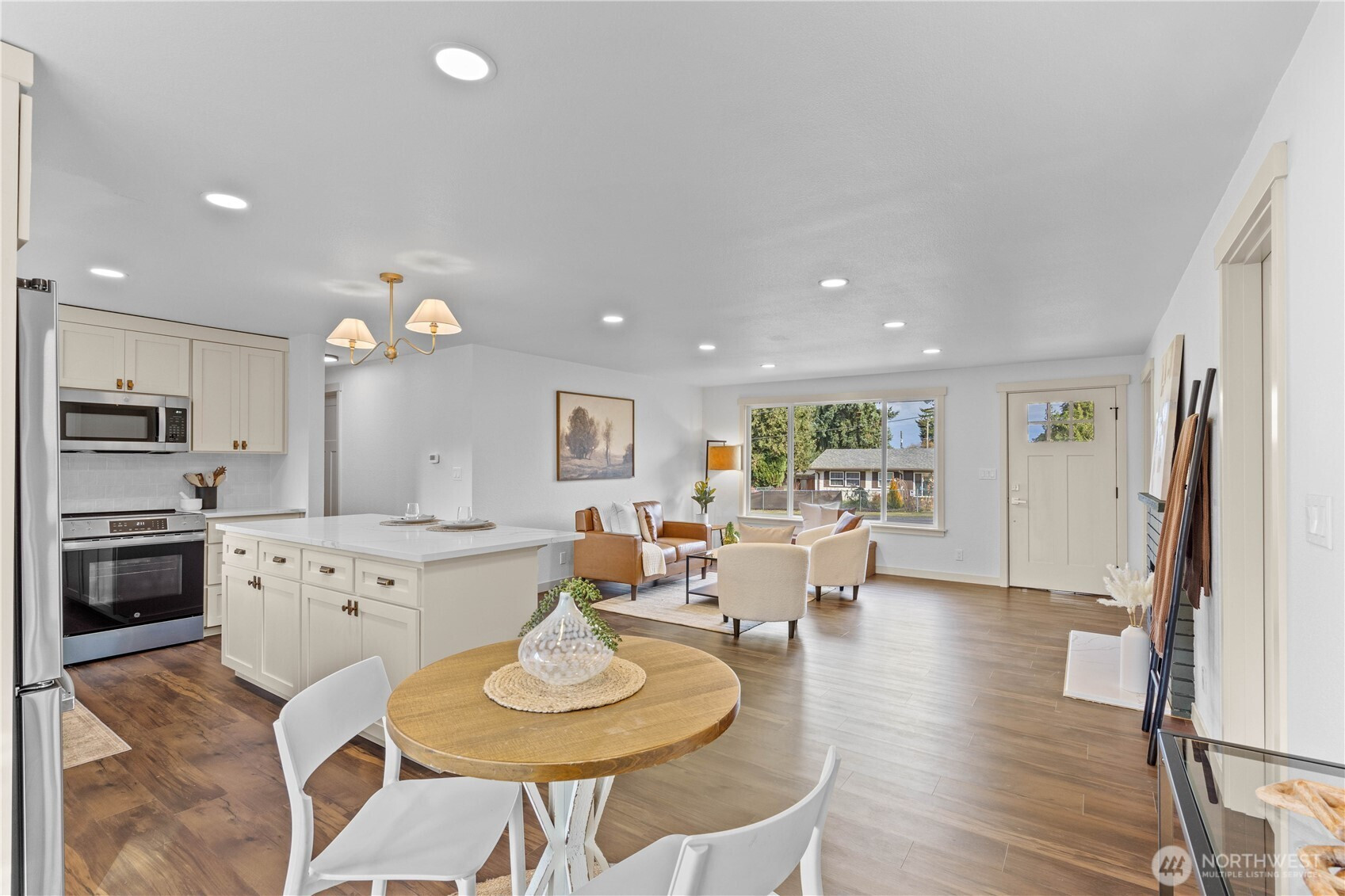 Oh so charming and ready to settle into, this beautifully refreshed 4 bedroom, 2 bath home blends cozy charm with upbeat personality. Featuring timeless accents, warm gold finishes, and a stunning light-filled kitchen at the heart of it all. A cohesive color story carries thoughtfully throughout the home, with exterior paint reflecting the interior kitchen cabinetry, doors, and trim & complimented by pops of emerald green showcased on the front door, exterior shutters and living room brick fireplace. The layout offers both flexibility and privacy, with one side functioning as a peaceful primary suite retreat. Three sliding glass doors create seamless indoor/outdoor living and open to a fully fenced backyard ready for slow mornings, summer dinners, and future garden dreams. Already home to a row of raspberries and a charming garden shed, the space invites you to grow something of your own. With fresh updates throughout, new bathrooms, and countless intentional details, this home is truly home sweet home.