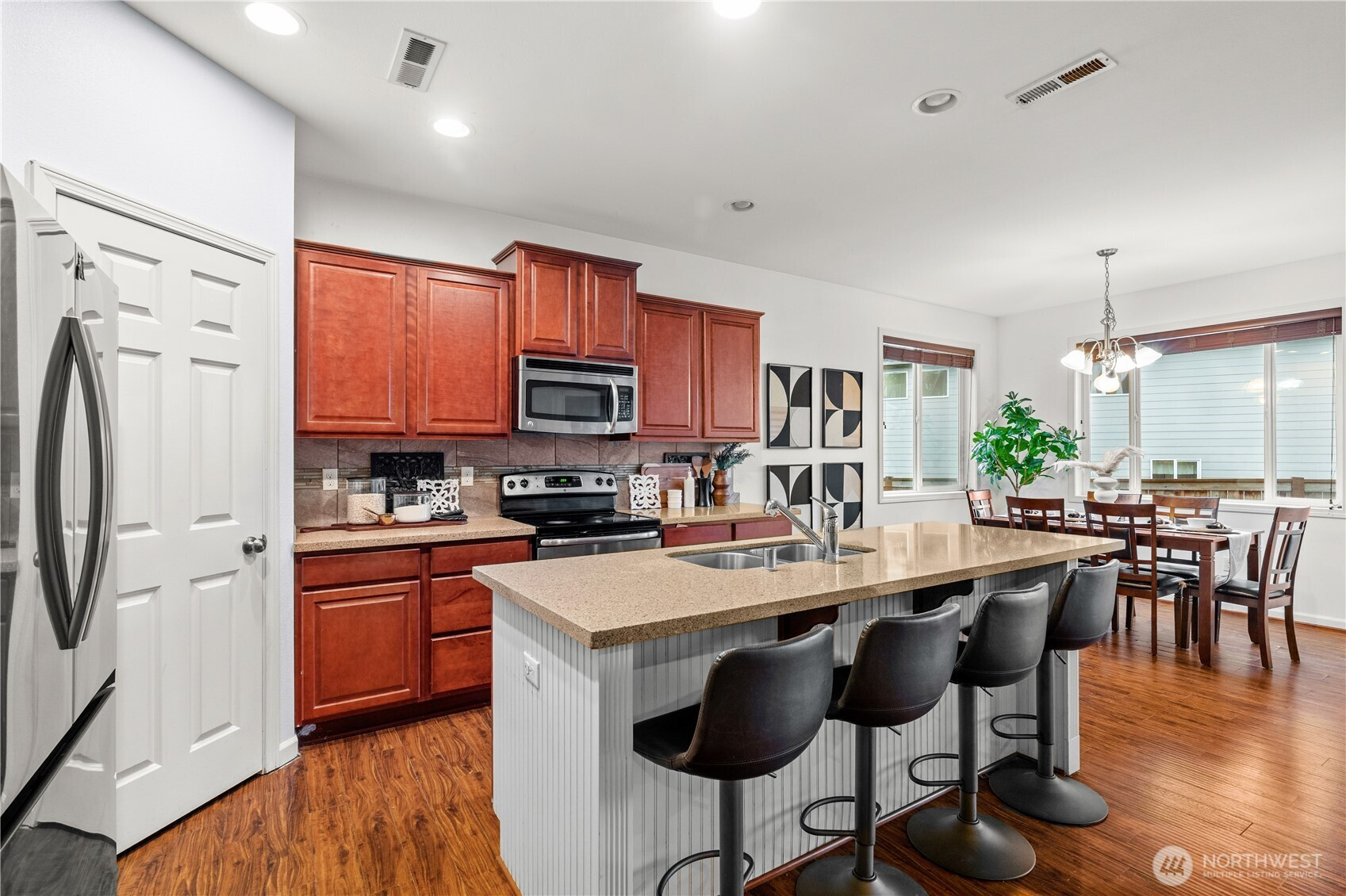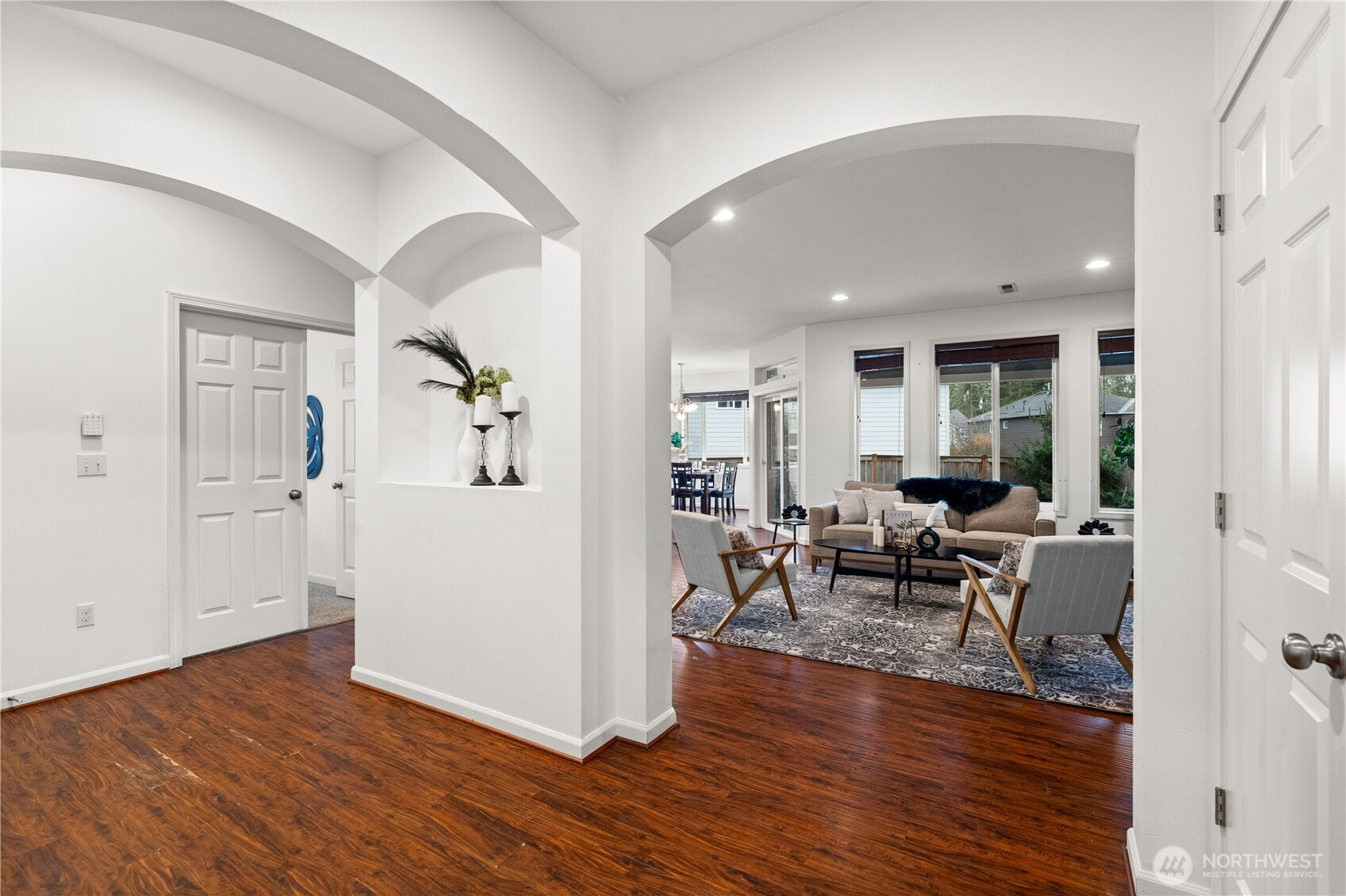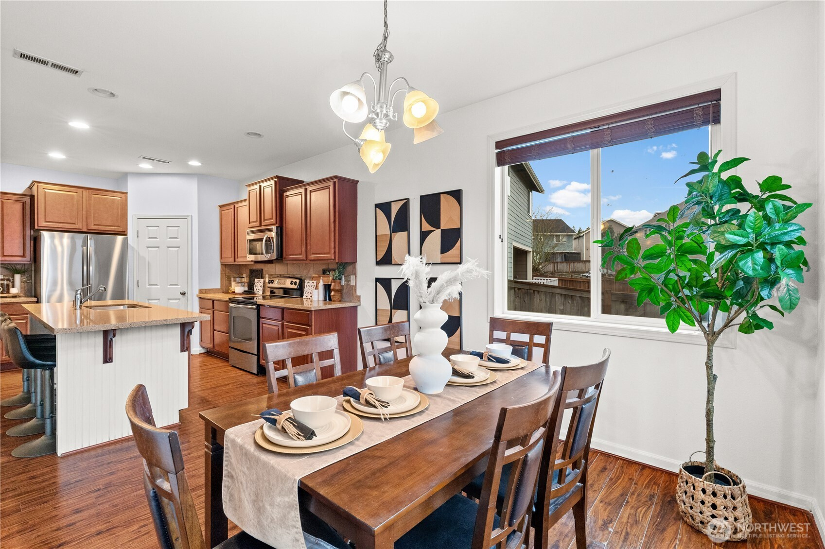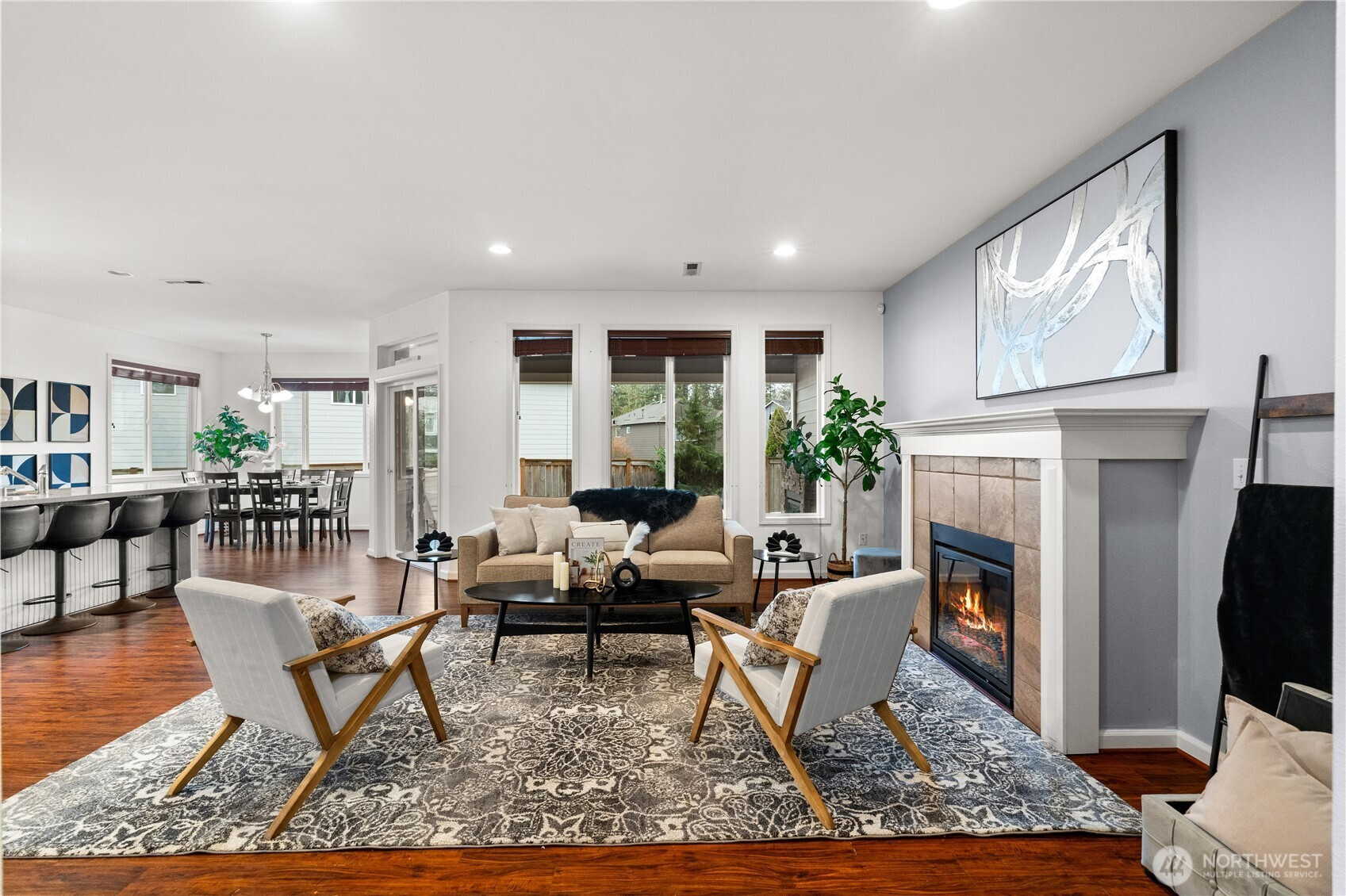 Welcome to this beautifully maintained home in the heart of Puyallup. Light-filled open-concept living features warm hardwood floors and elegant arched entryways. The spacious kitchen flows seamlessly into the dining and living areas, perfect for entertaining. Enjoy the indoor fireplace or relax year-round on the covered patio with outdoor fireplace. Flexible upstairs space ideal for a home office or bonus room. Fully fenced, low-maintenance yard and conveniently located near schools, parks, shopping, and commuting routes. Move-in ready.