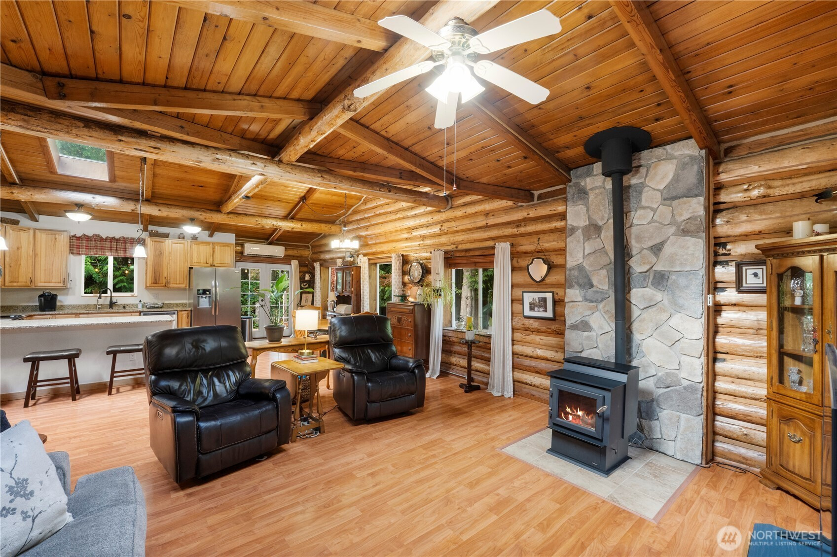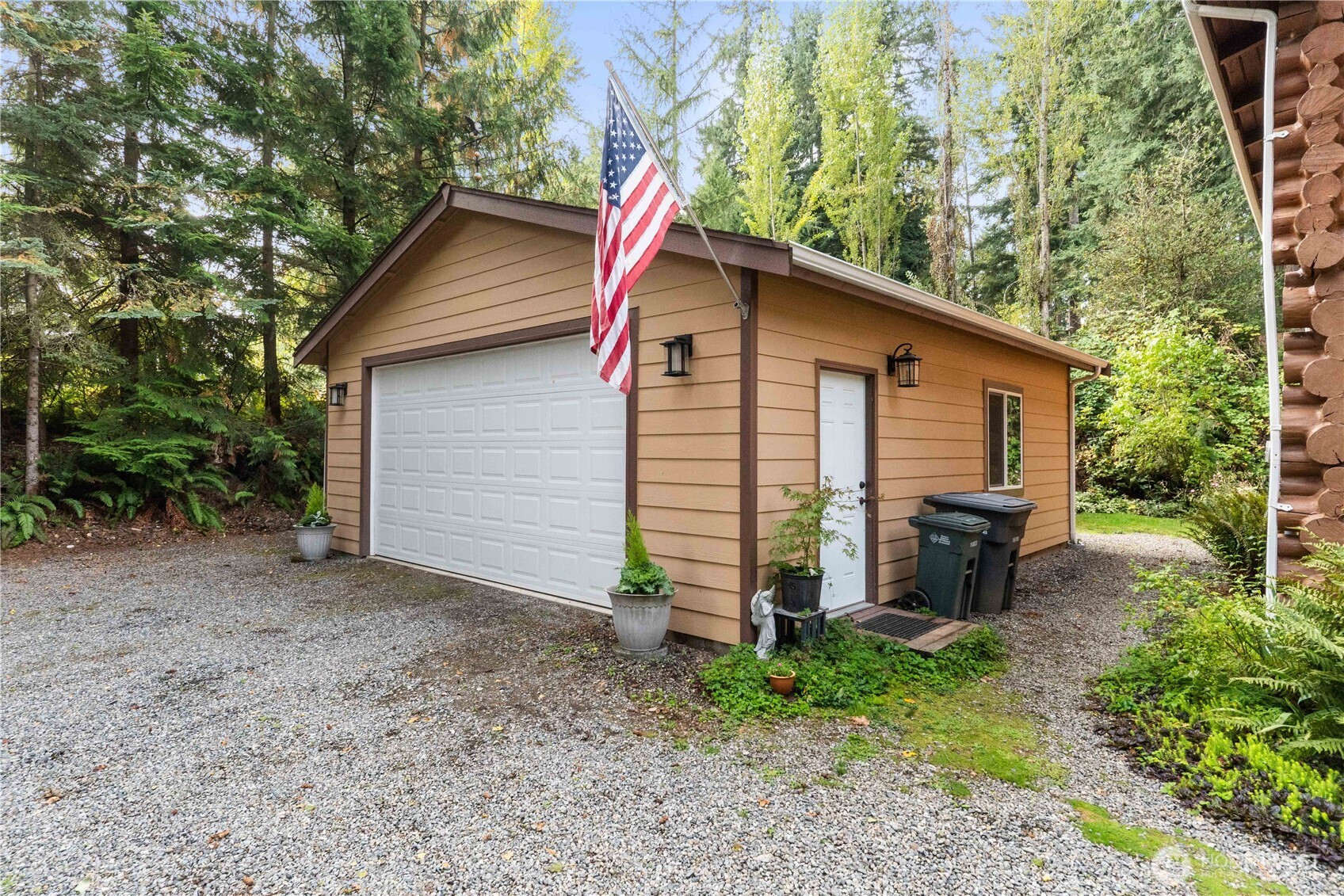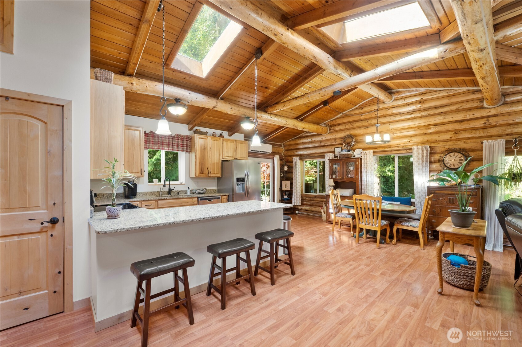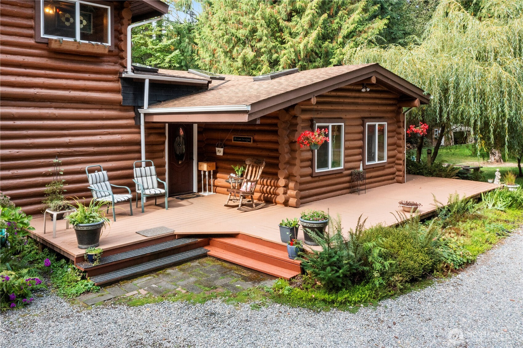 Situated on 2.4 secluded wooded acres, stunning 2-story log home totally remodeled offers the perfect blend of rustic charm & modern comfort. Featuring 3 bdrms, 2.25 baths, the home welcomes you w/vaulted ceilings, skylights & beautiful French doors. Main Floor Primary Bdrm Enjoy year-round comfort w/efficient mini-split heating & cooling, plus the warmth of a pellet stove. Entertain or relax on the expansive wrap-around deck, perfect for soaking in the peaceful surroundings. Detached garage offers storage & best of all, no HOA! Even w/its private, wooded setting, you're just minutes from shopping, schools, dining, & freeways. This is PNW living at its finest—privacy, nature, & timeless log home charm w/everyday convenience close by.